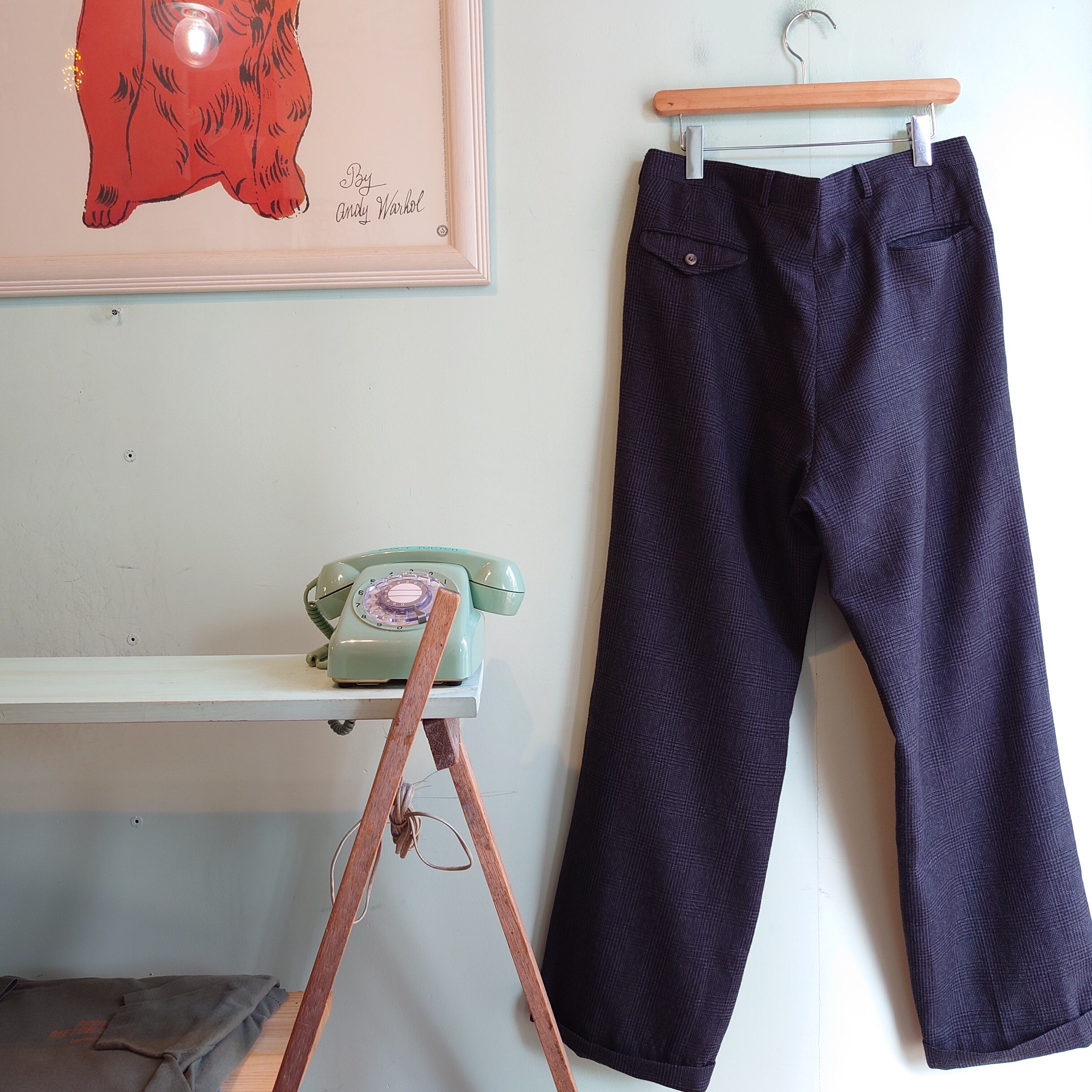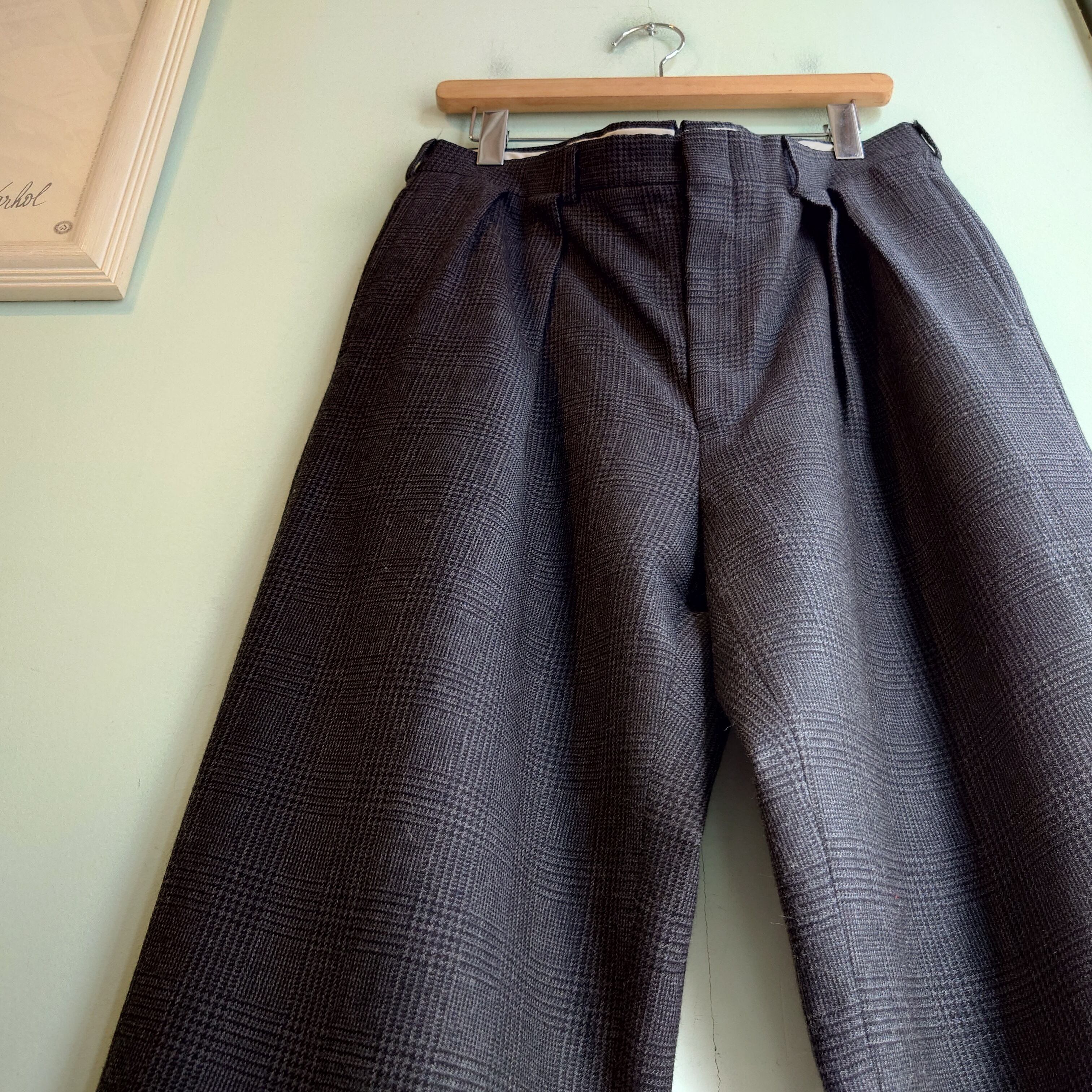これぞ秋冬的なウール系素材と、ダークなガンクラブチェックがトラッドなオールドスラックス。ツータックの太めな腰回りから、ストンと太めに落ちるワイドなシルエットも抜群。ウール系ながら、スラックスらしいひらひら感も程よくある厚さで、履きやすさも抜群の一本。