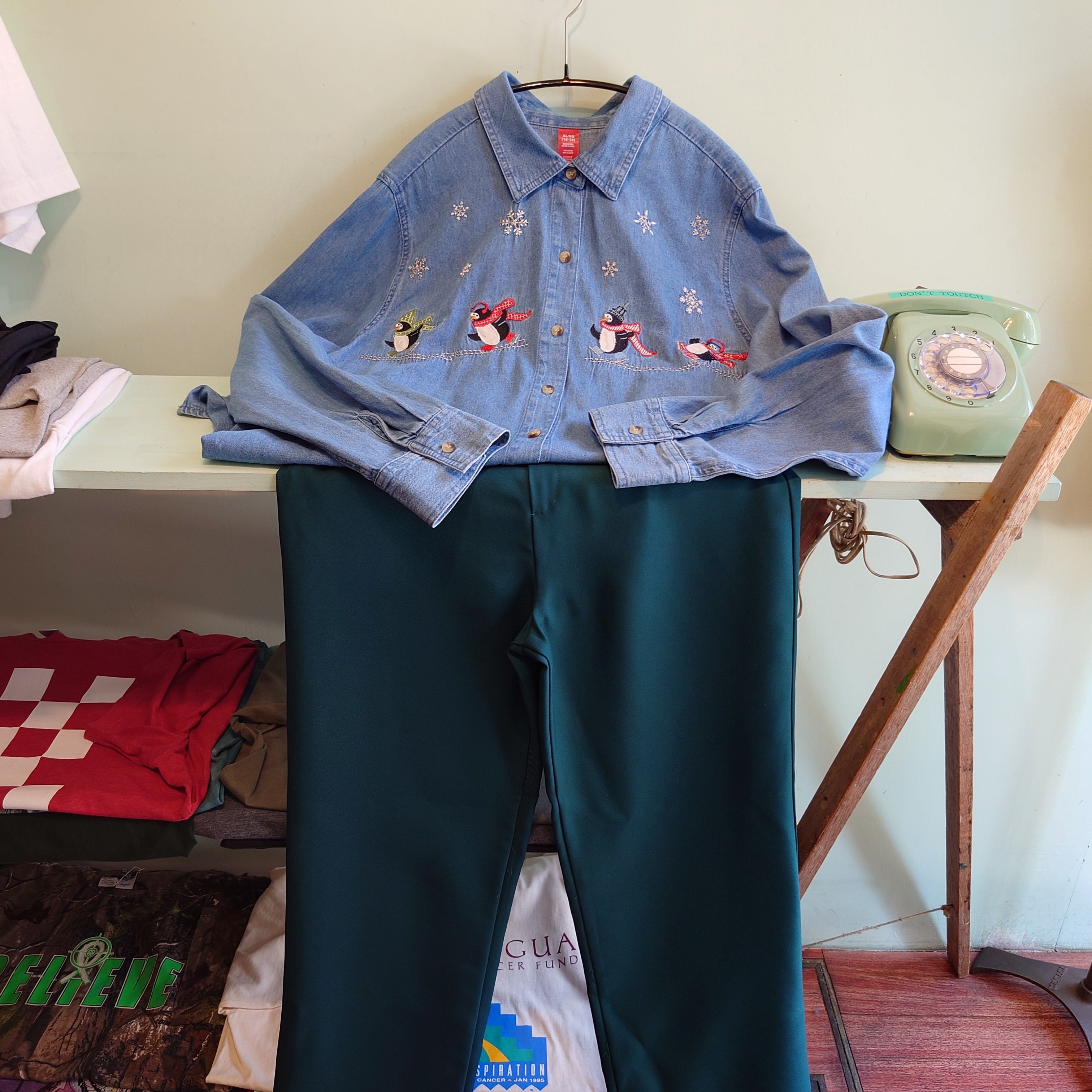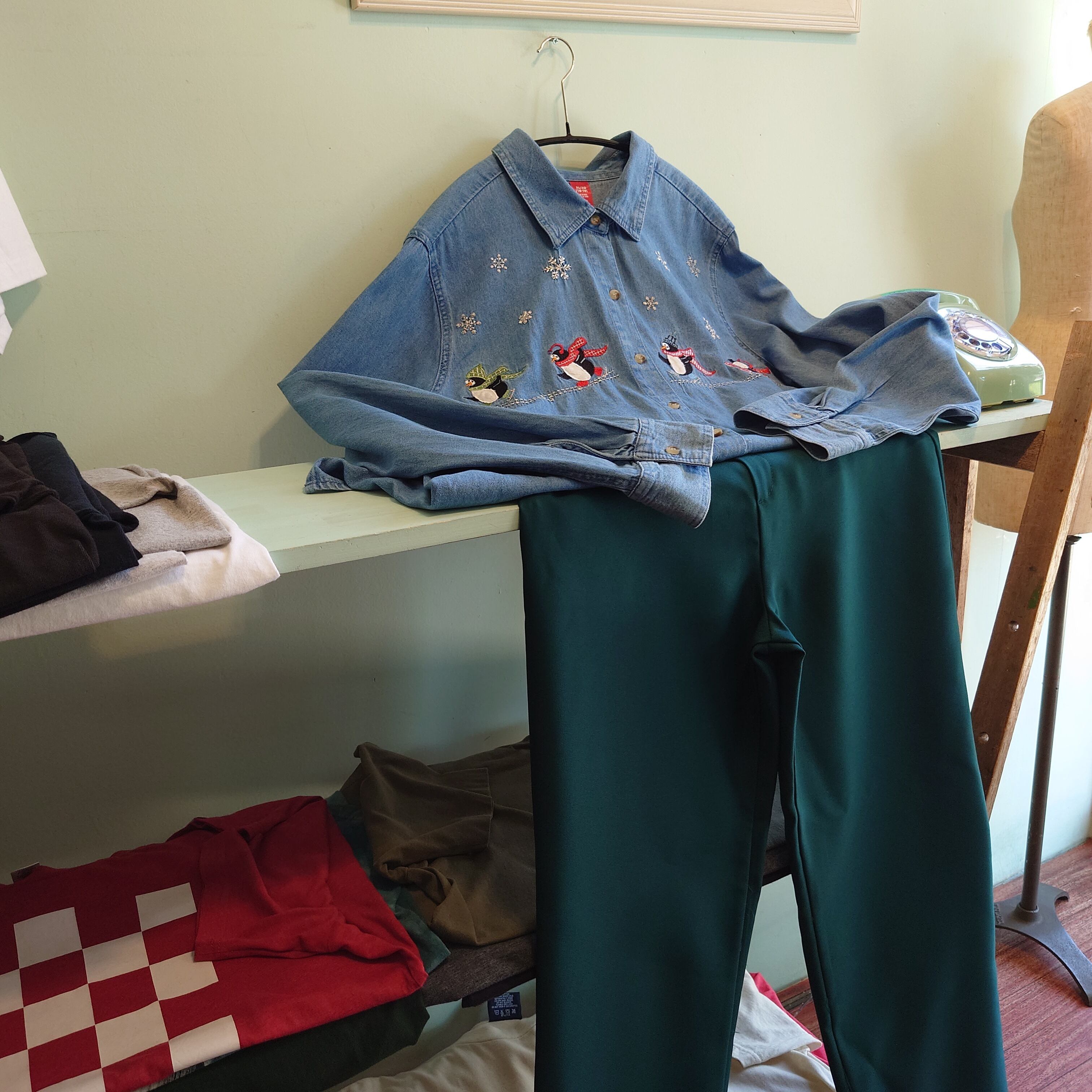 00s デニムシャツ デコレーションシャツ ガーリーシャツ アニマル ペンギン