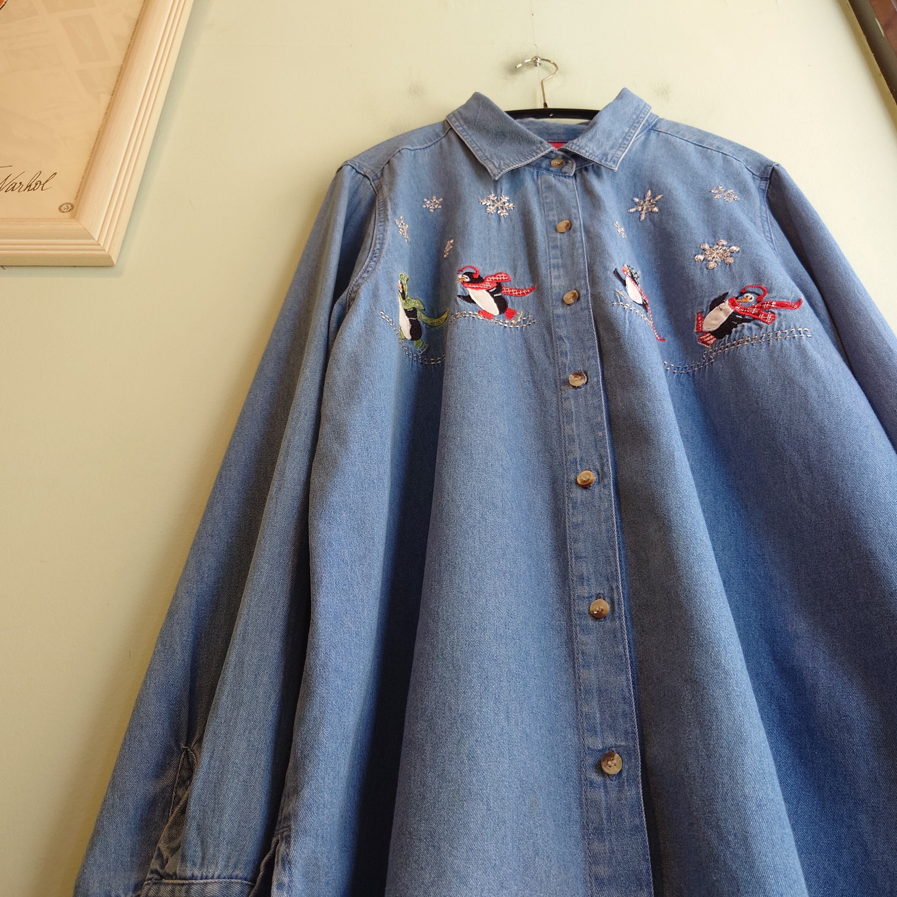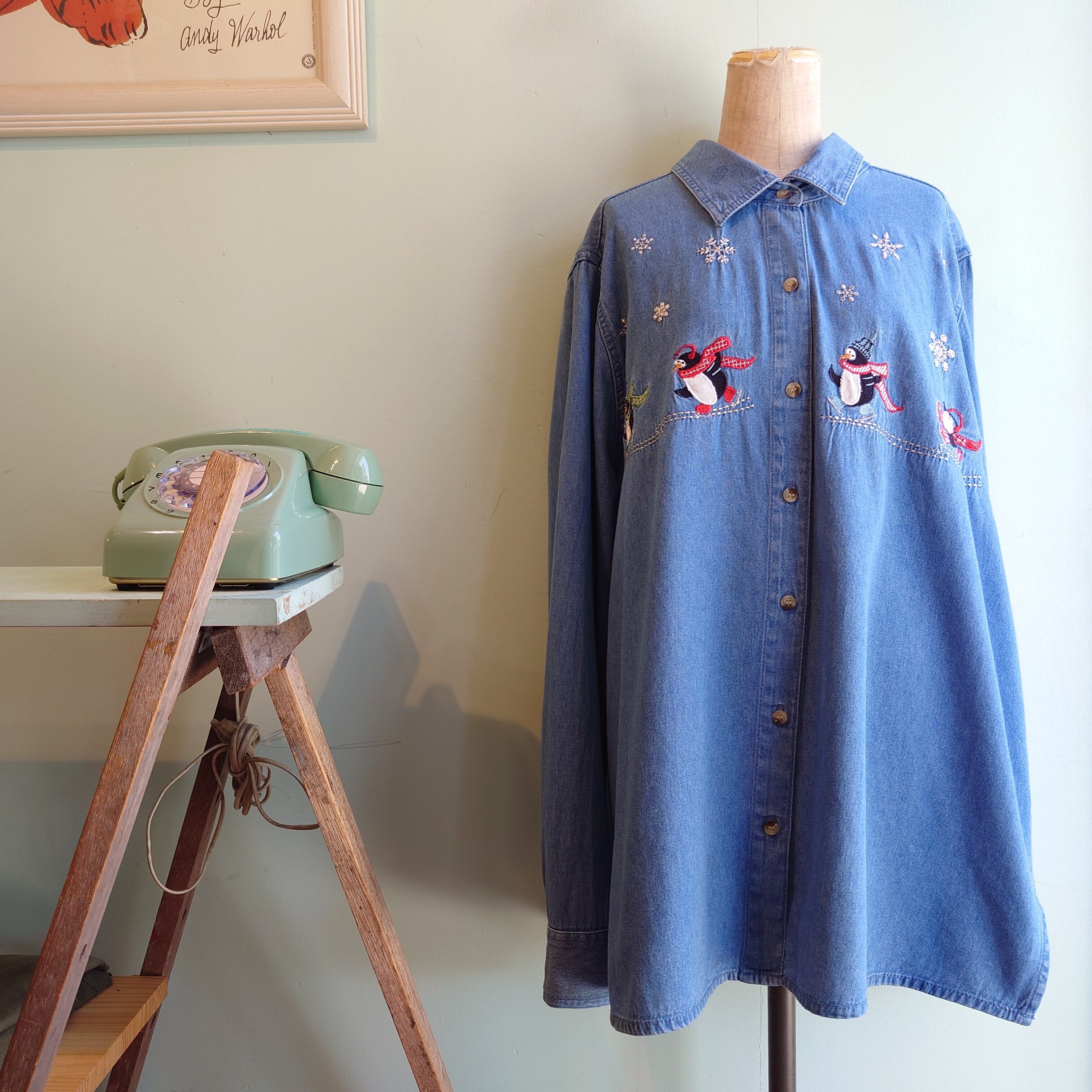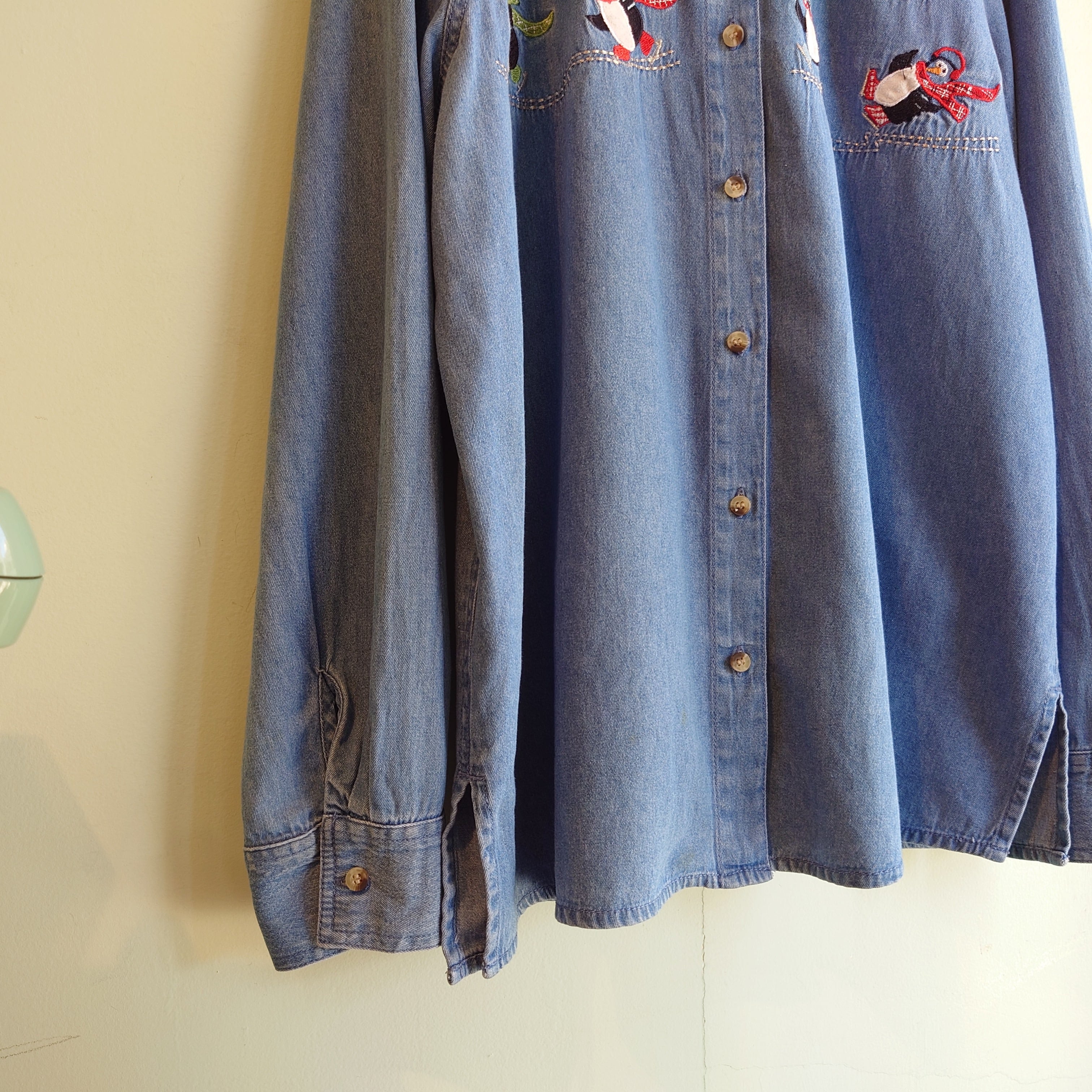 ◎00s デニムシャツ デコレーションシャツ ガーリーシャツ アニマル ペンギン