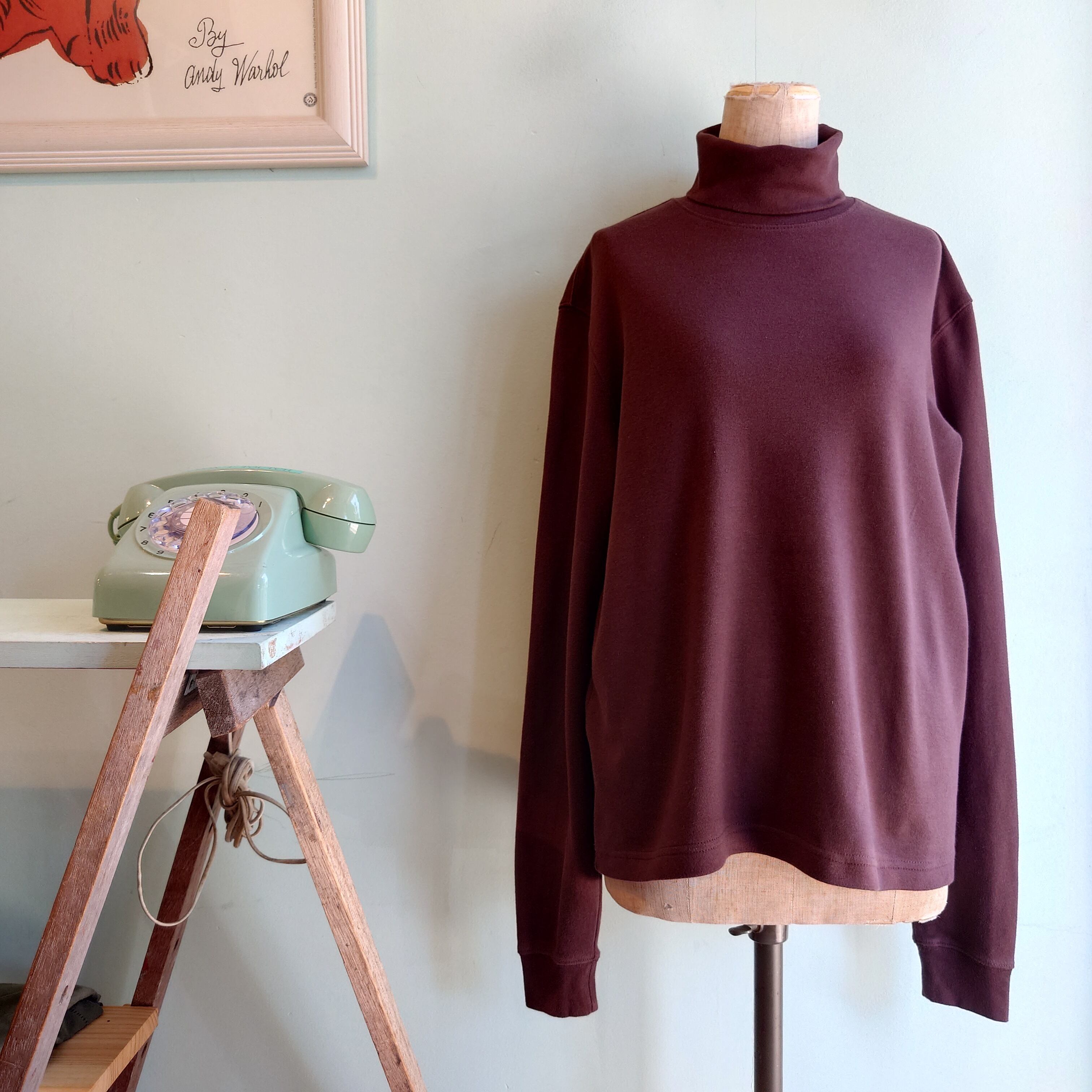 USA古着では珍しい、チョコレート色のタートルネックカットソー。素材も伸縮性ありながらしっかり感もあり、主役にしてもOK。1枚でシンプルに、シャツやアウター、スウェットなどのインナーに、あれこれ活躍する優等生。ややショートな丈感です。
