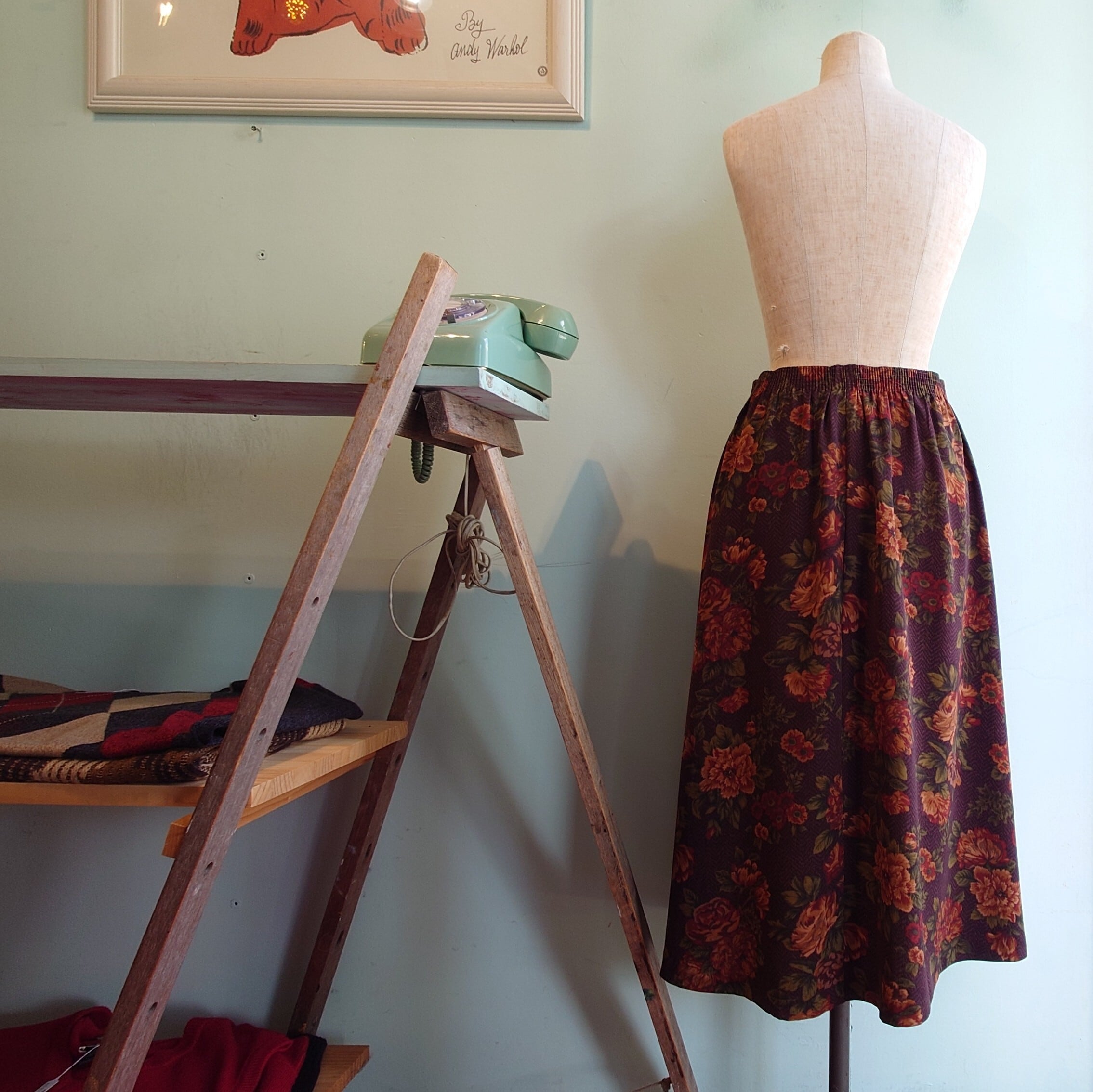 1枚で、ボトムとのレイヤードで、あれこれ使えてしっかりガーリーなイージー系のオールドスカート。ブラウン系に花柄モチーフで、あわせやすいトーンながらちょうどよい色味。古着のスカートらしいひらひら感、広がり感も良し。