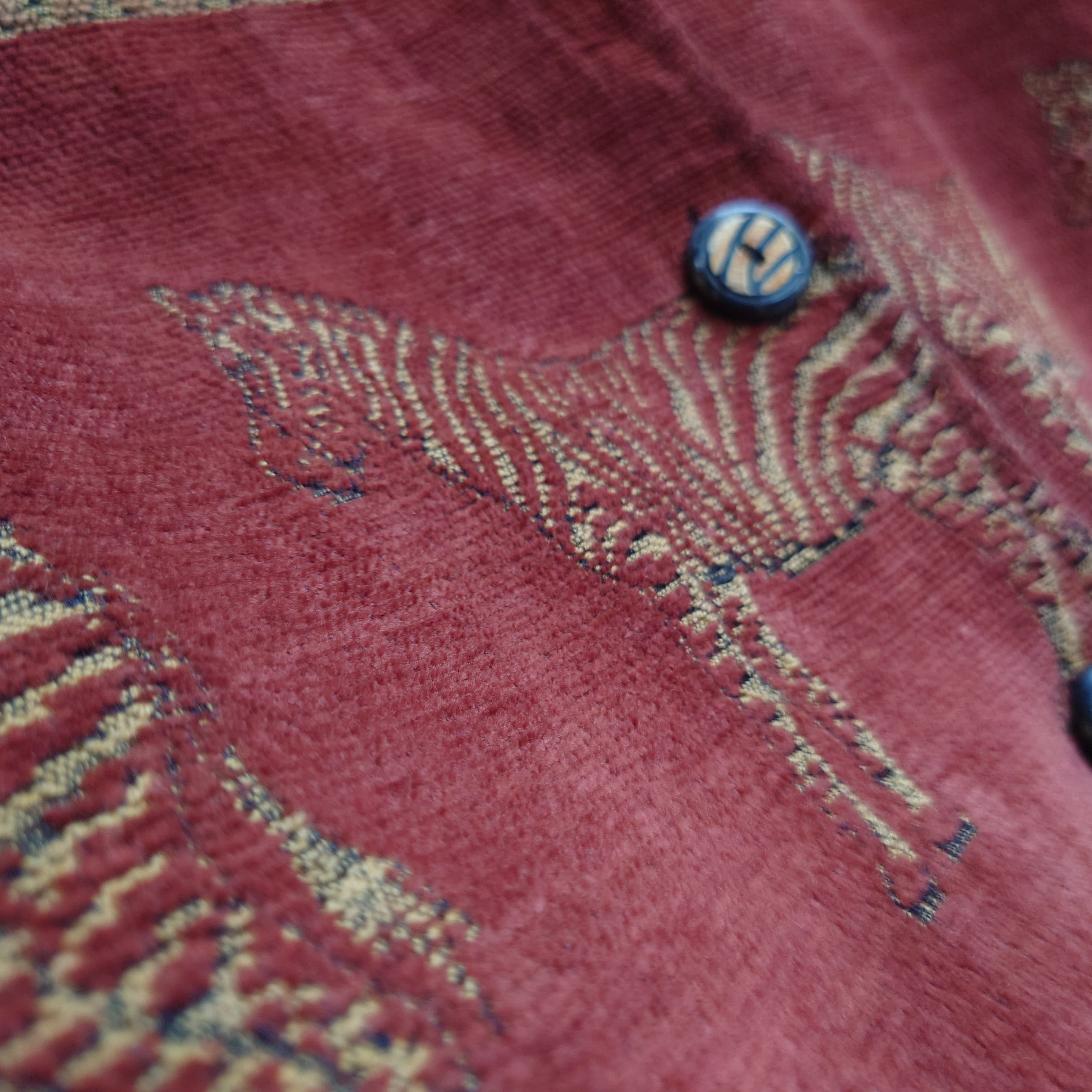 ゴブラン織りのような独特な糸目と、シマウマをモチーフにしたアニマルがかわいいチロル系のカバーオールジャケット。柄や色ごとに表情が違ったり、こだわりのボタンなど、このジャケットだけのオリジナリティーにに惹かれる。やや丈長のスウィングトップのようなシルエットで、合わせればしっかりスタイリッシュなのも素晴らしい。