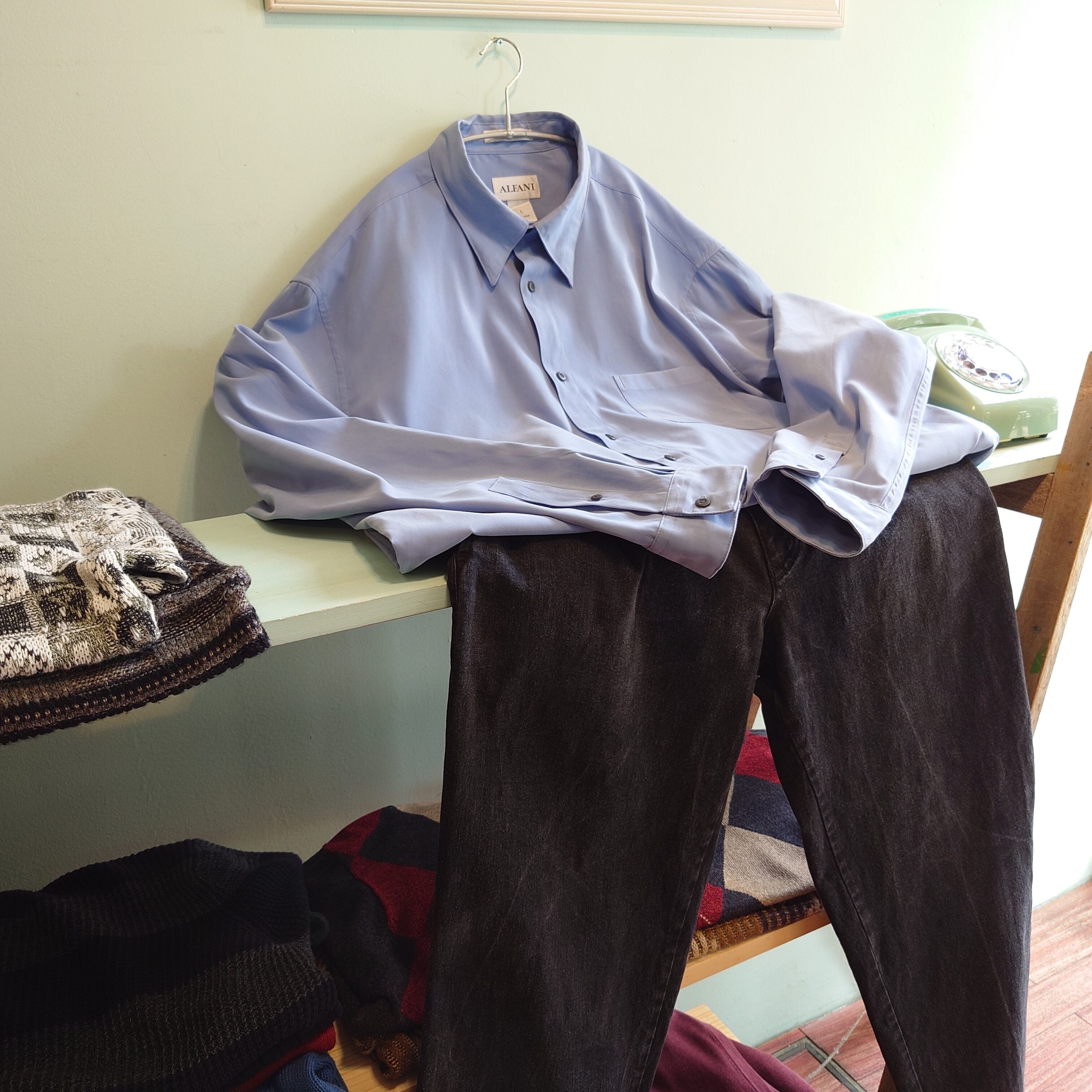 ◎ALFANI 90-00s レアカラー フェイクスウェードシャツ ドレスシャツ 青系 L