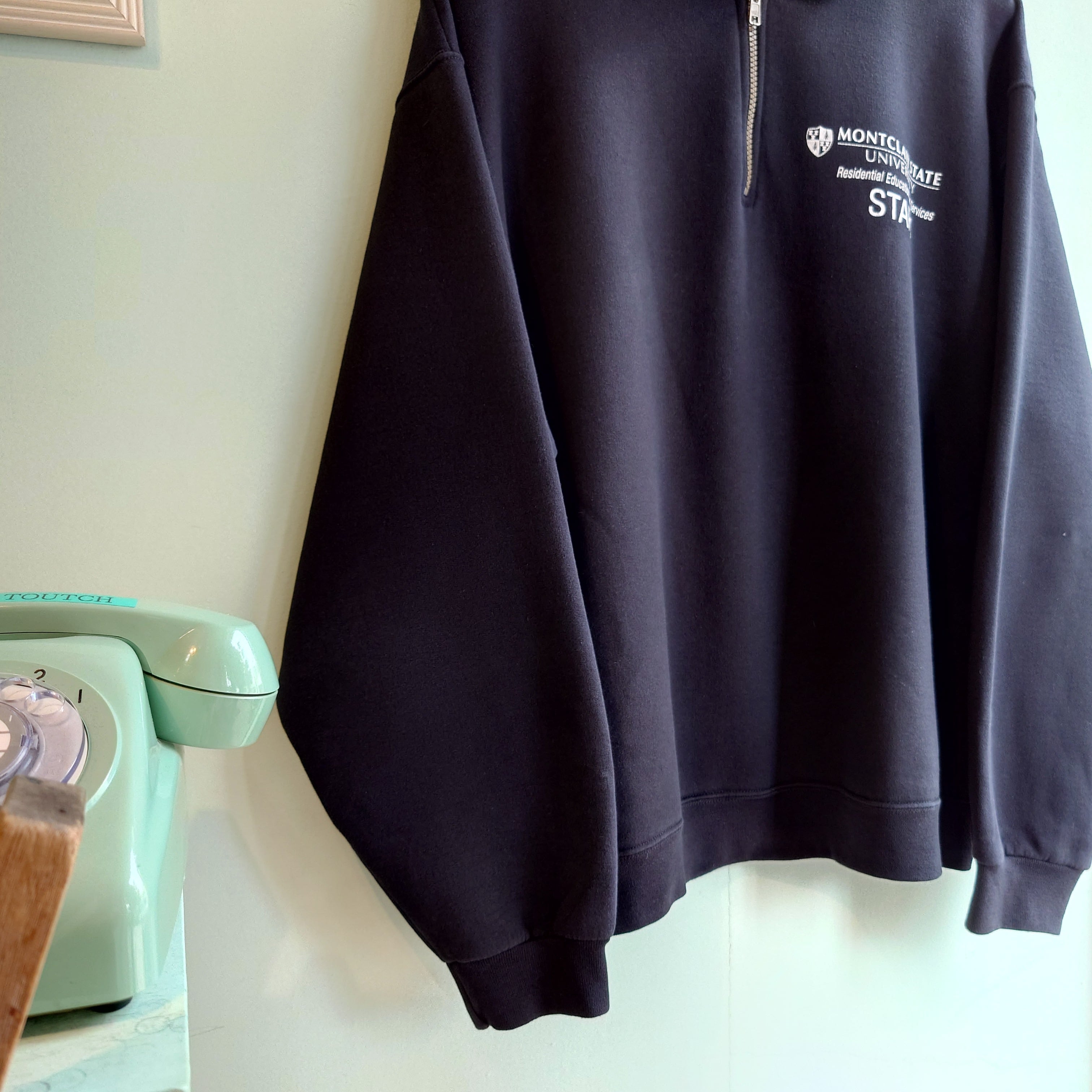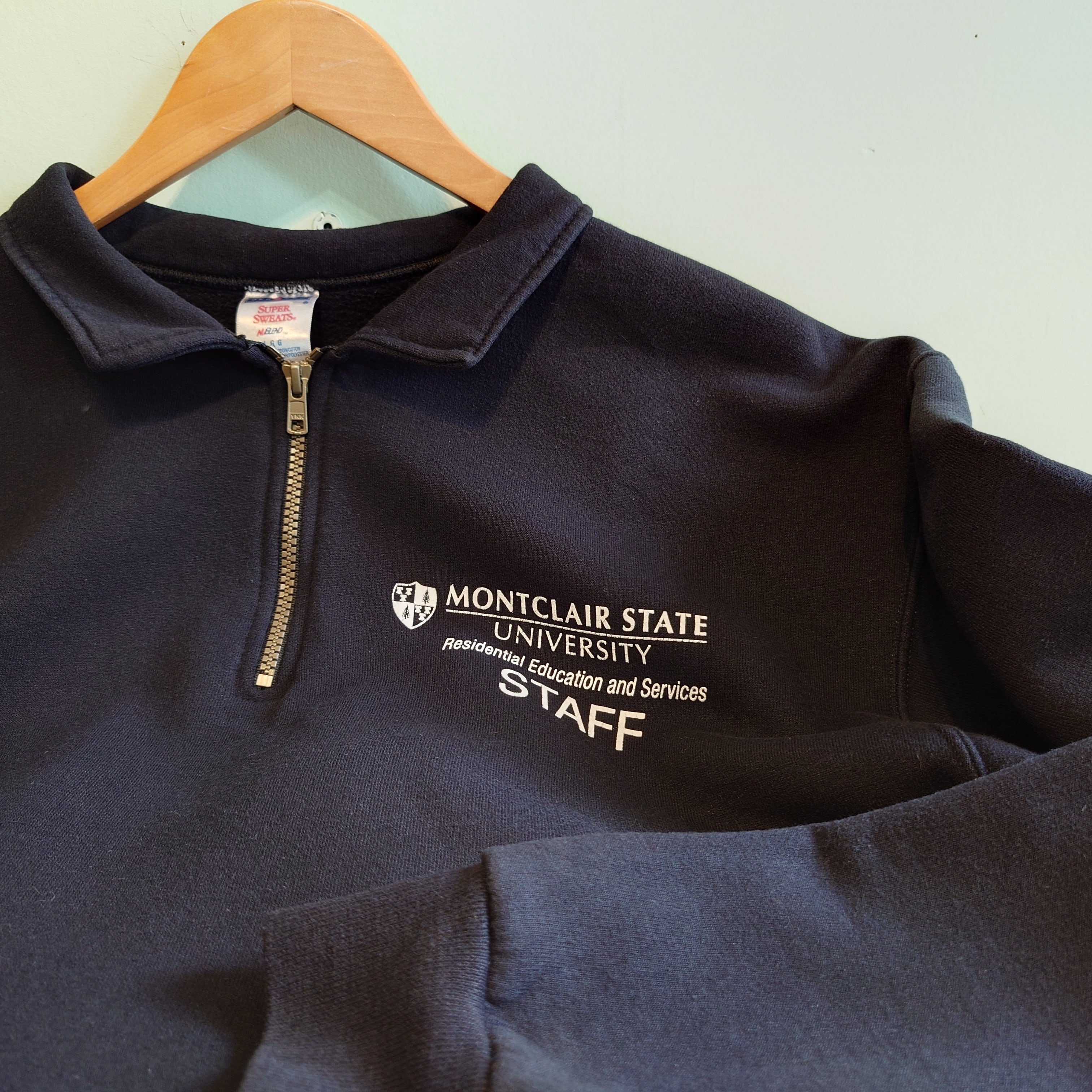 ニュージャージー州、モントクレア大学のカレッジスウェット。襟下で止まるタイプの開ければセーラー感のあるハーフジップ襟がかわいい。ワイド&ショート丈、袖周りのボリューム感がかわいいグッドシルエット。カレッジ系ながらコンパクトなプリントもセンスあり。