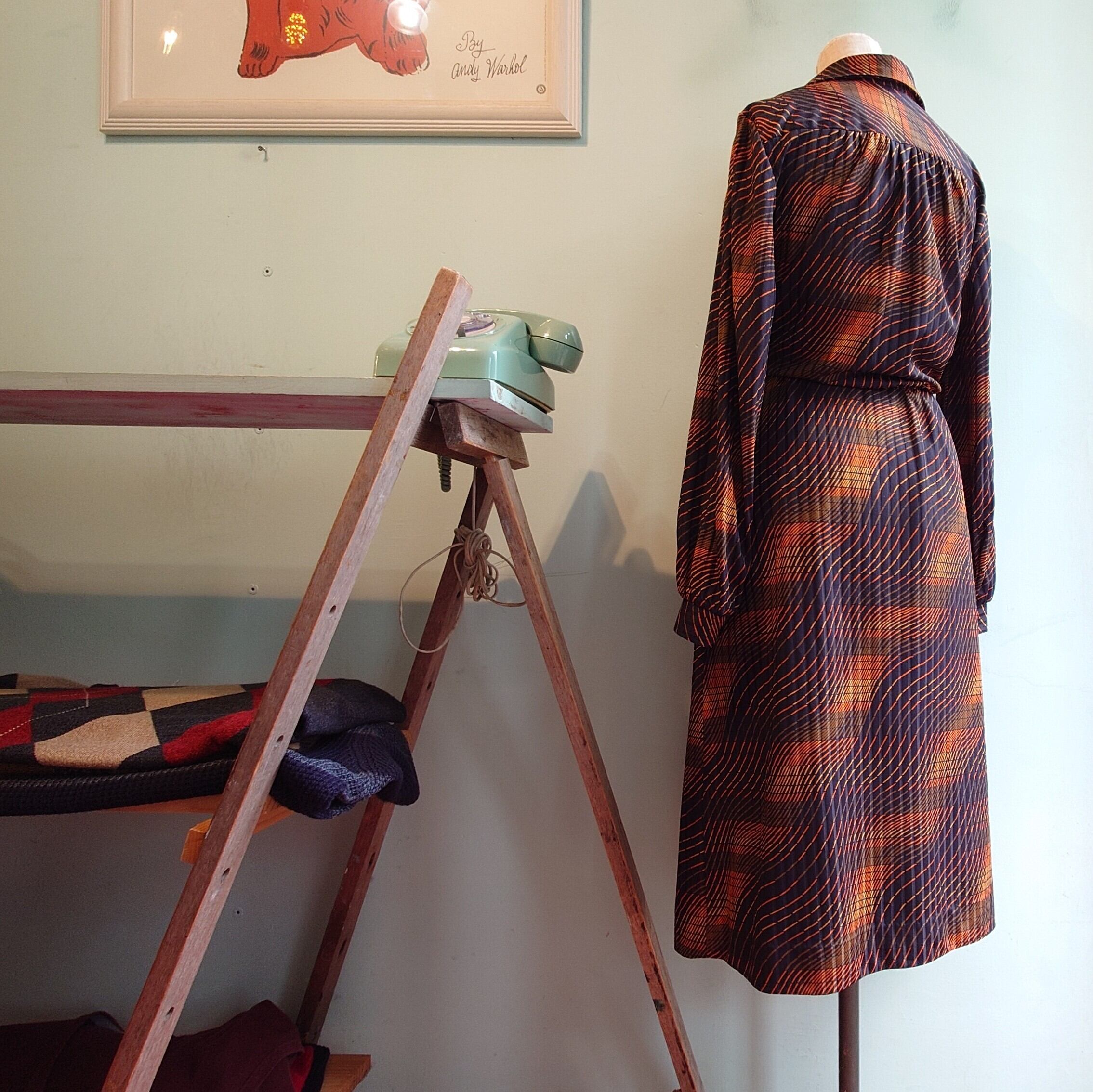 ユーロ系の総柄ワンピース。70年代風のセーラーのようなVネック、スタプレよりも柔らかで柄シャツのような生地が気持ちいい。波形とボーダー、ストライプが透かしで組み合わされて、テキスタイルアートのような美しさ。ストンとしたAラインで着てよし、付属の紐でぎゅっとウエストマークするのもかわいい。