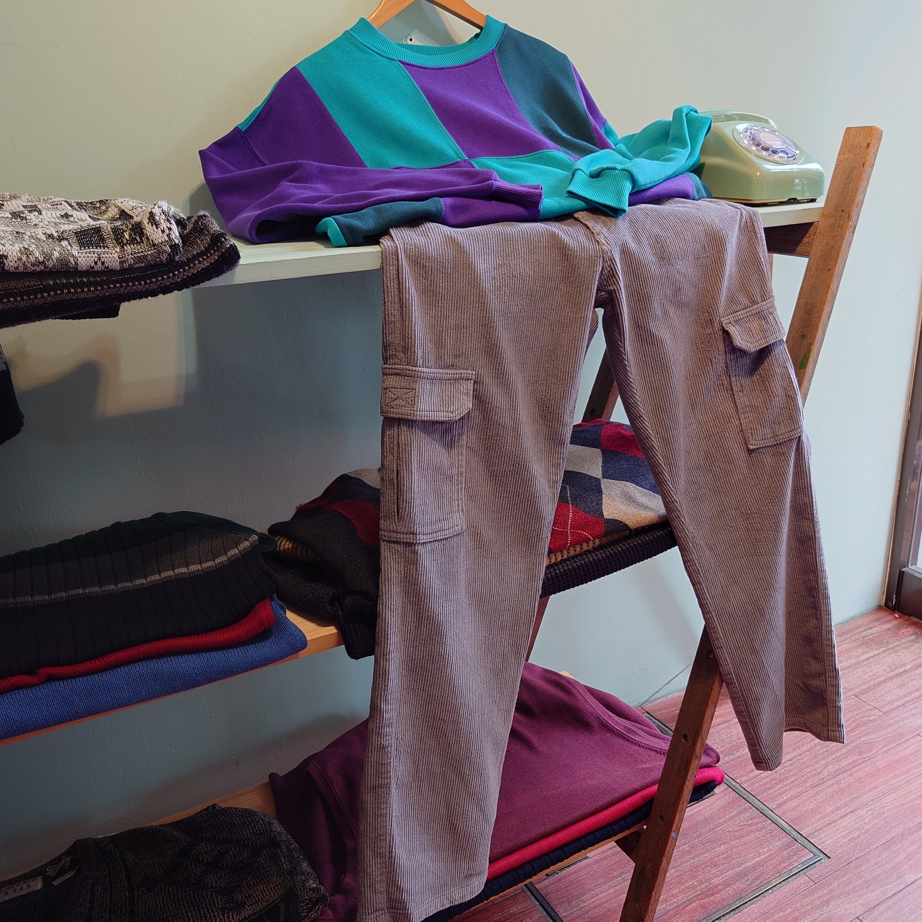 5ポケットパンツのコーデュロイパンツに、カーゴポケットとサイドゴムをドッキングしたレア系ボトム。サイドエラスティックタイプで、イージーパンツ的な雰囲気も。しっかりした太畝コーデュロイながらラフな雰囲気が◎。女子にもおすすめなサイズ感となります。