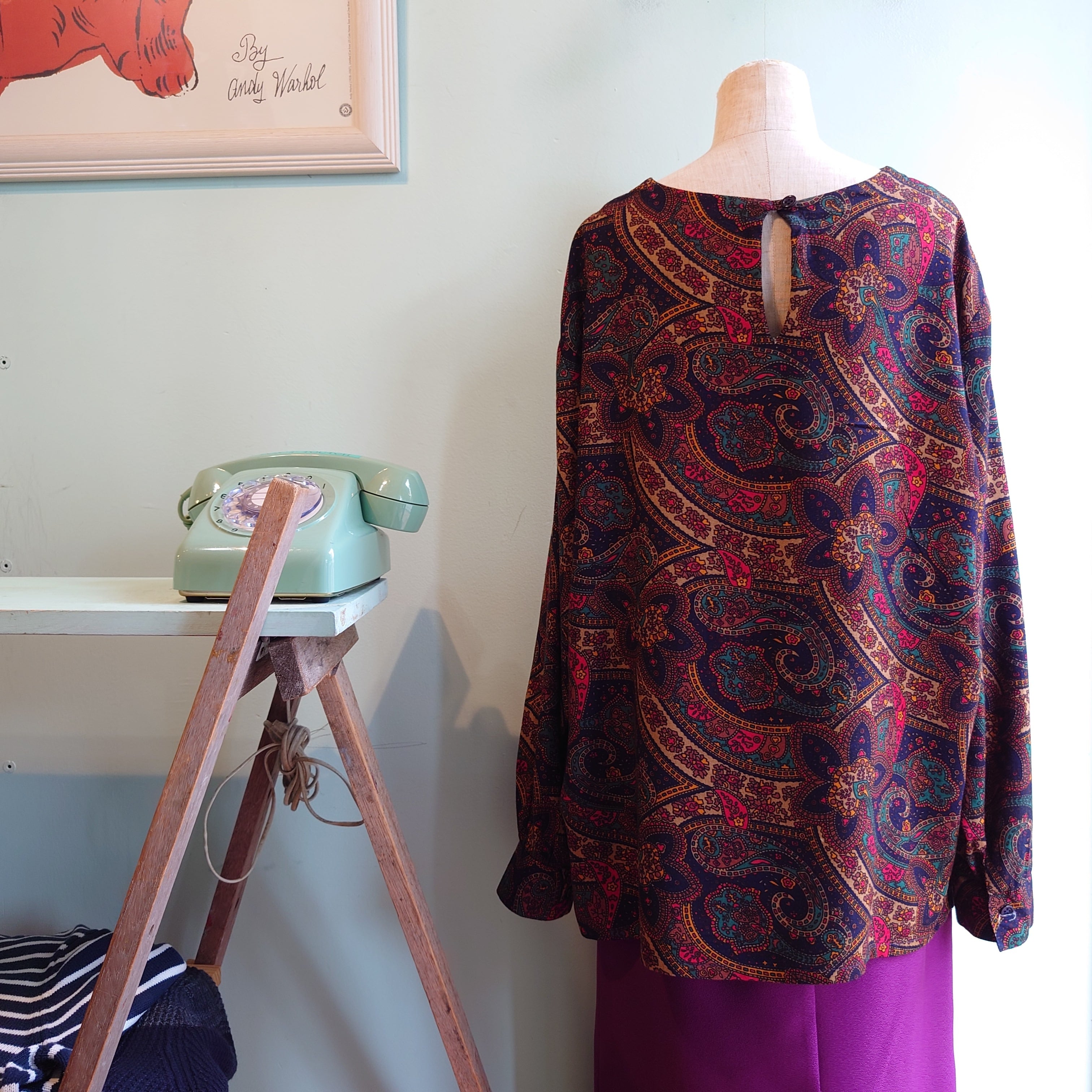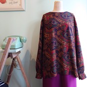 フロントボタン無しでカットソーのようにかぶれて、しっかりひらひらレーヨンがドレッシーなプルオーバーブラウス。赤と緑、紺が絶妙にまとまったスカーフのようなペイズリー。柄シャツ好きも納得のテロっとしたレーヨンも◎。