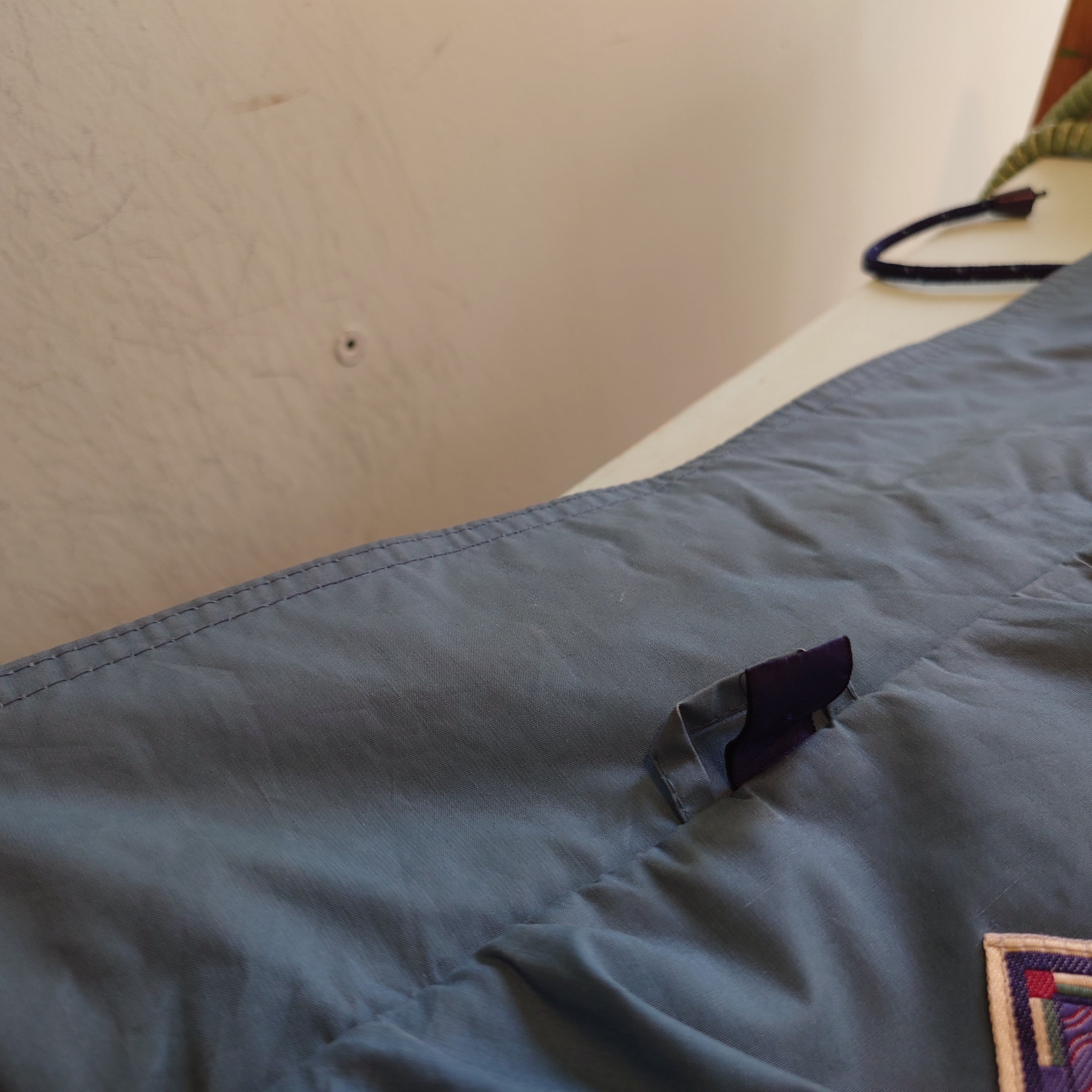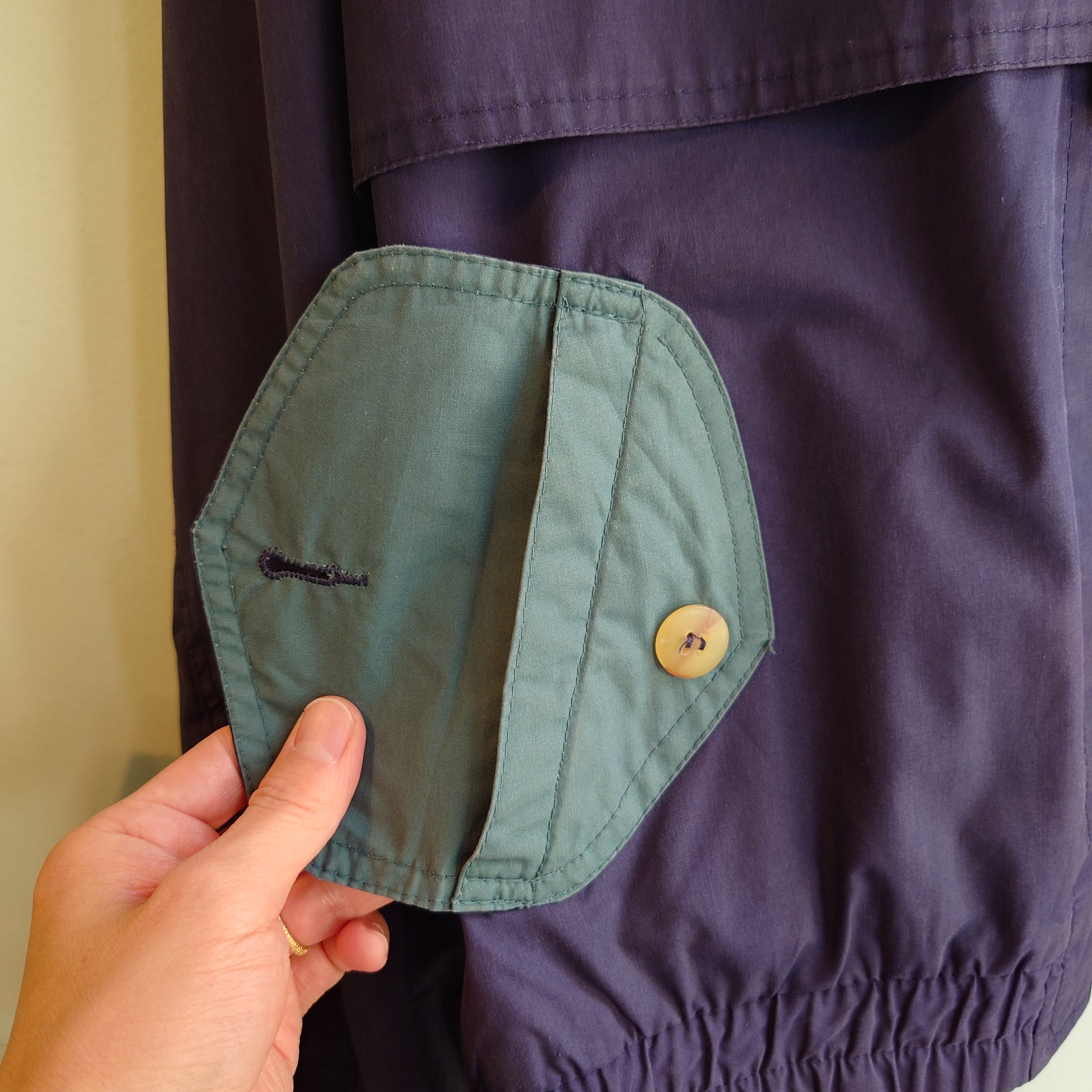 褪せたネイビー×グリーンのマルチカラーに惹かれるGEAR社のスポーツジャケット。襟やポケット周りはダブル仕立てとマルチカラー、前後のマント風デザインで、立体感のある作りがかっこいい。一般的なスウィングトップのシンプルさよりも、オリジナリティーが際立ったジャケットです。