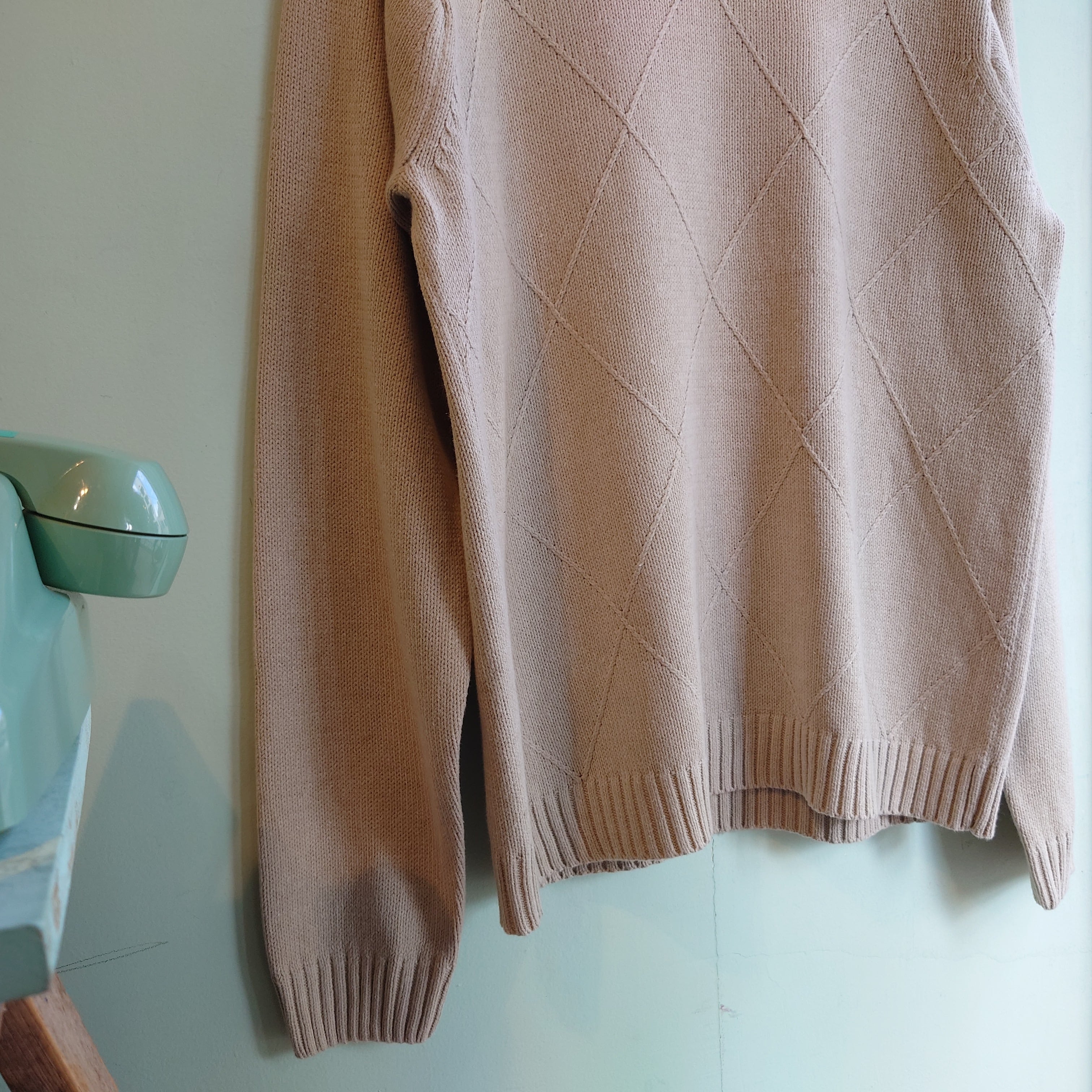 オフホワイト/ベージュのナチュラル系コットンニット。ワントーンでアーガイル柄が入ったデザイン系、織り目の凸凹と柄のラインがほんのり主張するハイセンスな一枚。癖のないシンプルで古着らしいシルエットと、スウェット感覚でかぶれて肌触り良好な一枚。