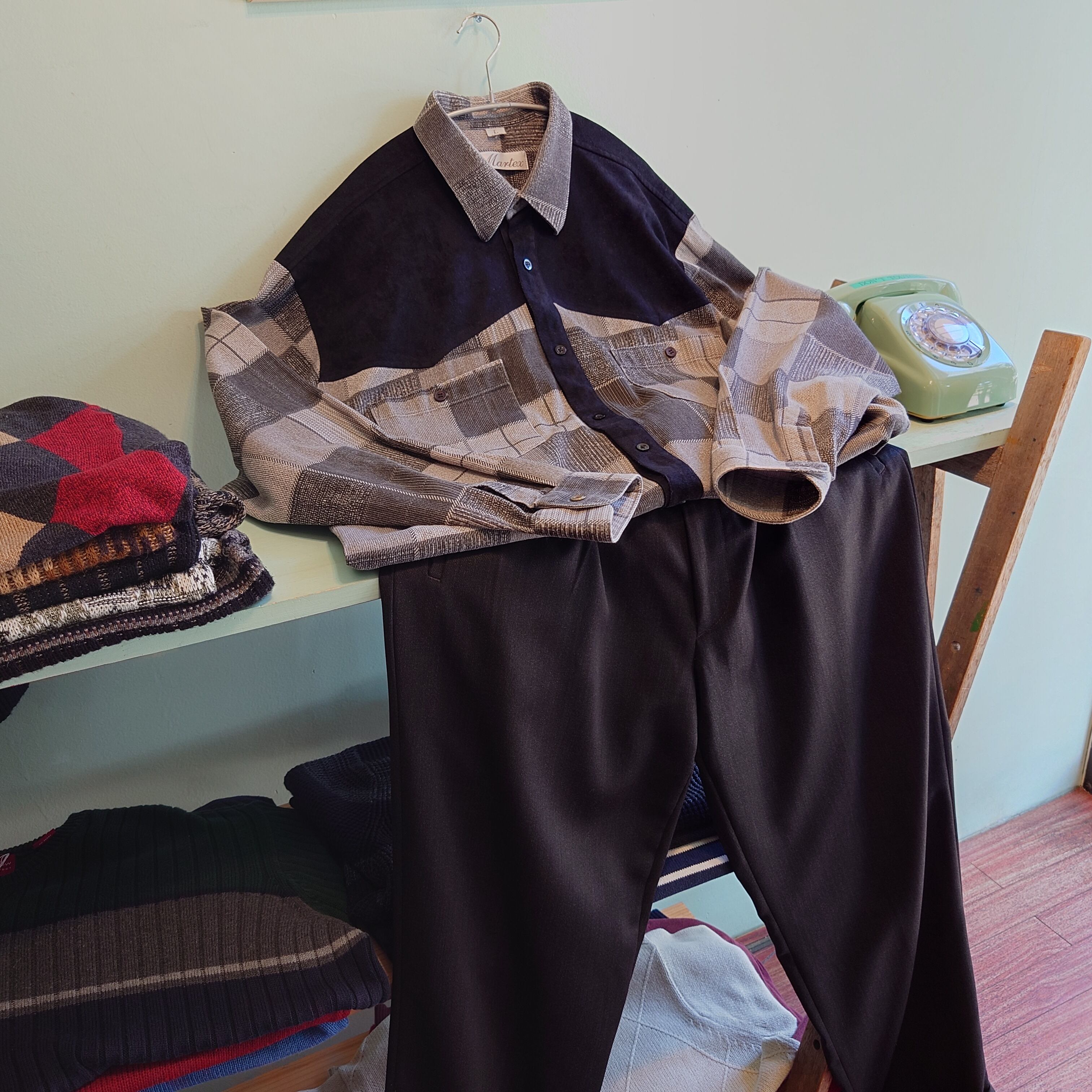 かぶらないデザインが魅力的なユーロ系のドレスシャツ。ほんのりとコーデュロイのような畝が付いたコットン系異素材と、ベロアの切り替えが他にはないカッコよさ。ダークトーンのクールさの中に、独特なポップネスが魅力的。