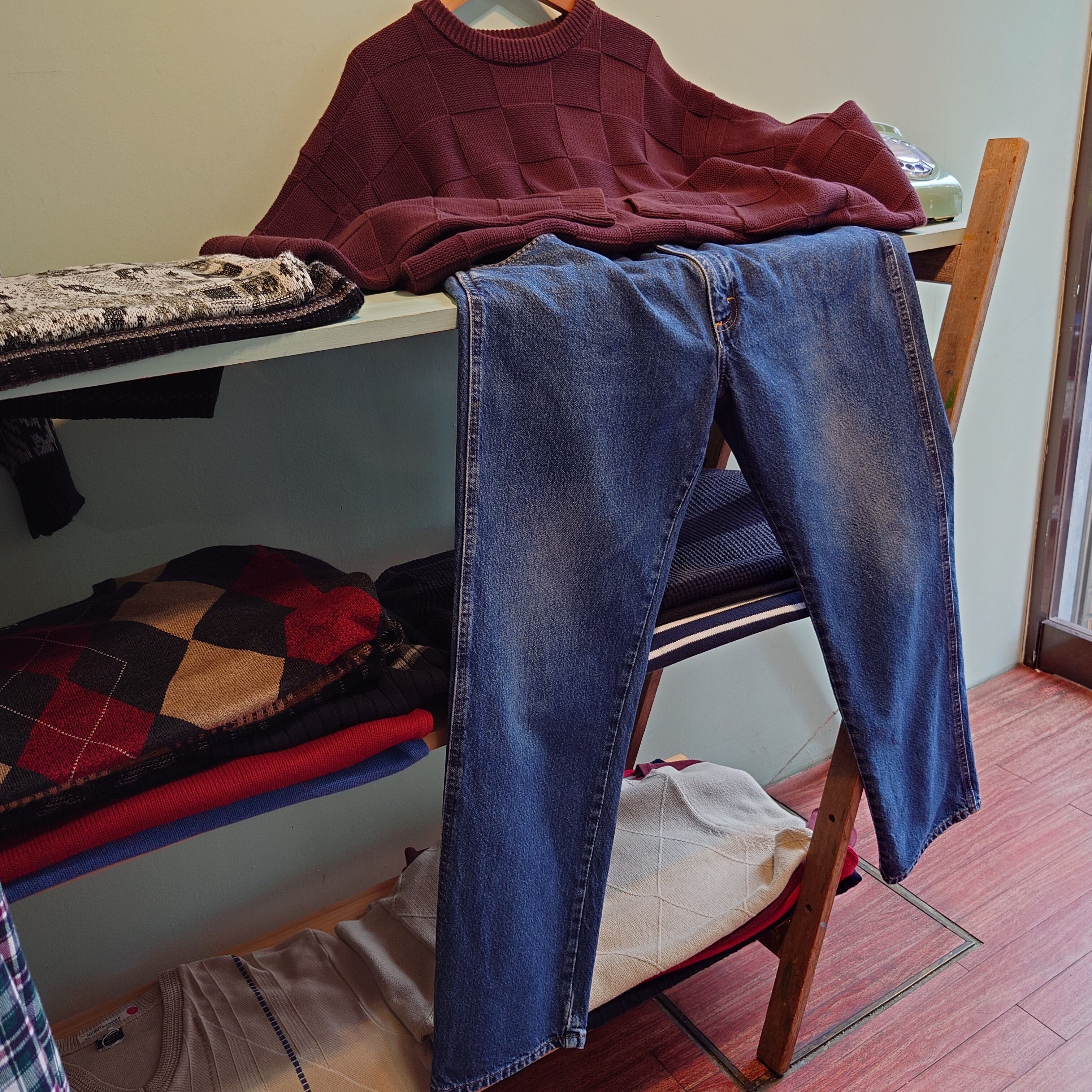 ラングラーのブルージーンズ。ストレートをベースにテーパードの丸みと、ワークパンツ譲りの無骨さをMIXした、ほんのり緩めなシルエットが最高。両サイドにしっかりしたステッチがあり、よりストンとした印象をプラス。トップは緩めでもジャストでも◎、何気ないけど履けば手放せなくなる当店ロングセラーです。