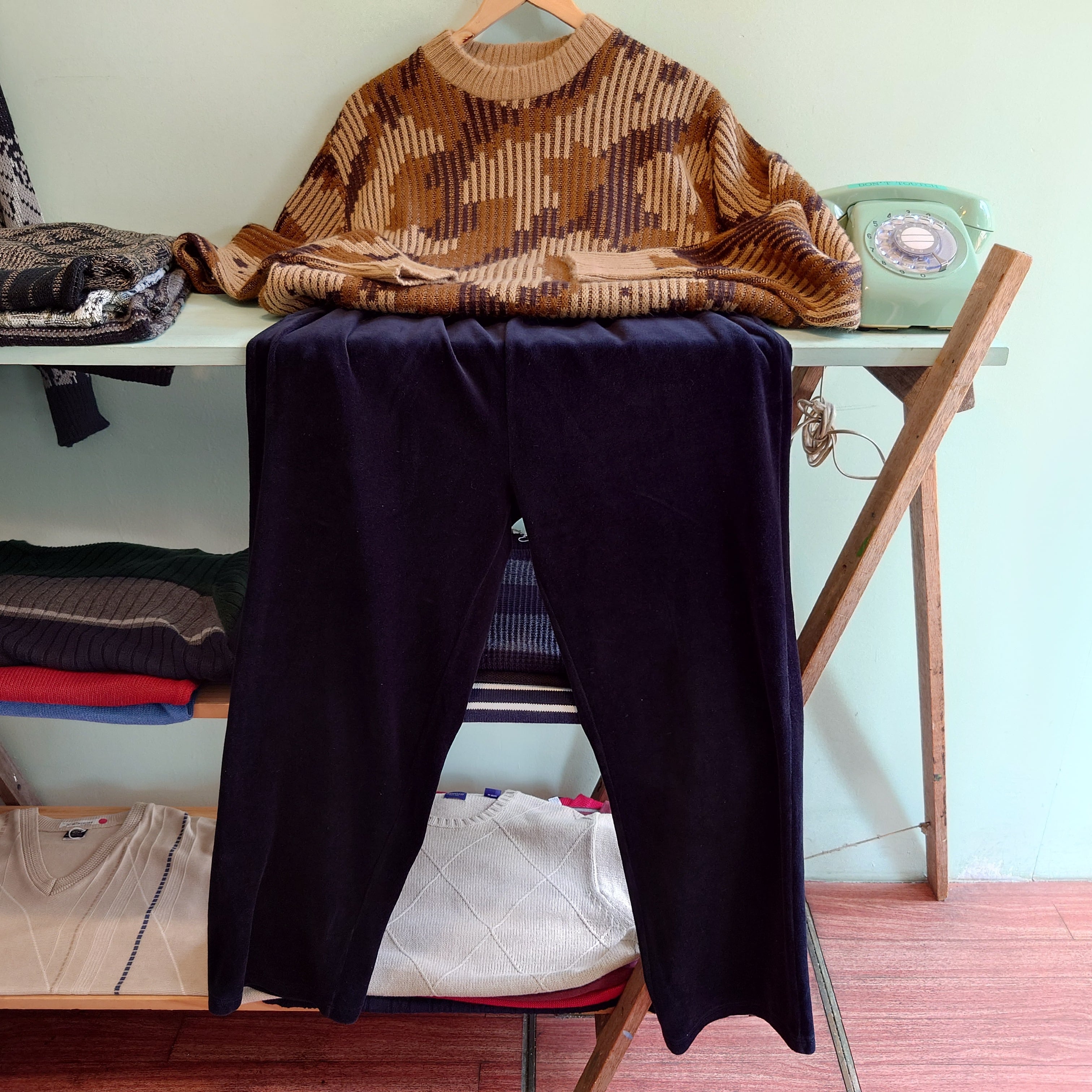 合わせやすい黒のイージーパンツの中でも、特にベルベットな風合いが印象的なベロアパンツ。ゆるっとしたテーパードと、モフッとアニマルライクな生地が◎。ウエスト周りに付いた縦のステッチと、ポケット周りは、レトロなジャージのようなディテール。