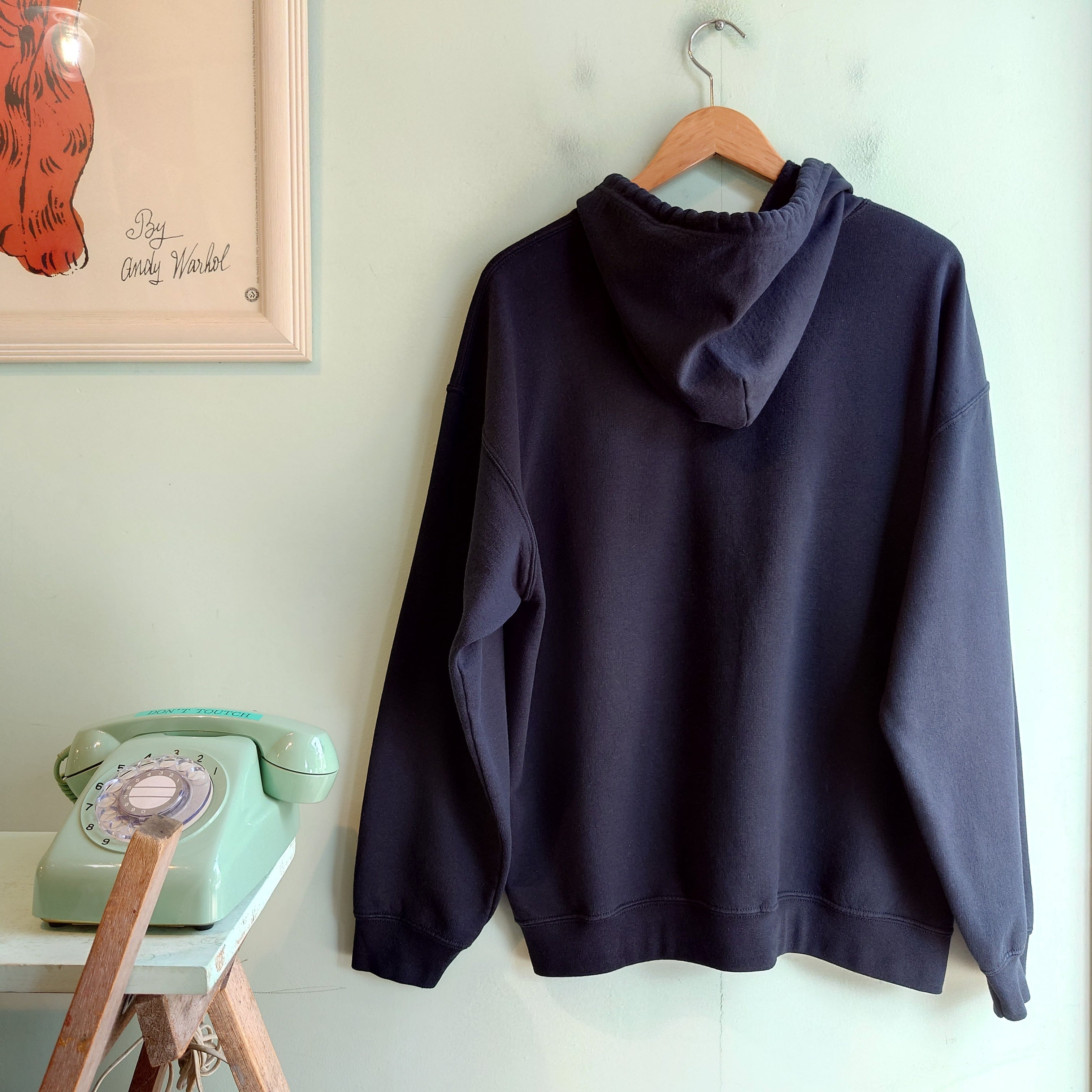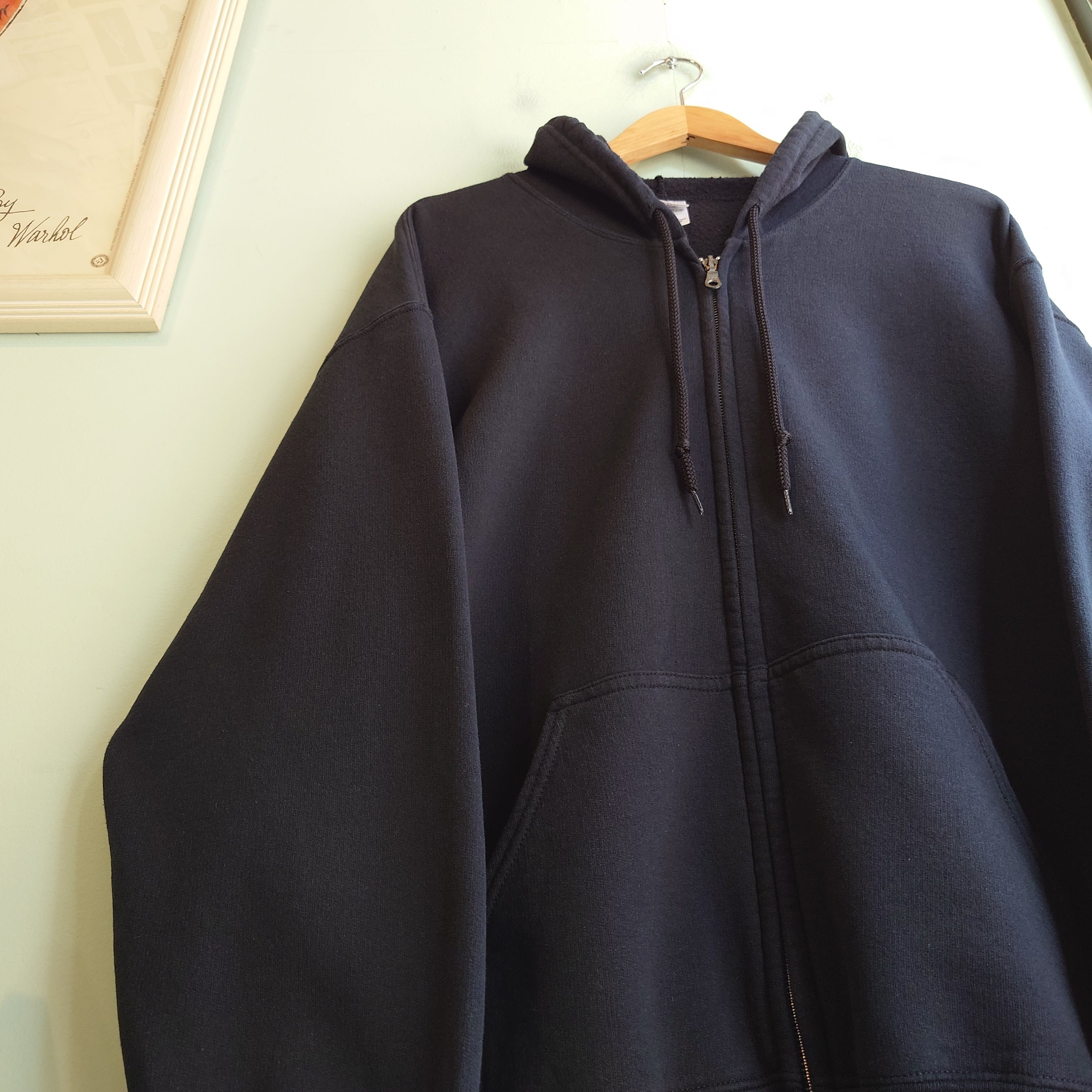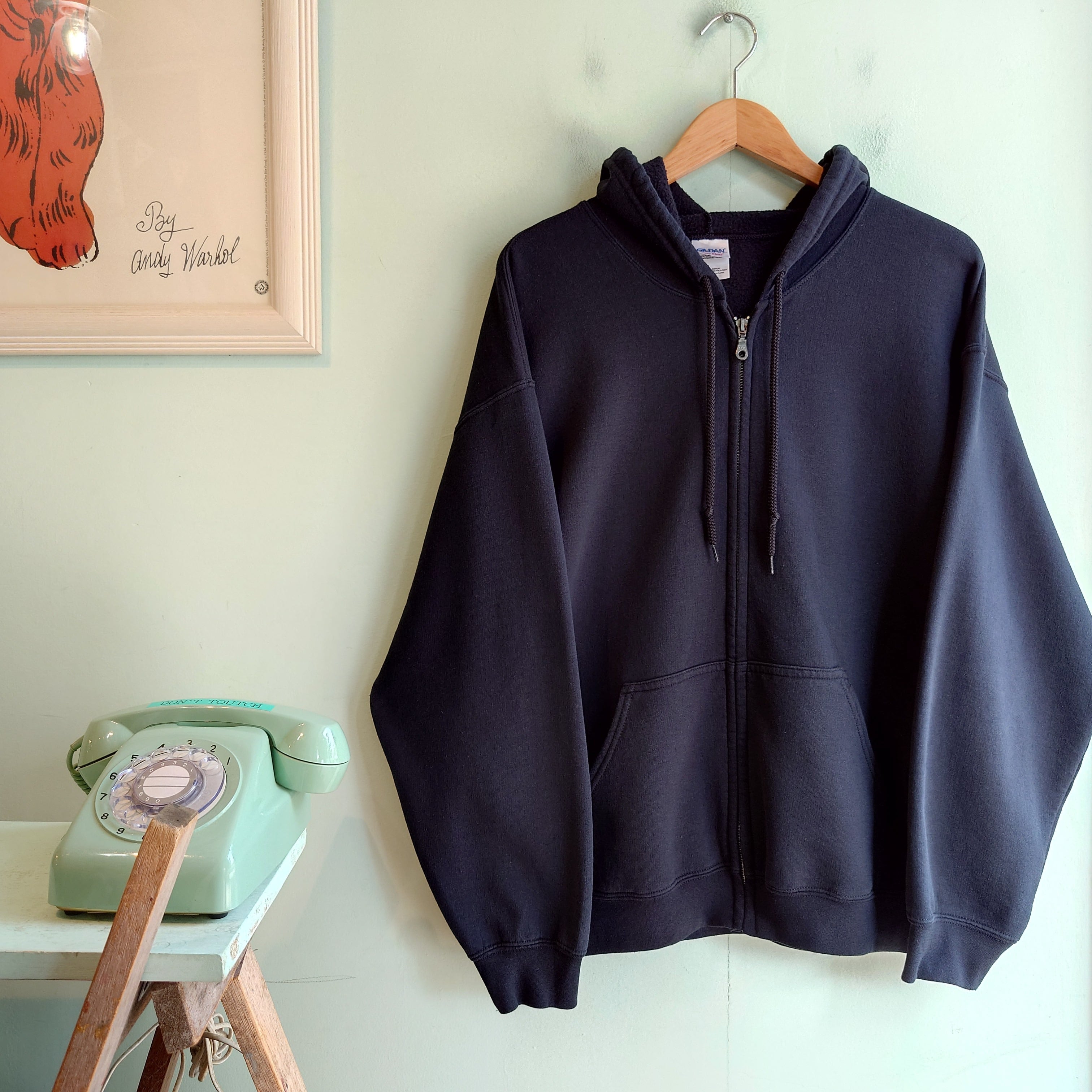 ワイドでほんのりショートなGILDANの定番無地スウェット、ジップ&フード付きバージョン、フルジップ無地パーカー。新品アイテムのそれとは違う肩落ち感や袖のゆるさ、こなれた自然体な生地感がかわいい。パーカー代わりに、レイヤードに、レディースコーデに、黒ならではの自由度も武器。
