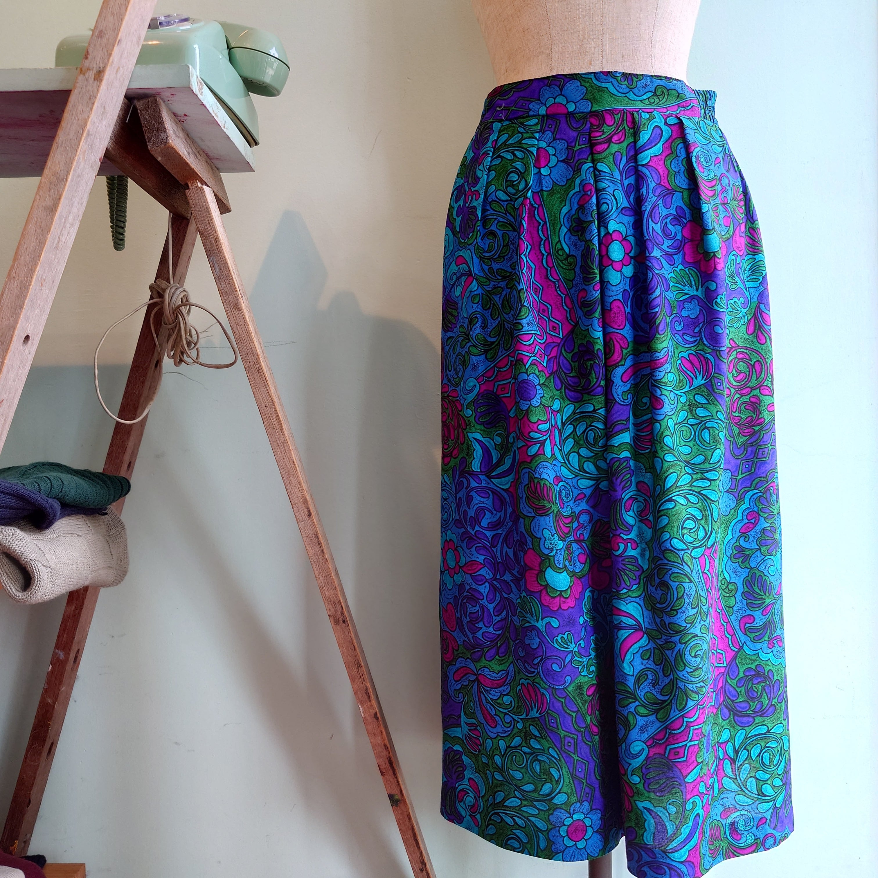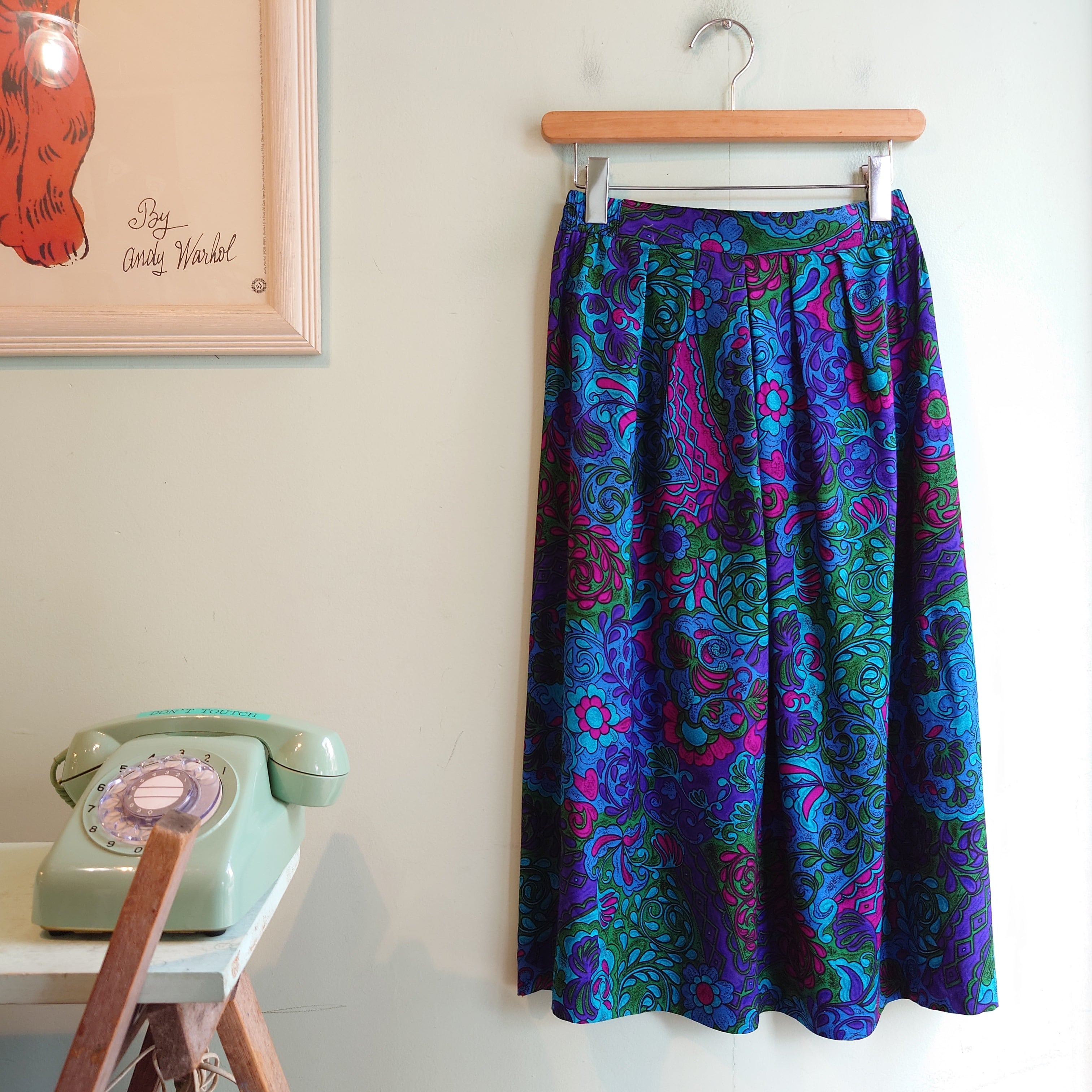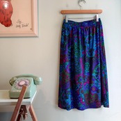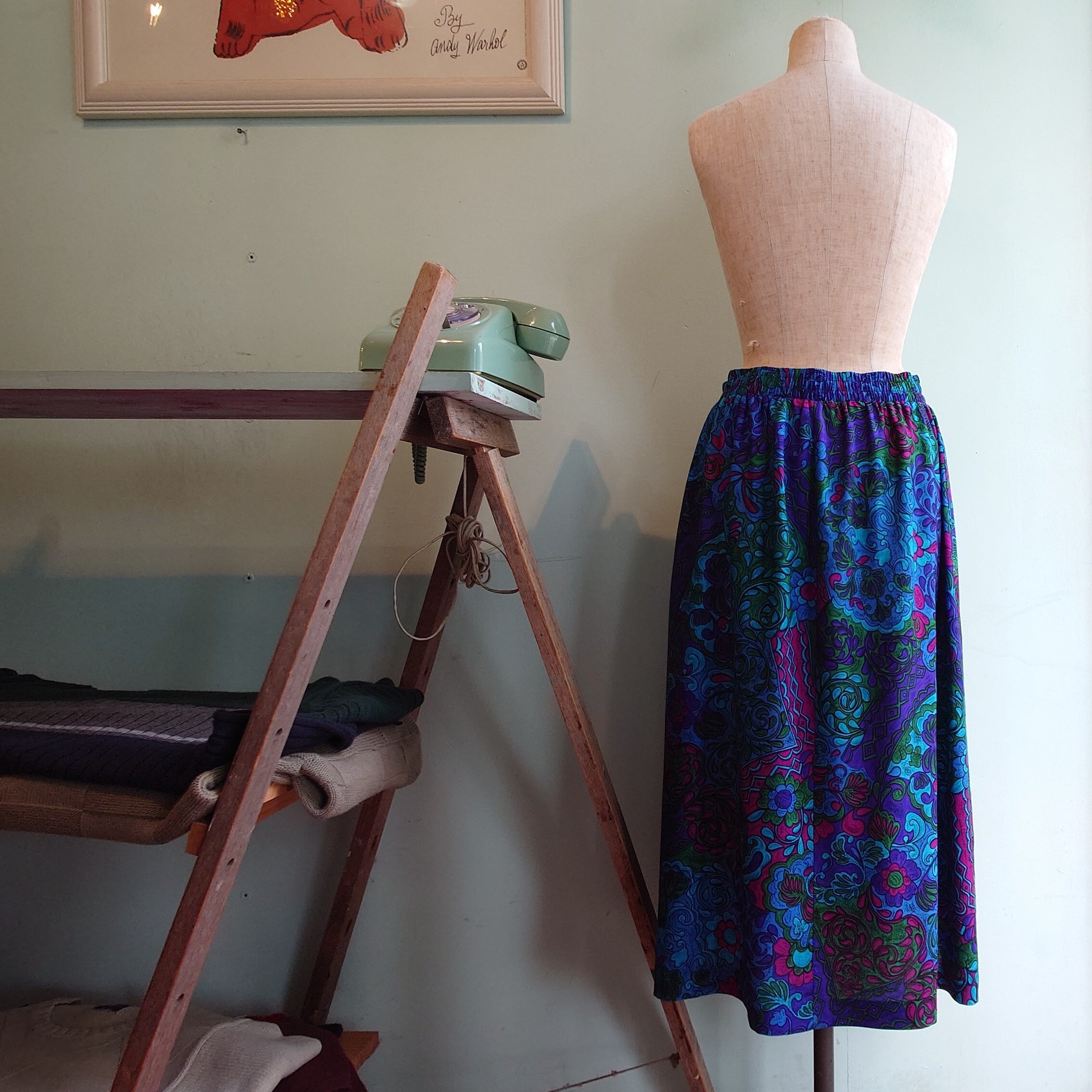 ペイズリー系に見えて、よく見れば抽象画のような手書きタッチがかわいい、イージー系のヴィンテージスカート。柄シャツのようにひらひらしたレーヨン素材に、テロ感でより動いて見えるフレアシルエット。ブラウスからオーバーサイズのスウェットまで何でも似合う系の人気タイプです。