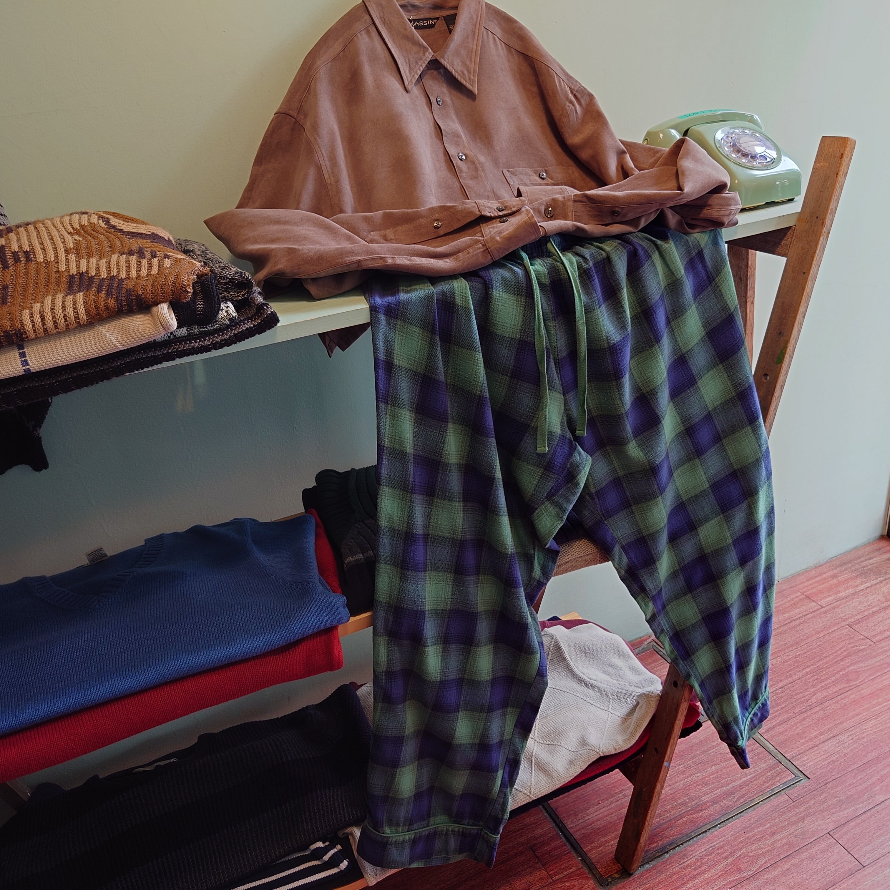 チェックのナイトウエアの中でも特に珍しい、オンブレ系チェックのパジャマパンツ。ワイド系が多いパジャマパンツの中でも特にルーズでワイドなシルエットが◎。裾についた切り替えがよりナイトウエアらしい表情。