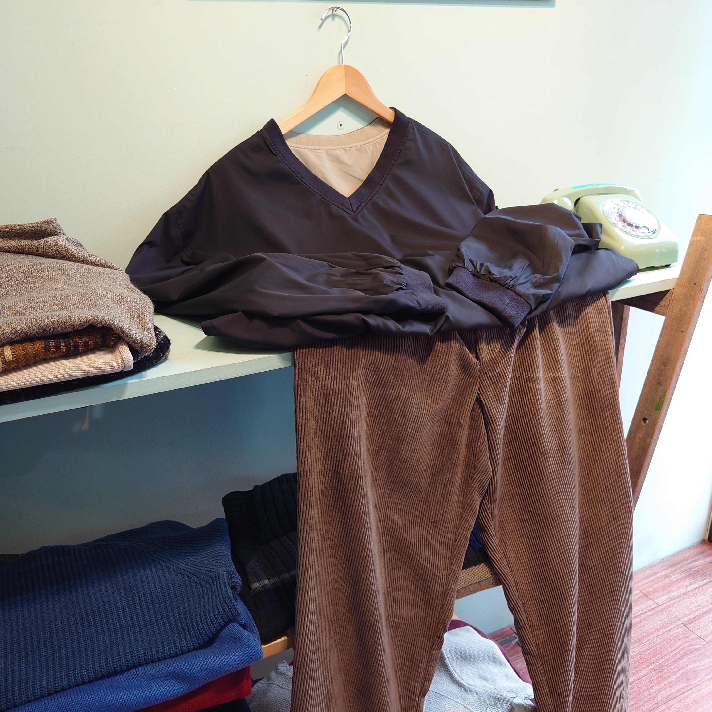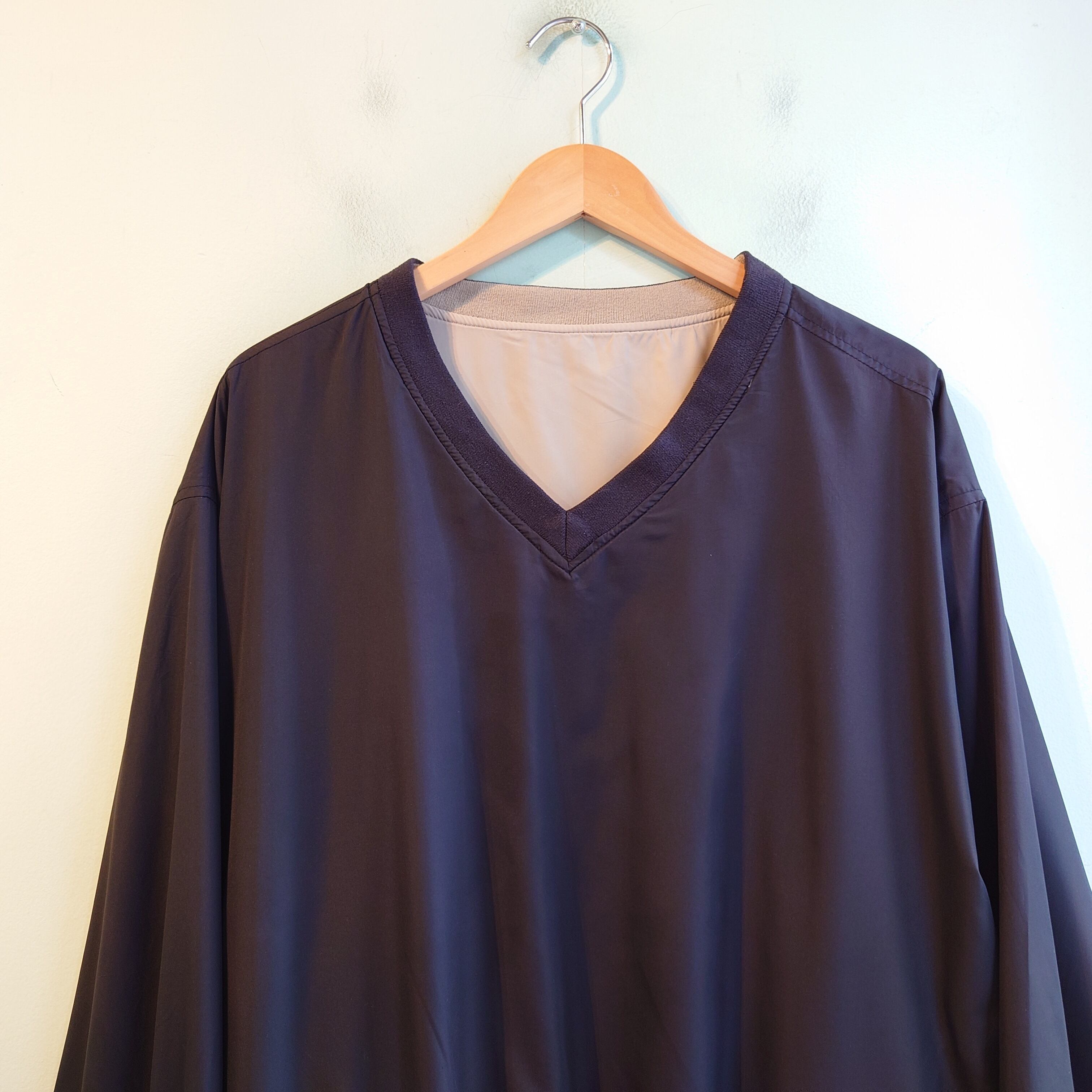 スウェット感覚でかぶれて、アウターとしても使える、無地系のプルオーバージャケット。ブラック、ベージュ面リバーシブルで、どちら側にもポケット付きの優等生。かなり柔らかめのポリ素材で、ナイロン系と比べてシャツのようなスムースさが感じられる生地感。