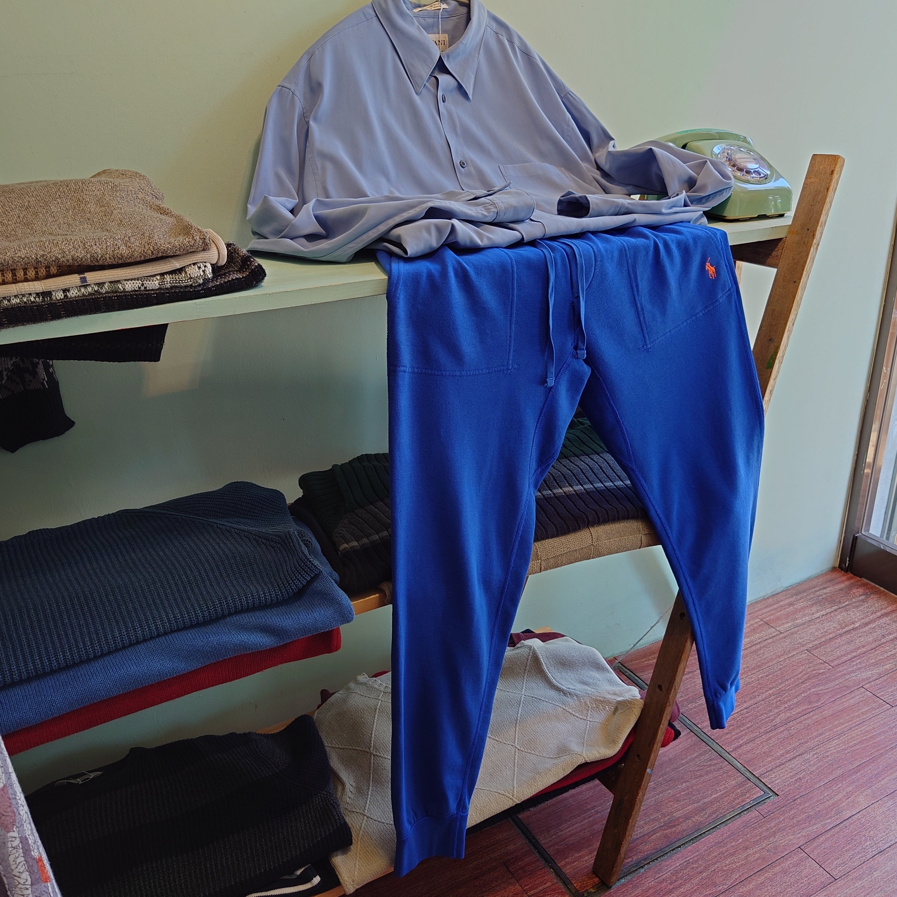 スポーツブランドのそれとは違う、巧みな切り替えとフレッシュな色合いがかわいい、ラルフローレンのスウェットパンツ。スポーティーさありつつ、アメカジのスウェットパンツ的な雰囲気も。腰履きしてルーズにサルエルライクに履きこなすのも良し、あえてチョイスして変化を出したいアイテムです。
