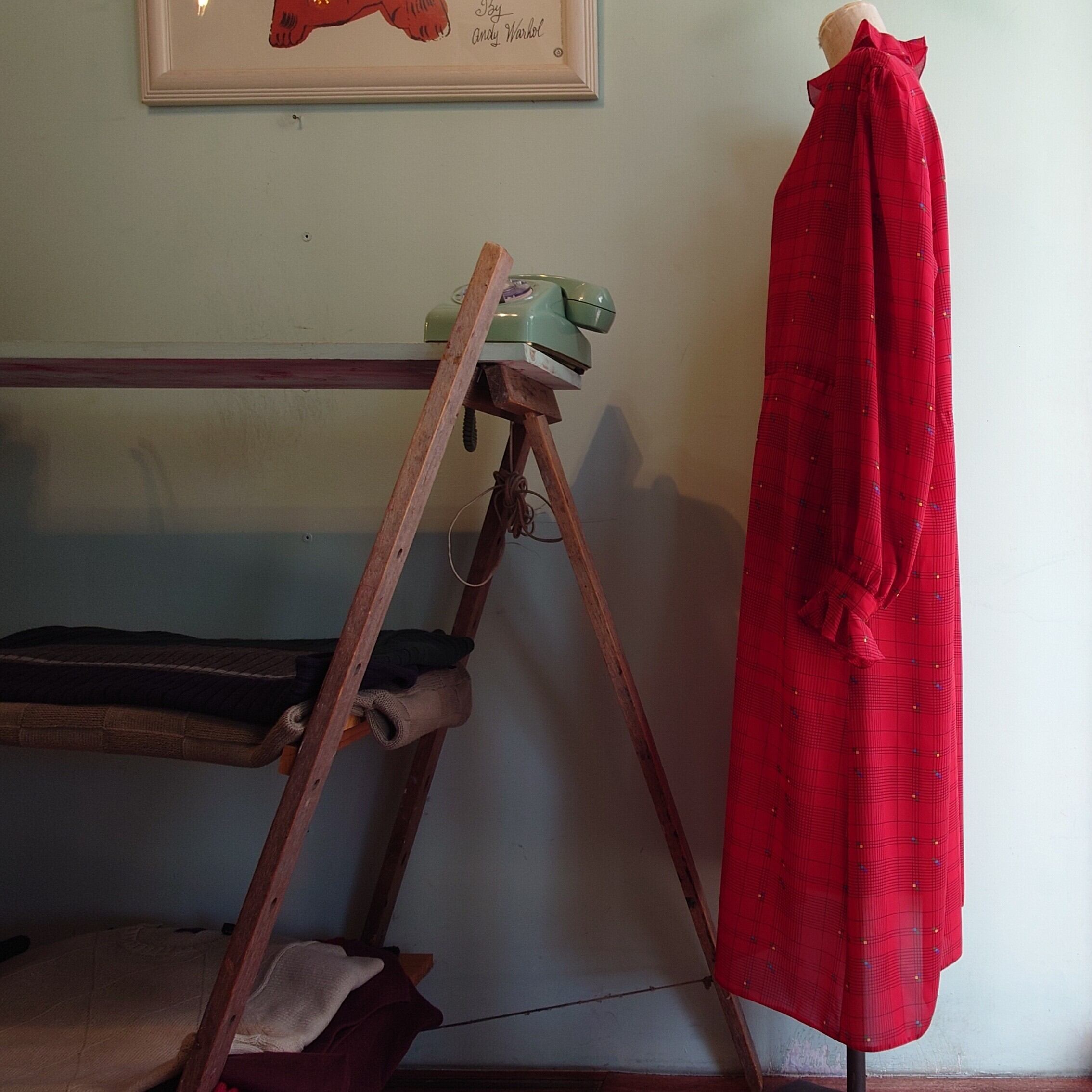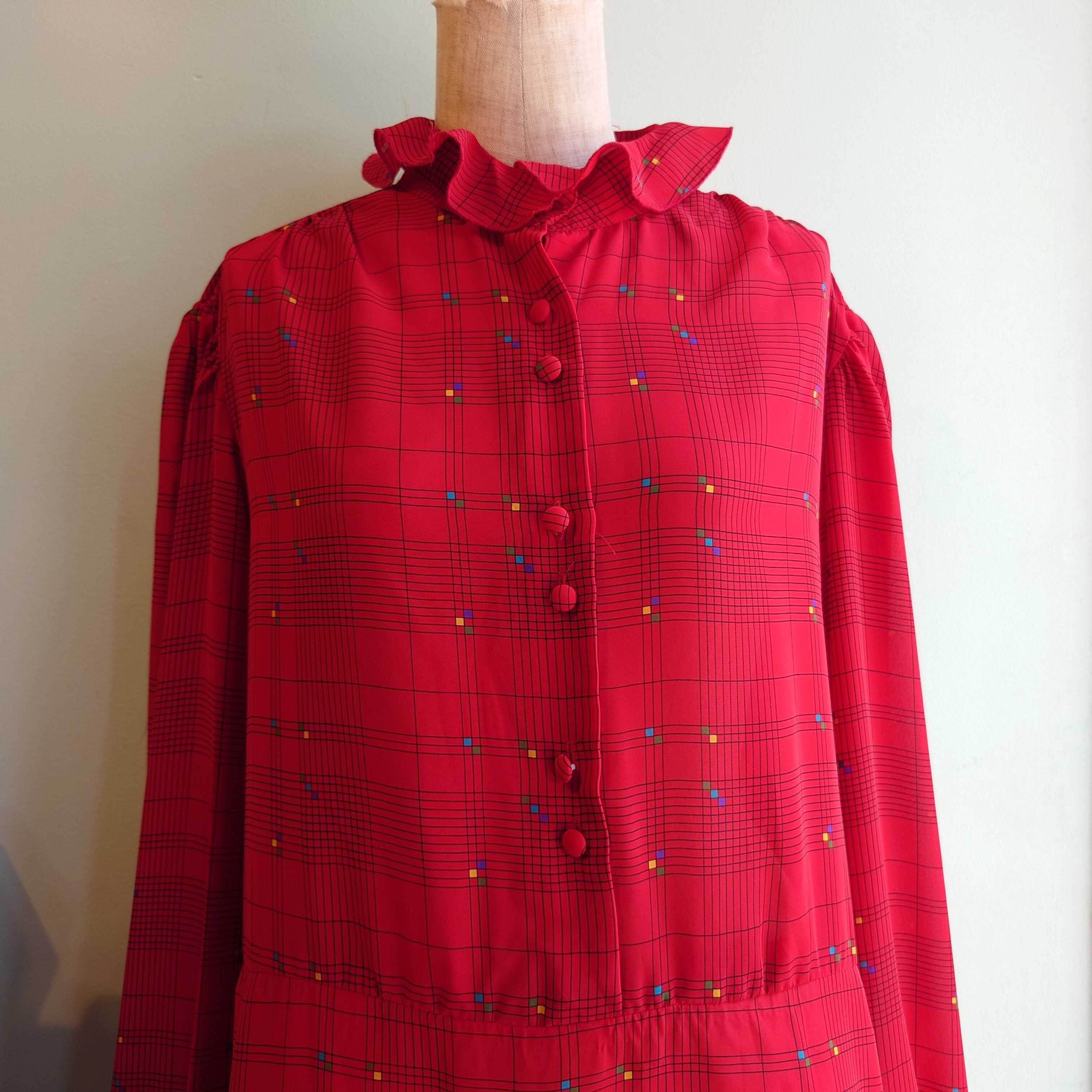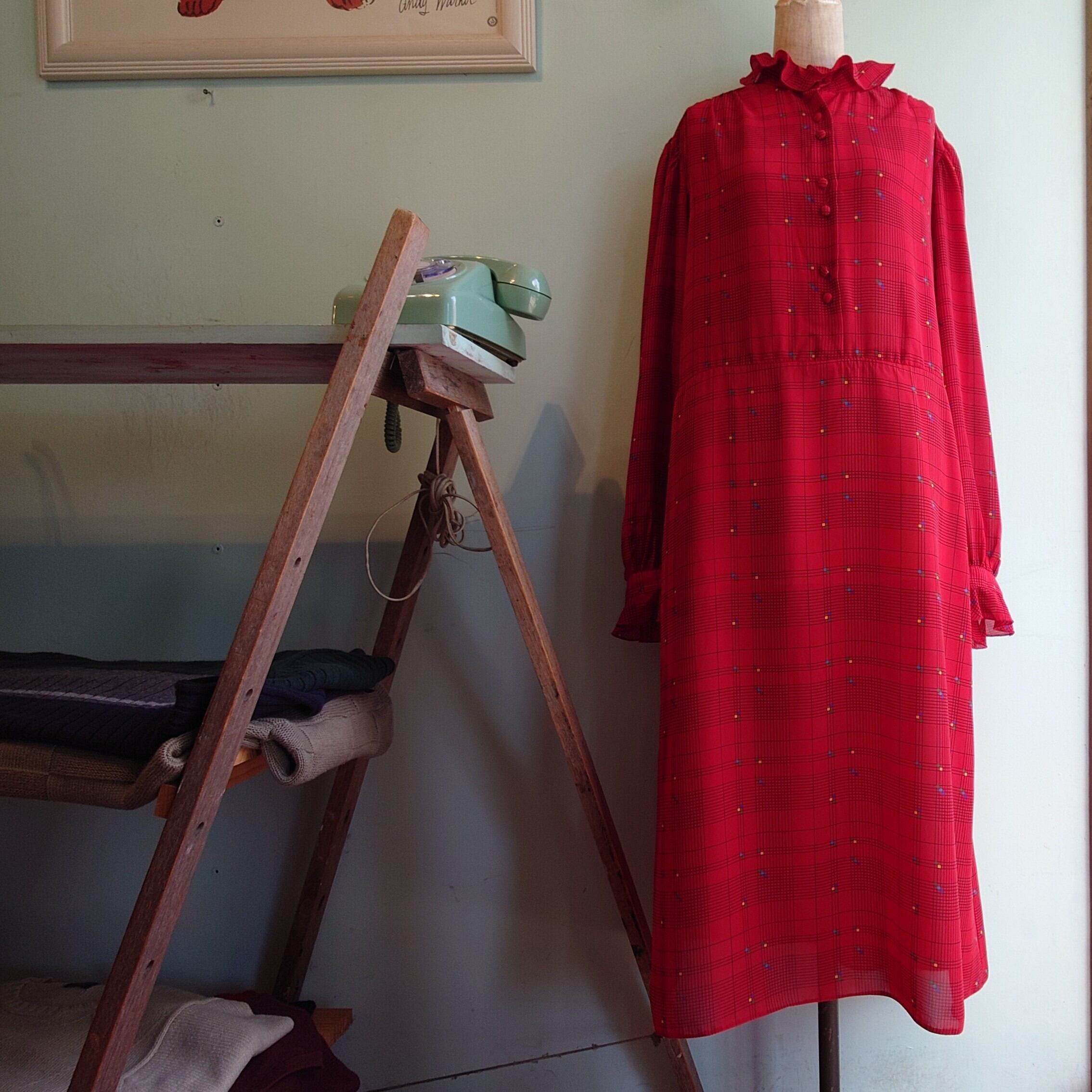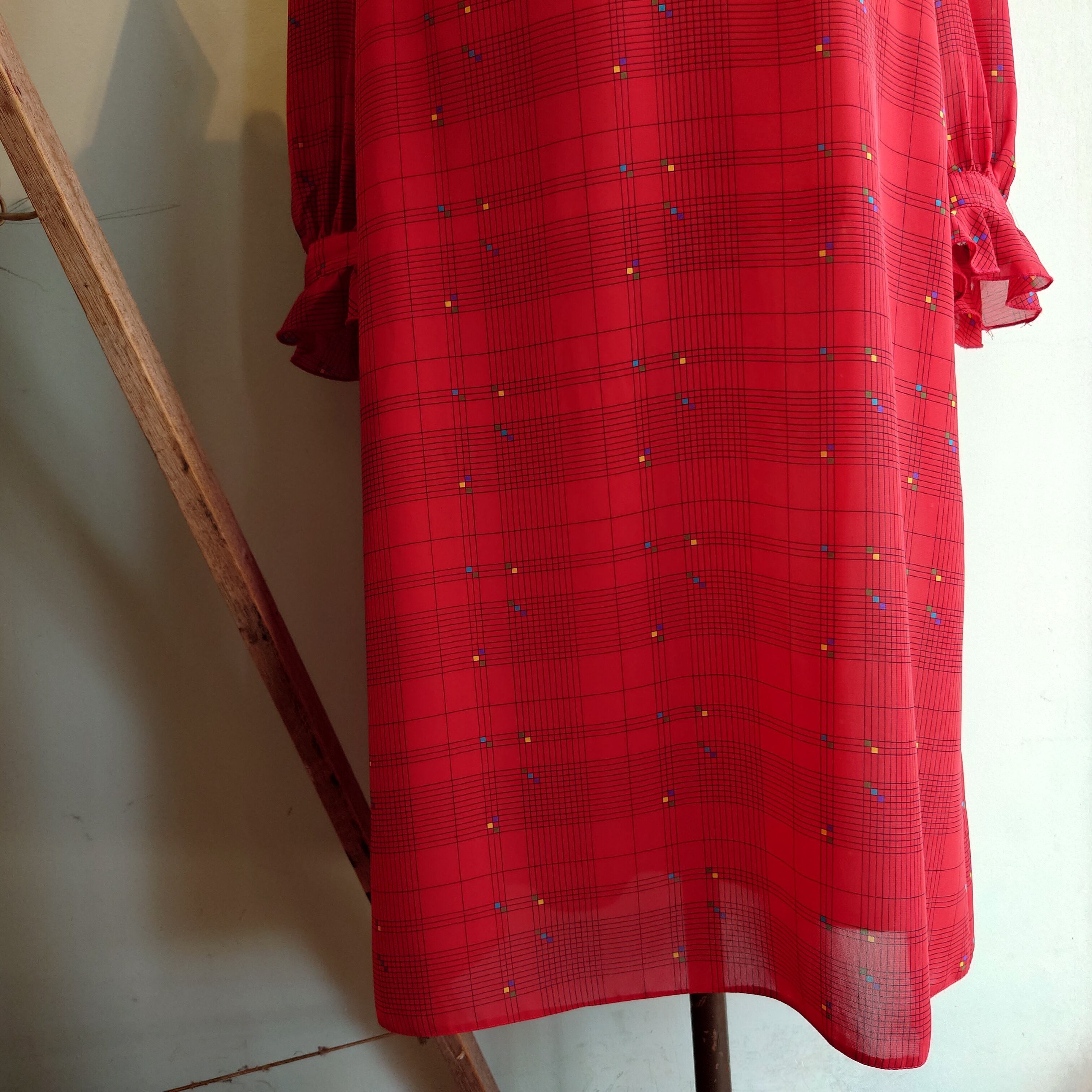 ストンとしたシルエットにエクセルの枡目のような格子、原子配列のようなドットのカラフルに惹かれるヴィンテージワンピ。ストンとしたシルエットの袖と襟にはフリル付きで、レトロモダンの中にもガーリーさを詰め込めた1枚。さらっとした薄手ポリ素材。