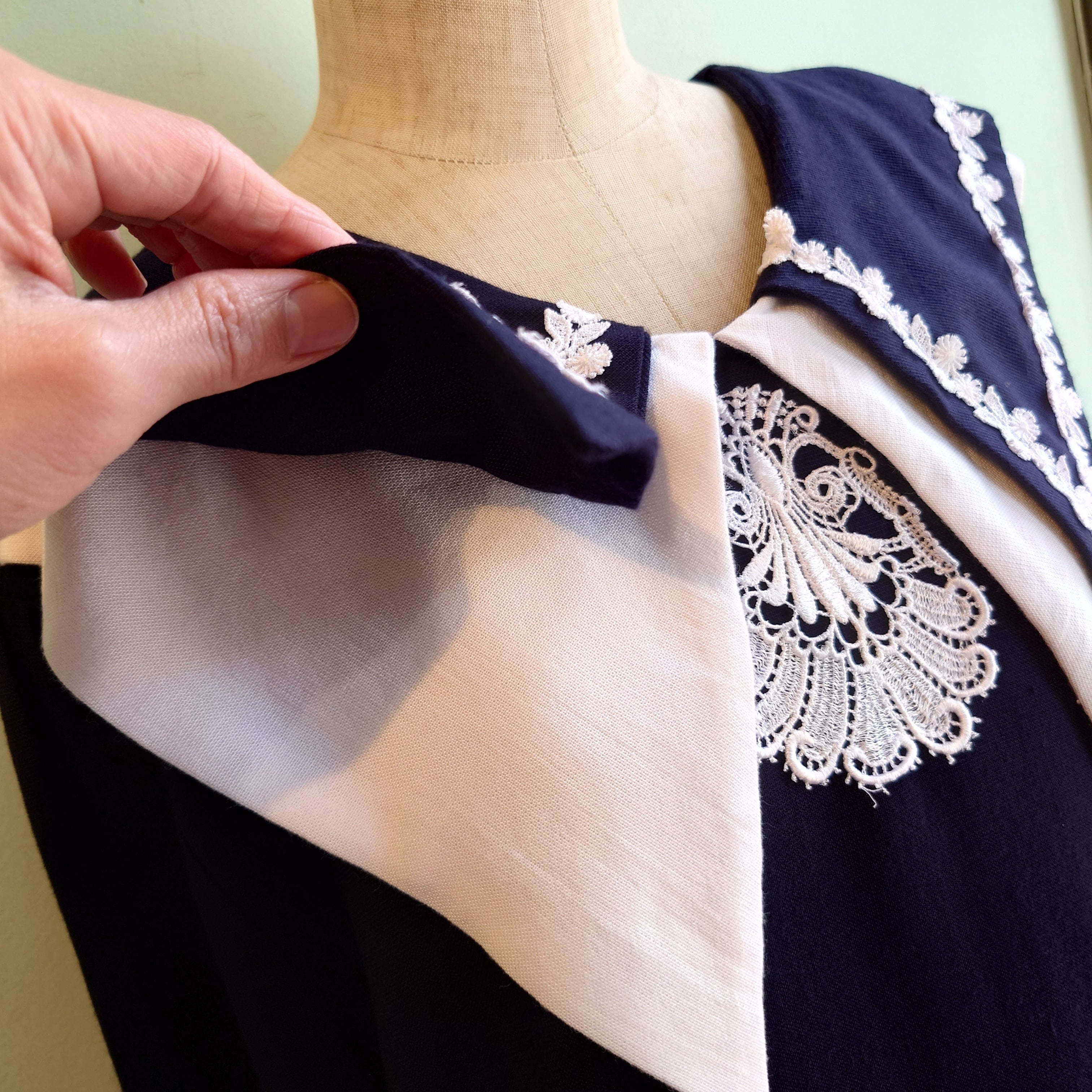 大きめなセーラー襟が2枚重って、レースの立体感が際立つショートドレス。プルオーバーではなくボタンバックで大きめな丸が印象的。シャツ感覚で合わせられるサラッとひらっとしたとろみのある生地感。シックだけどネイビー×ホワイトのマリン感で、ほんのり爽やかさも。