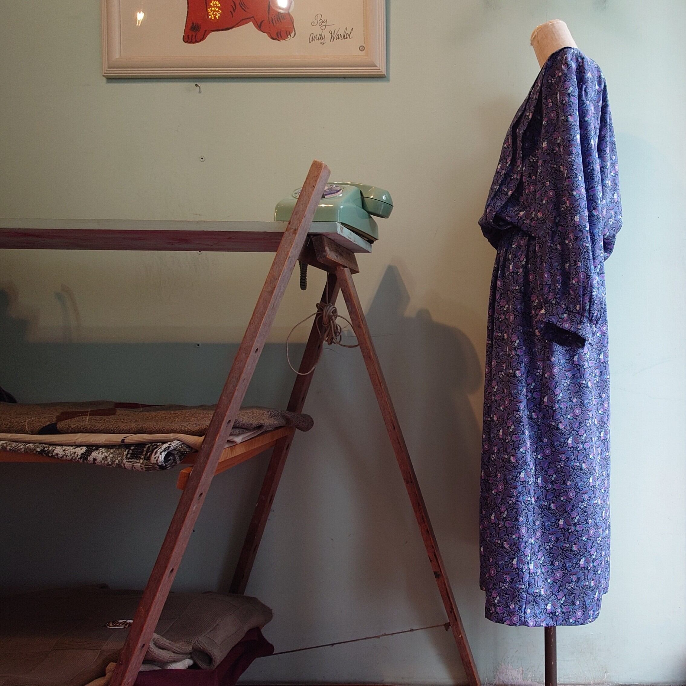 サラッとしたポリ素材のひらひら感と光沢感で、動きのあるシルエットが楽しめるヴィンテージドレス。トップのコロンとした丸み、裾にかけての上品なフレア感。ヨーロピアンにも見えるし、アメリカンカントリー系のかわいさも。