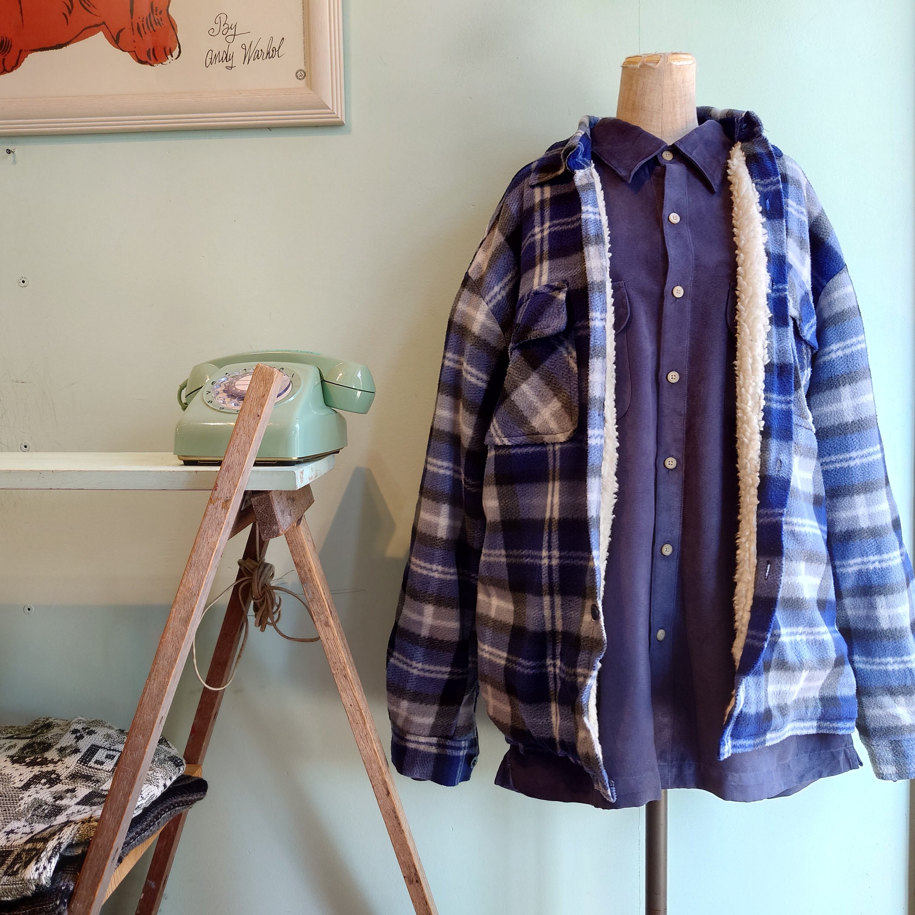 フリース系トップに裏ボアがついたチェックのシャツジャケット。ネルシャツに中綿が付いたシャツ感覚で、何気なく羽織ったスタイルがかっこいいやつです。TシャツやロンTに重ねてすぐに暖かく、軽さも際立つ1枚。古着らしい着古した印象も雰囲気あり。