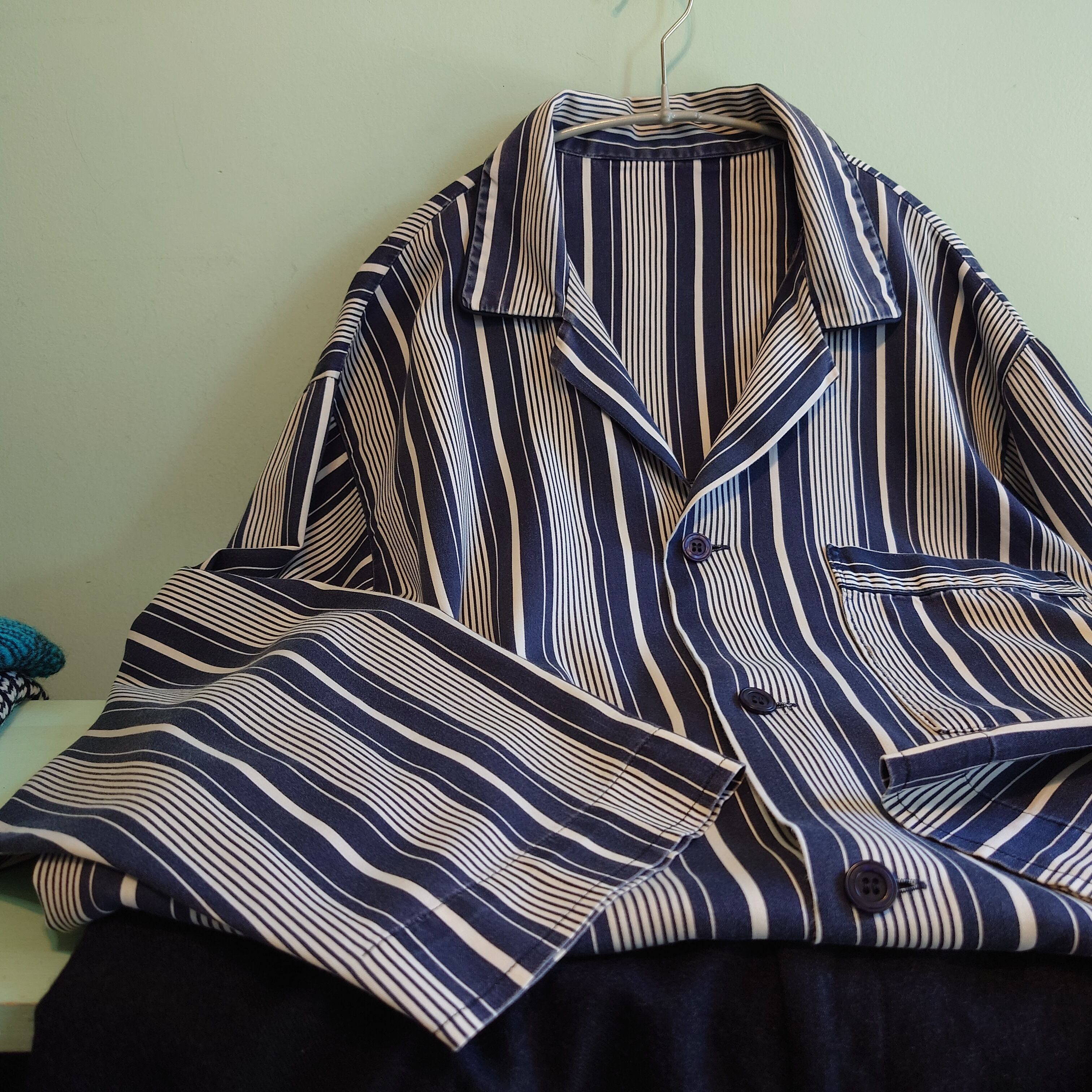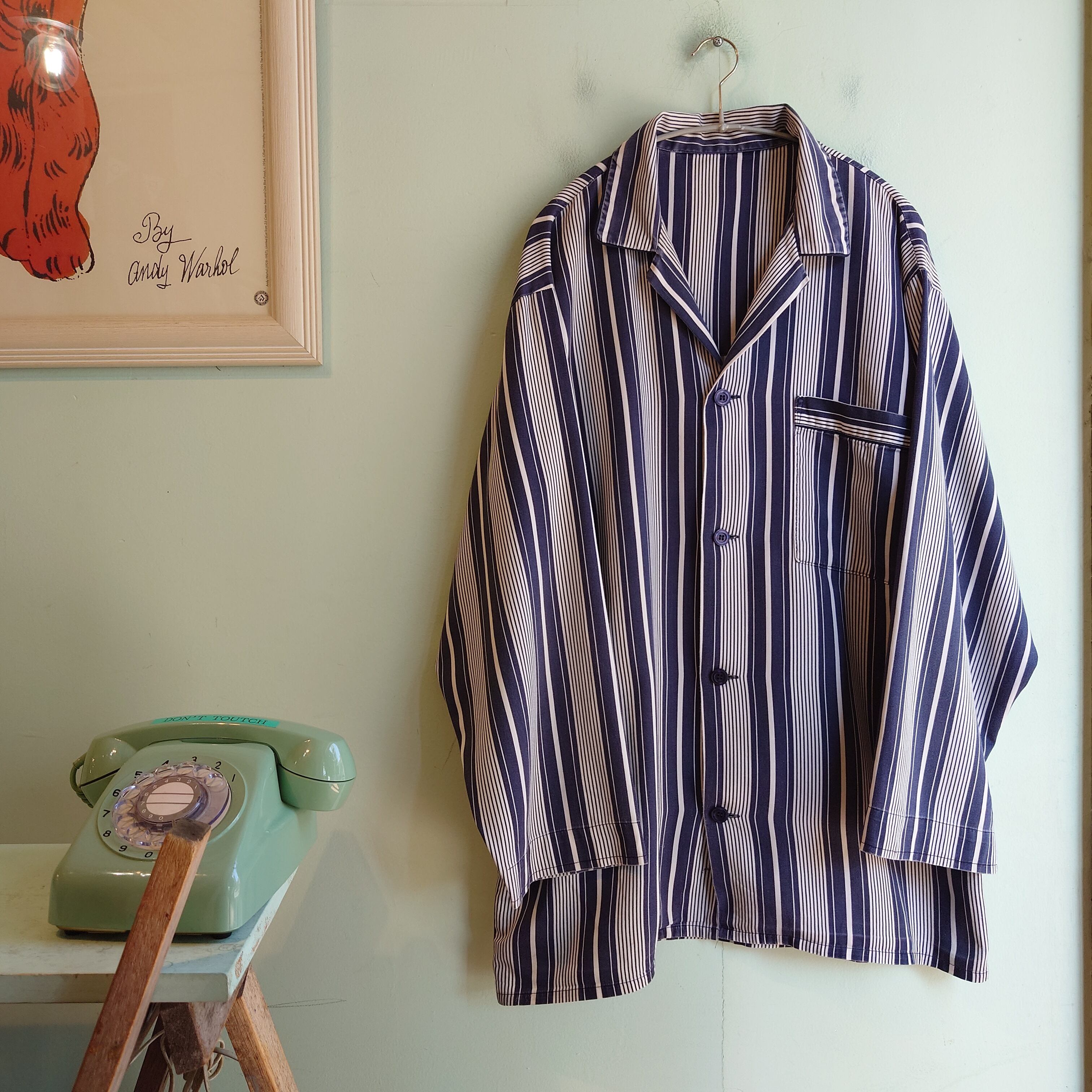 英ストラブランド、セントマイケルのヴィンテージパジャマシャツ。ほんのりネイビー感のあるダークグレーとホワイトのストライプ柄で、カートコバーンを彷彿させるようなアンニュイなパジャマ感。ナイトウエアらしいコットン系ながら、しっとりとした風合いが心地よいイギリスメイド。ジャケットのようなボックスシルエットや、ゆるっとした袖周りは普通のシャツにはない雰囲気。