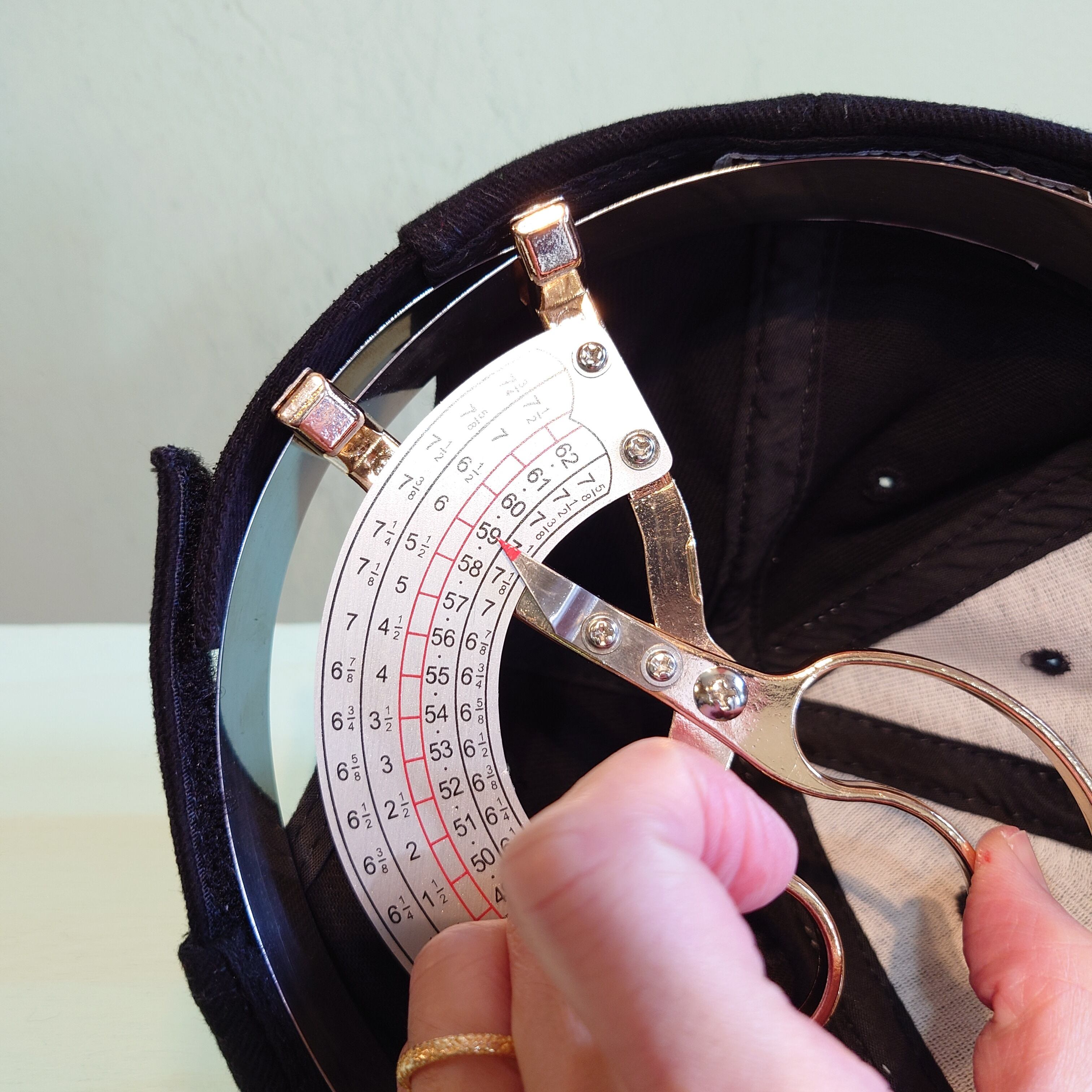 キャップゲージを使って内側を採寸しています。かぶり方や髪型で若干感じ方が異なる場合がございます。