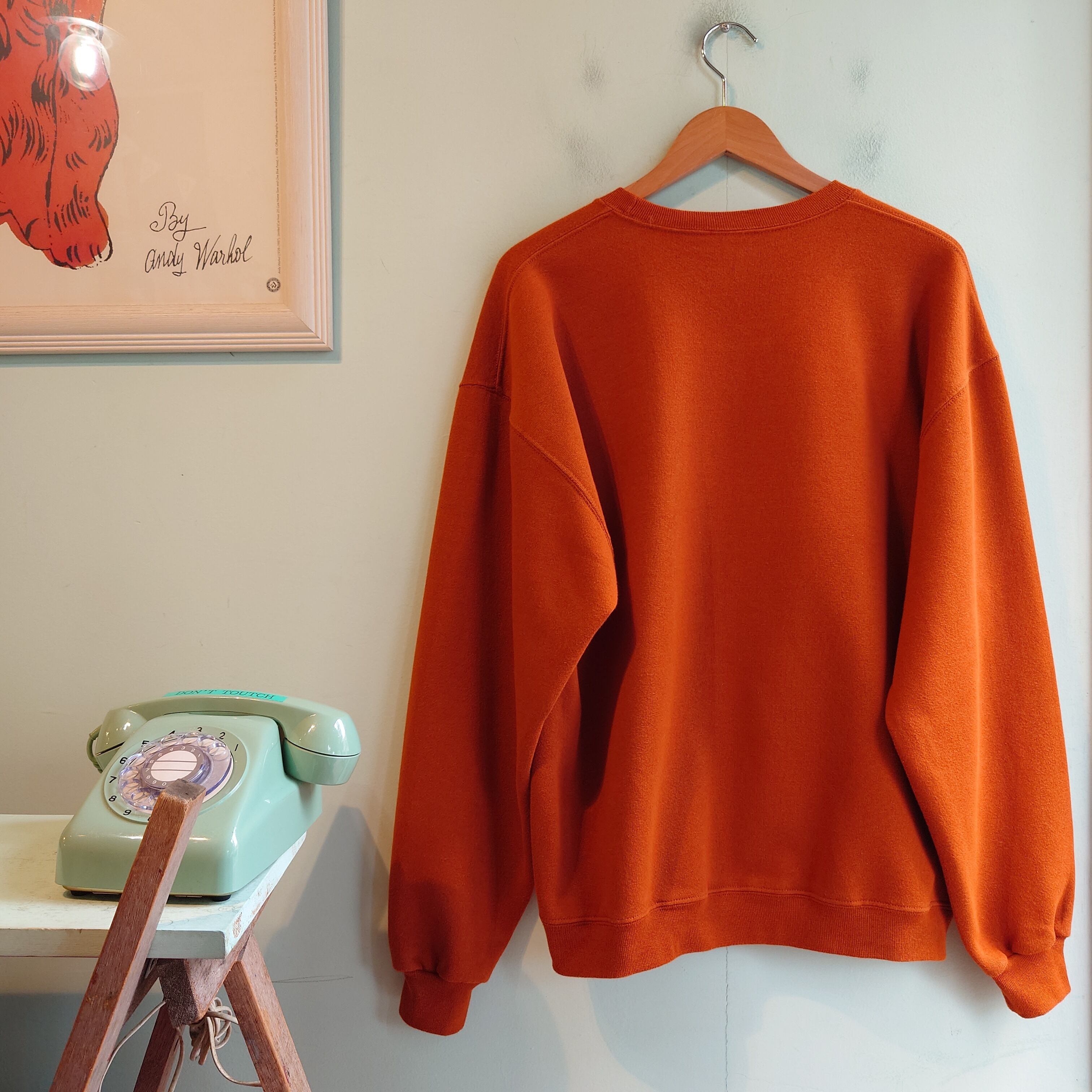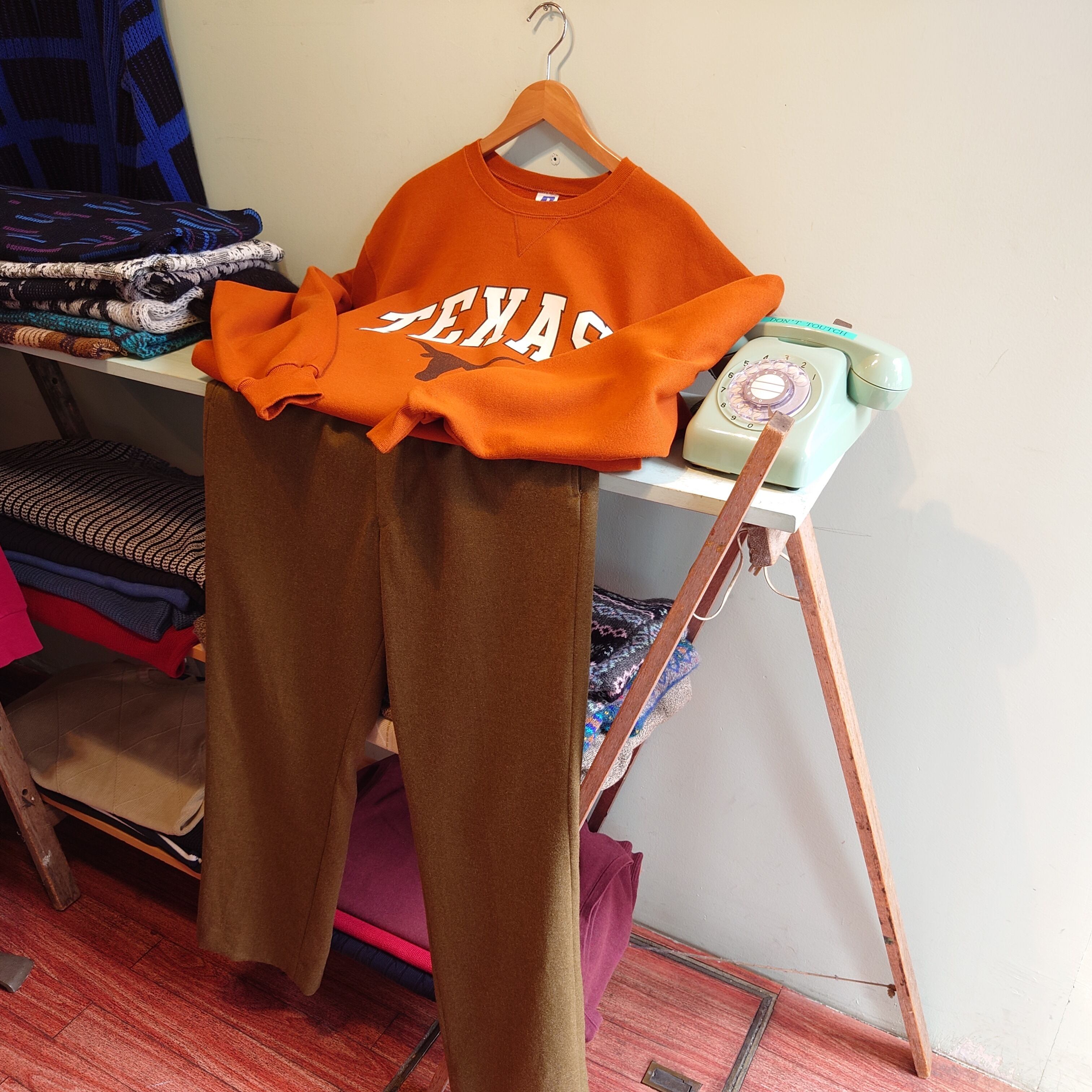 テキサス大学カレッジチーム、ロングホーンズのロゴスウェット。バーントオレンジと呼ばれる、くすんだオレンジが最高。一般のオレンジと違い、ブラウンのような深みがあるいいカラーです。襟元のガゼット、コロンとしたシルエット、裾についたタグがおなじみのRussellボディー。