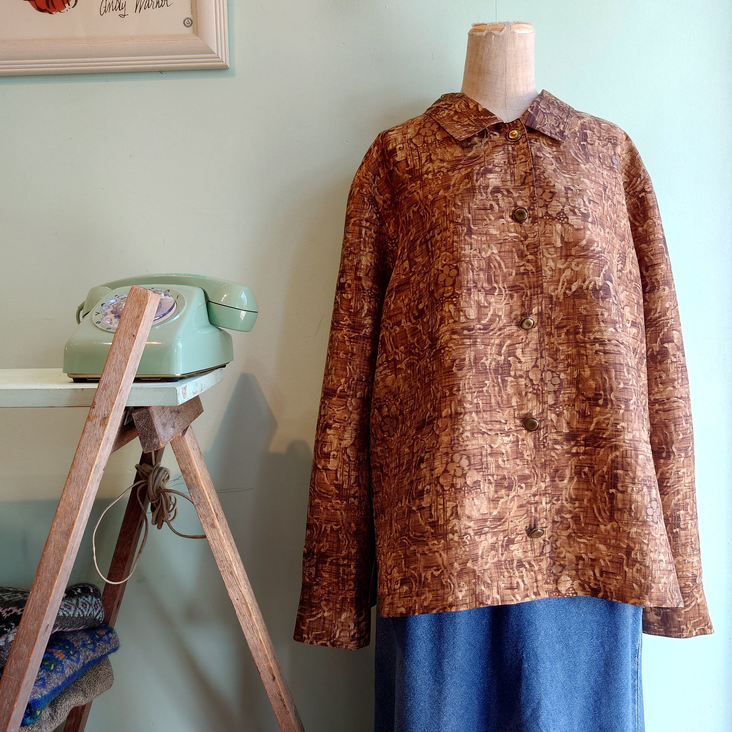 カバーオールのようにジャケットライクなシルエットに、金属的な質感に惹かれる総柄ブラウス。ナイロンに近いような薄手シルクの光沢と、オリエンタルな総柄も個性的。金属製のボタンも含めて、無機質だけど有機的な、世界観のある一枚。