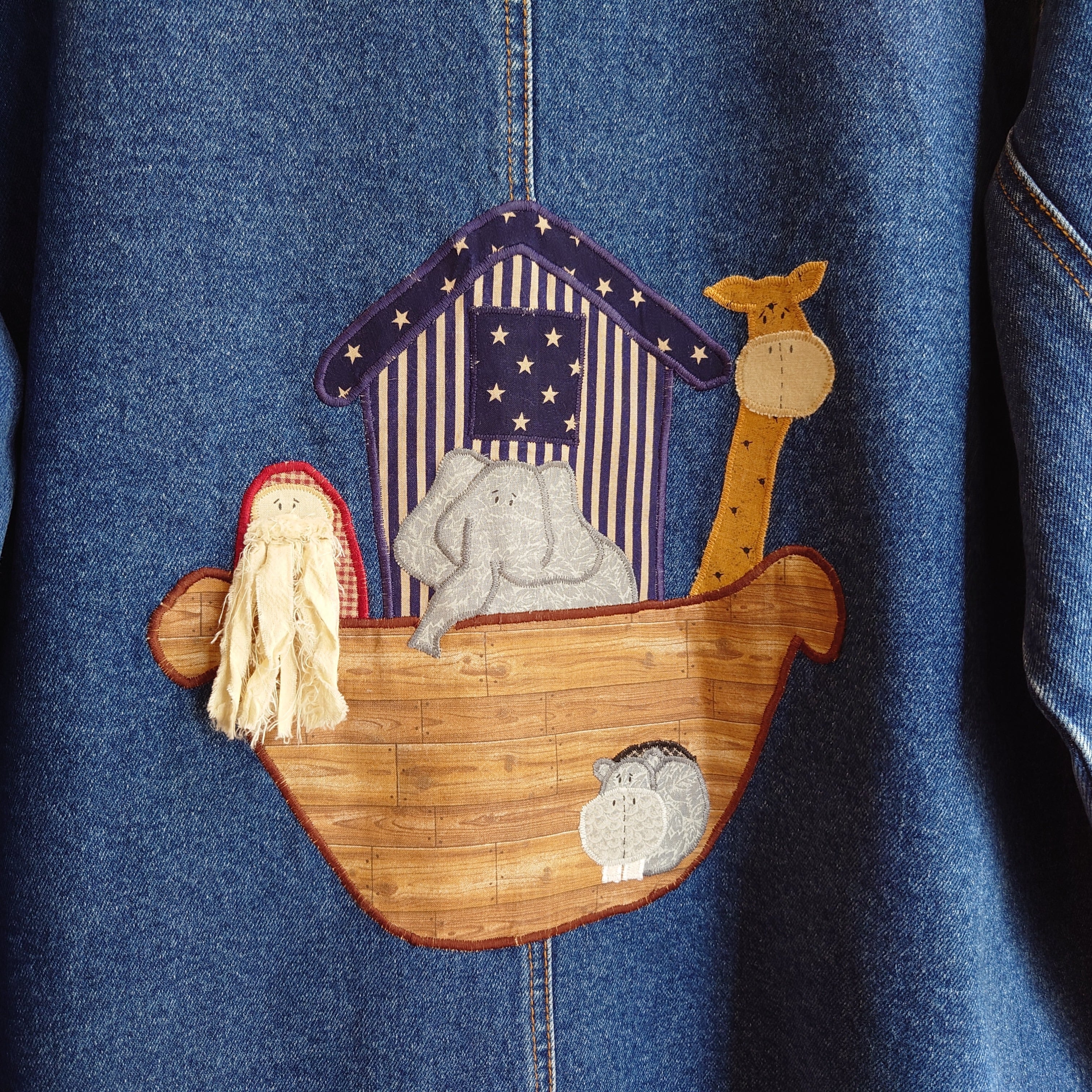 旧約聖書の物語、ノアの方舟のデコレーションいりデニムカバーオール。ワークライクなカバーオールを、ユニセックスな雰囲気にリデザインしたような、本格的かつ力の抜けたデザインがかわいい。襟のバイカラーやオリジナリティ溢れるボタンなど、アクセントも十分。