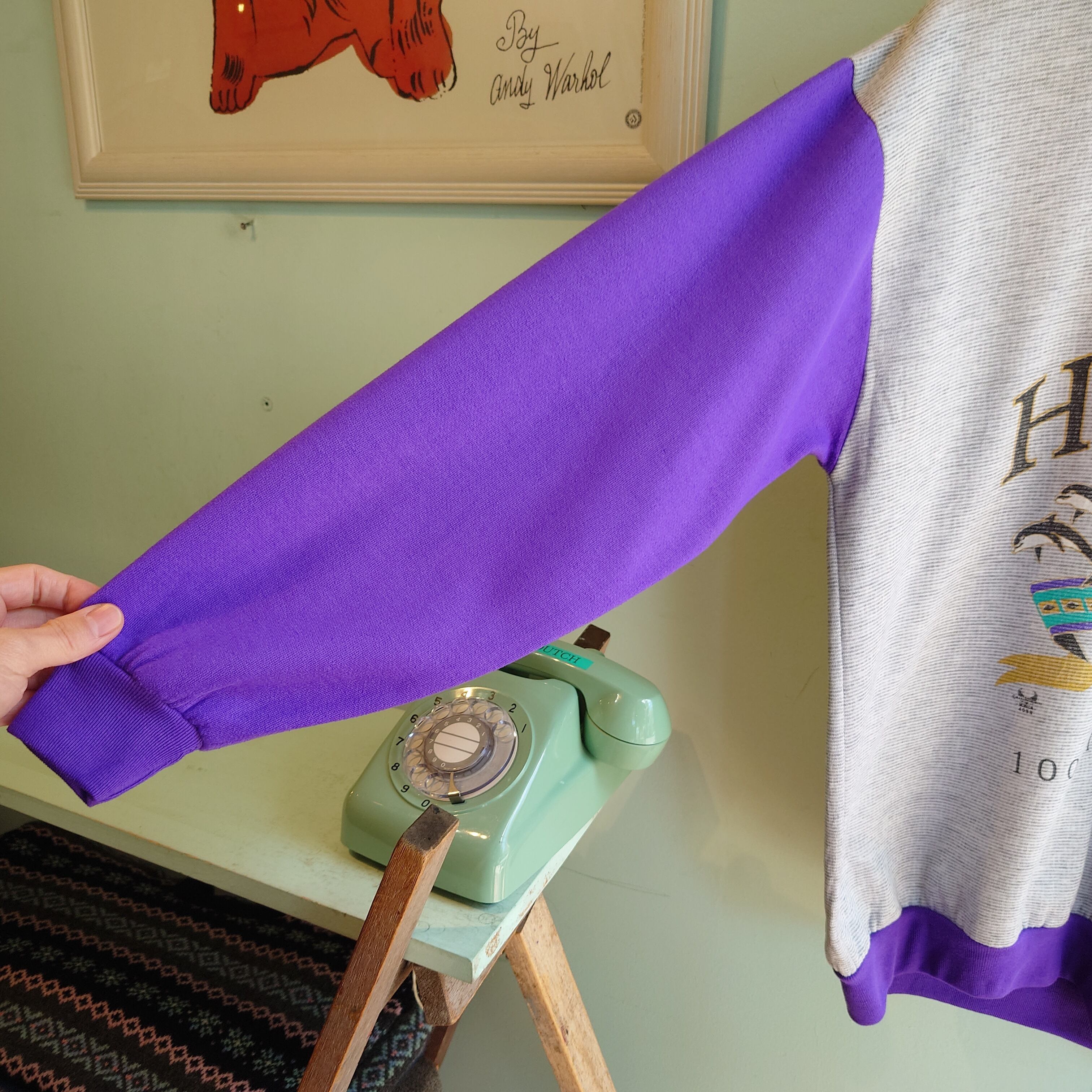 ボーダー状の変わり種素材と、パープルの切り替え、ハーフジップと盛り込み感がかわいいハワイのスーベニアスウェット。シャチをモチーフにしたマリンプリントには薄っすらとラメ入り、強すぎない色味が◎。