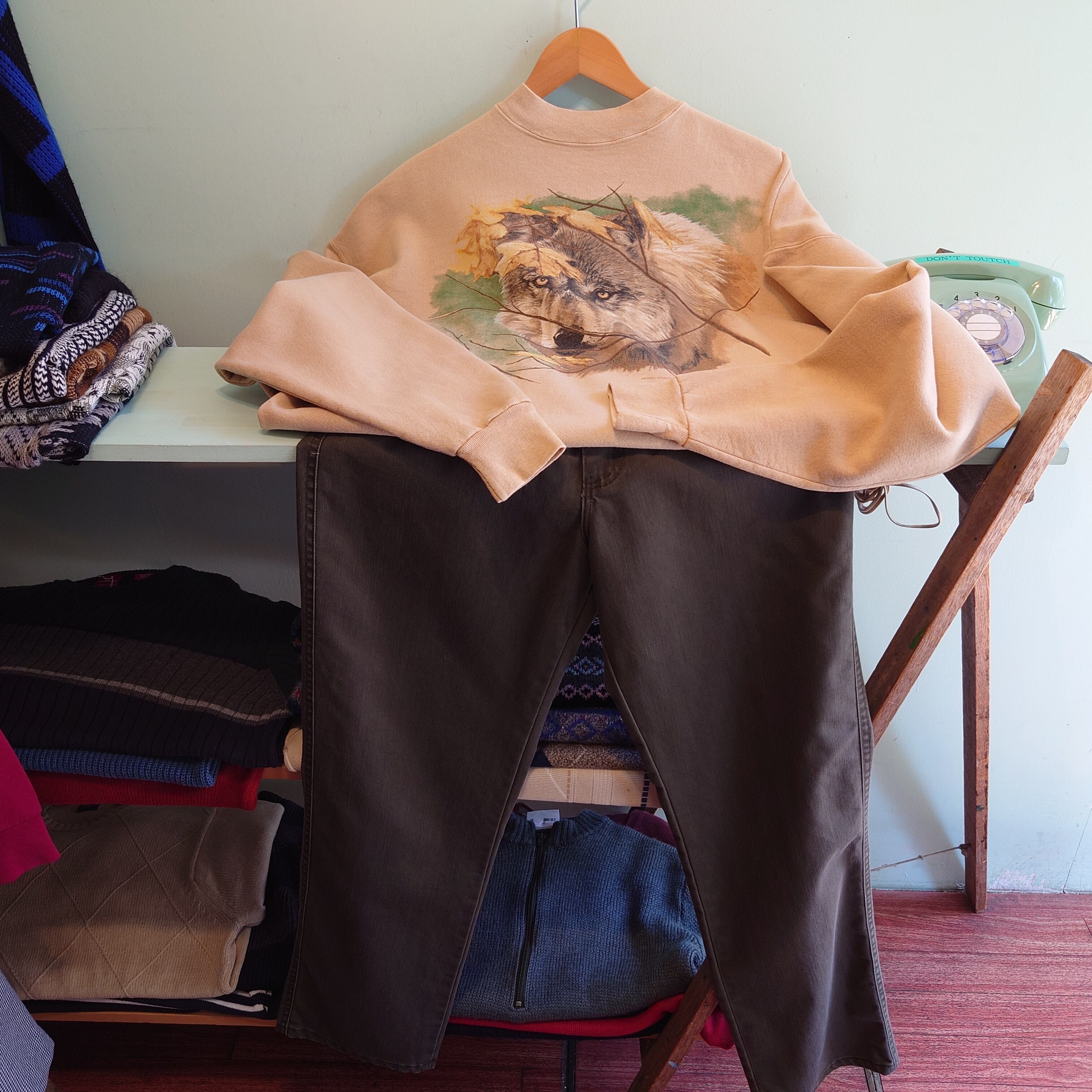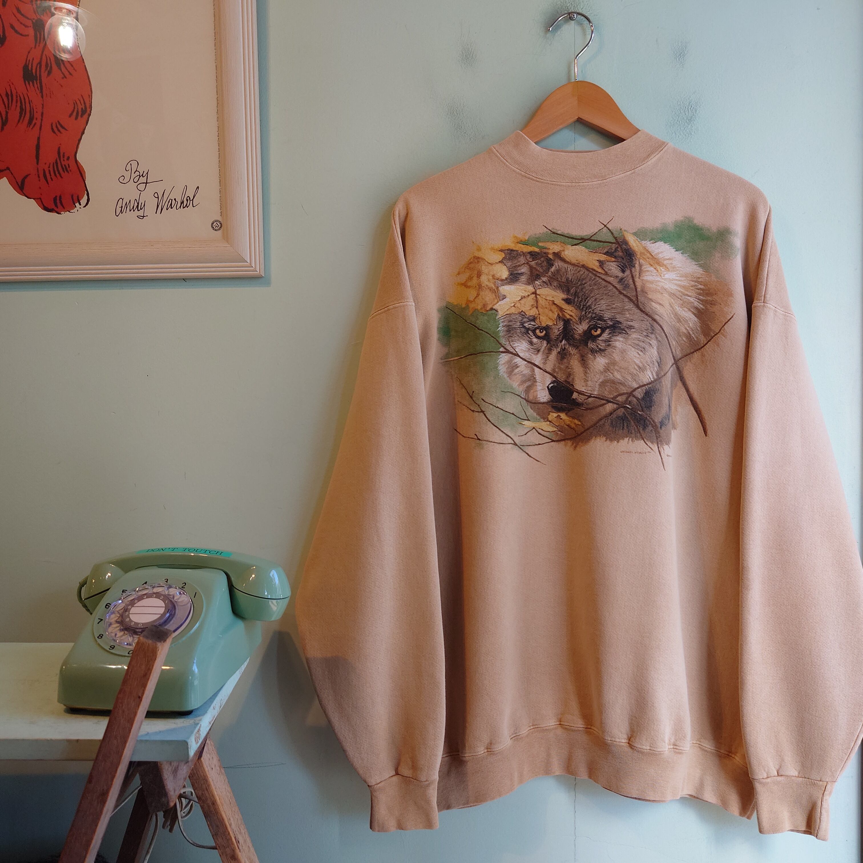 米国最大の自然保護教育団体、ナショナル・ワイルドライフのアニマルスウェット。ヘヴィー派も納得のざっくりボディーに、くすんだイエローがレア。まるでリアルツリーカモのような色合いでオオカミが顔を出す、ネイチャー系ならではの味わいあり。