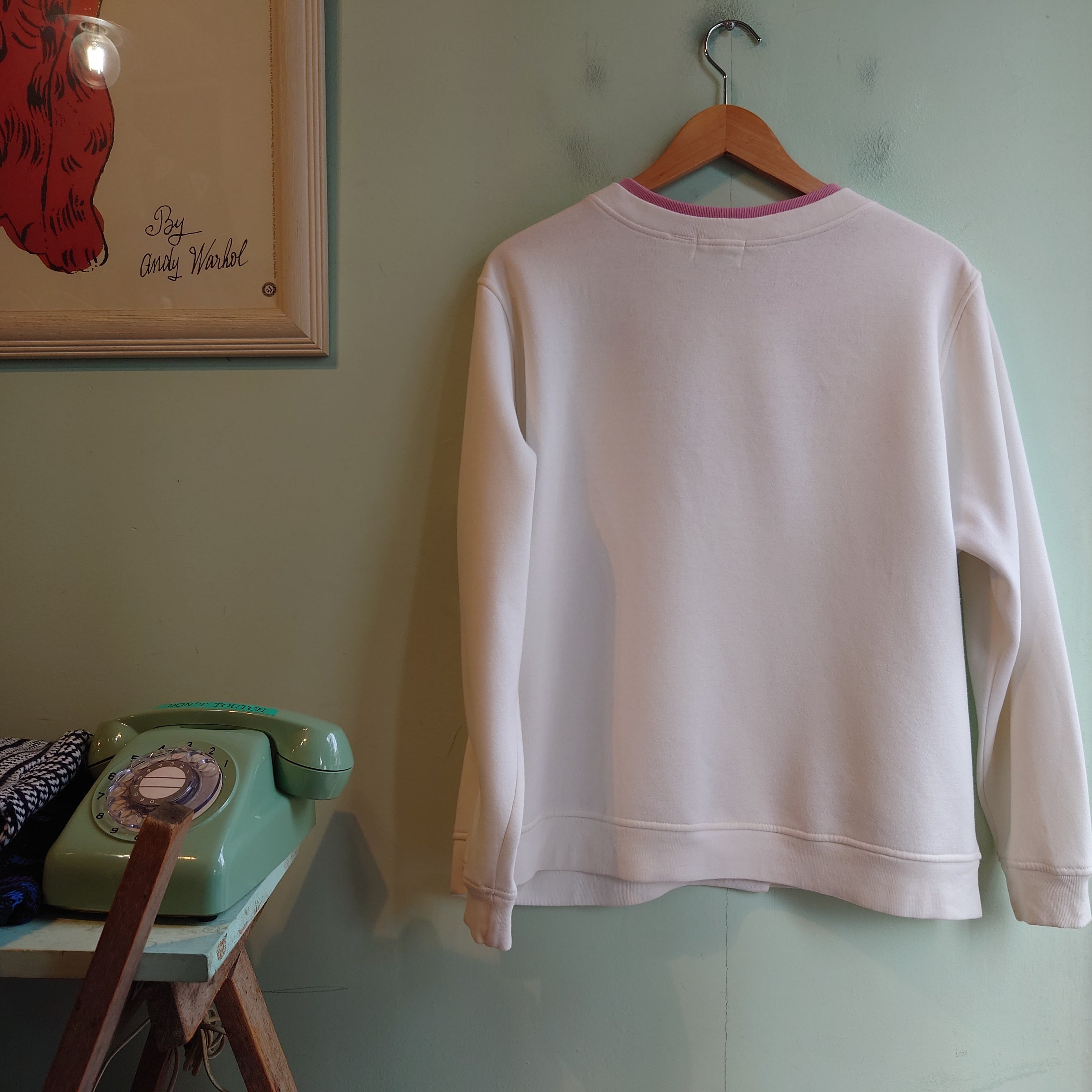 オフホワイトにピンクの内襟に、花柄がリンクしたガーリ系のスウェットカーディガン。丸襟でコロンとワイドなカーディガンスタイルも、スウェット素材でよりヘルシーなスタイルに。スウェットとして、カーディガンとして軽めのアウターとして、着こなしの幅も広め。ワンピースやスカートとよく合うデザインです◎
