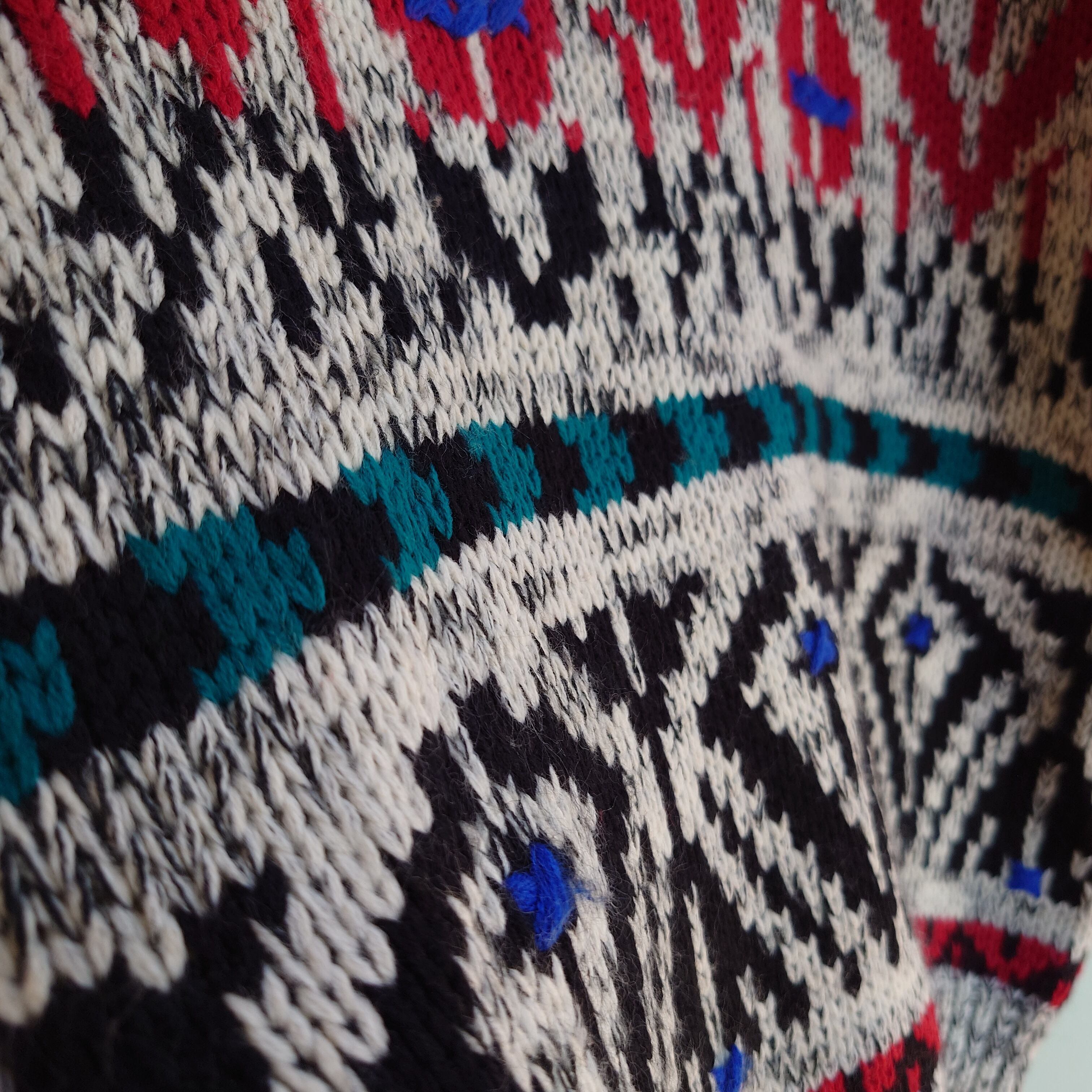 白黒をベースに赤、緑、青を巧みに取り入れた、オリジナリティ溢れるネイティブ柄に惹かれる総柄ニット。古着のニットらしいコロンとした丸みと、ローゲージのざっくり感も間違いなし。温かみあり、ウールに見える糸目だけどアクリルだから軽く、着心地も良好。女子コーデにもおすすめです◎