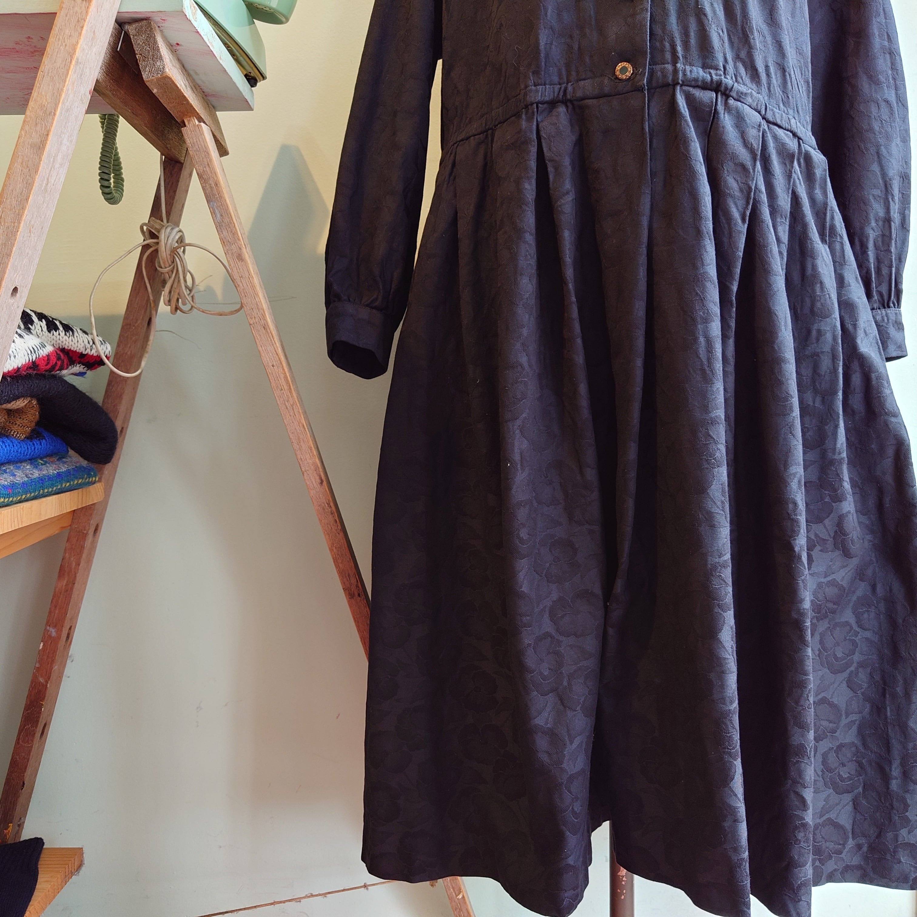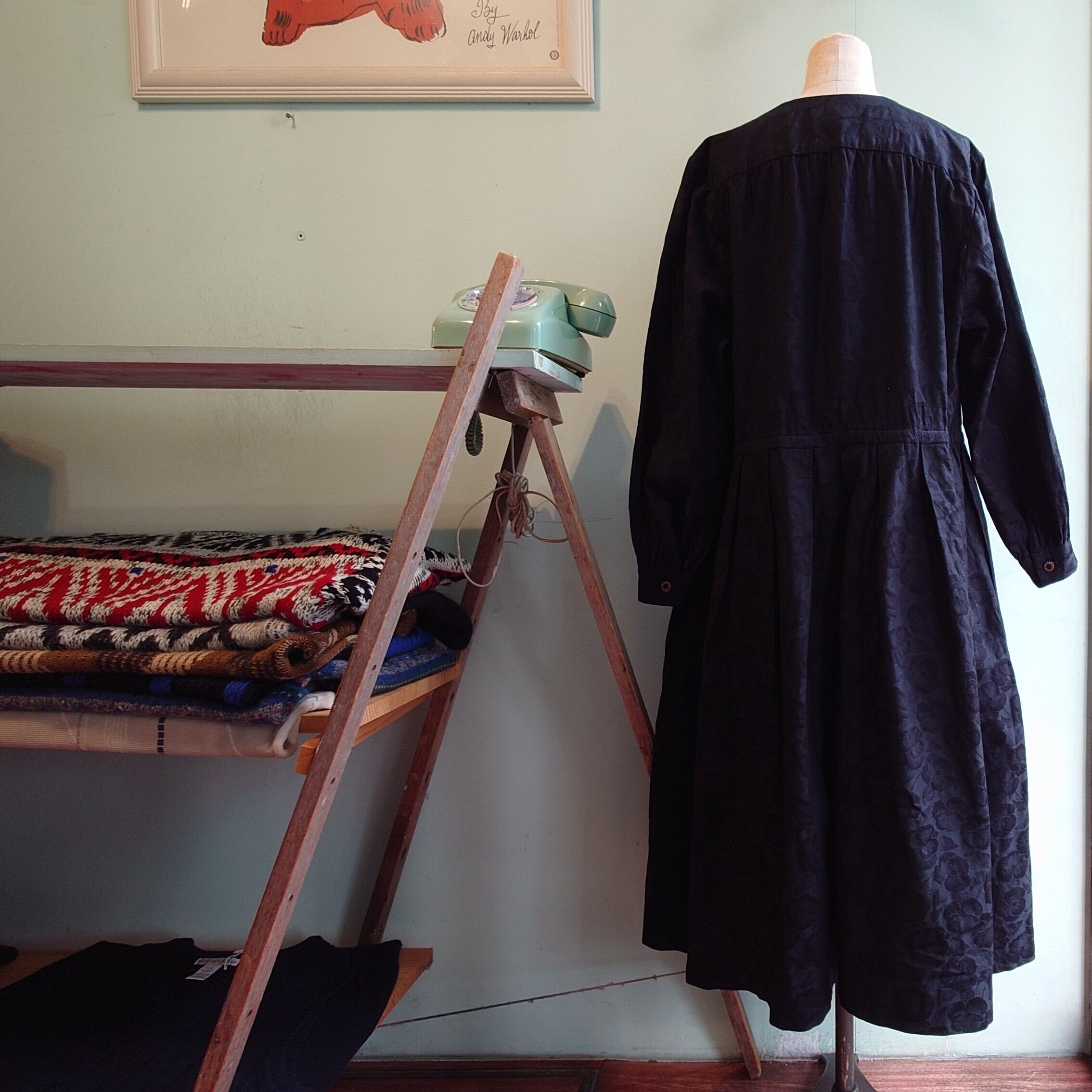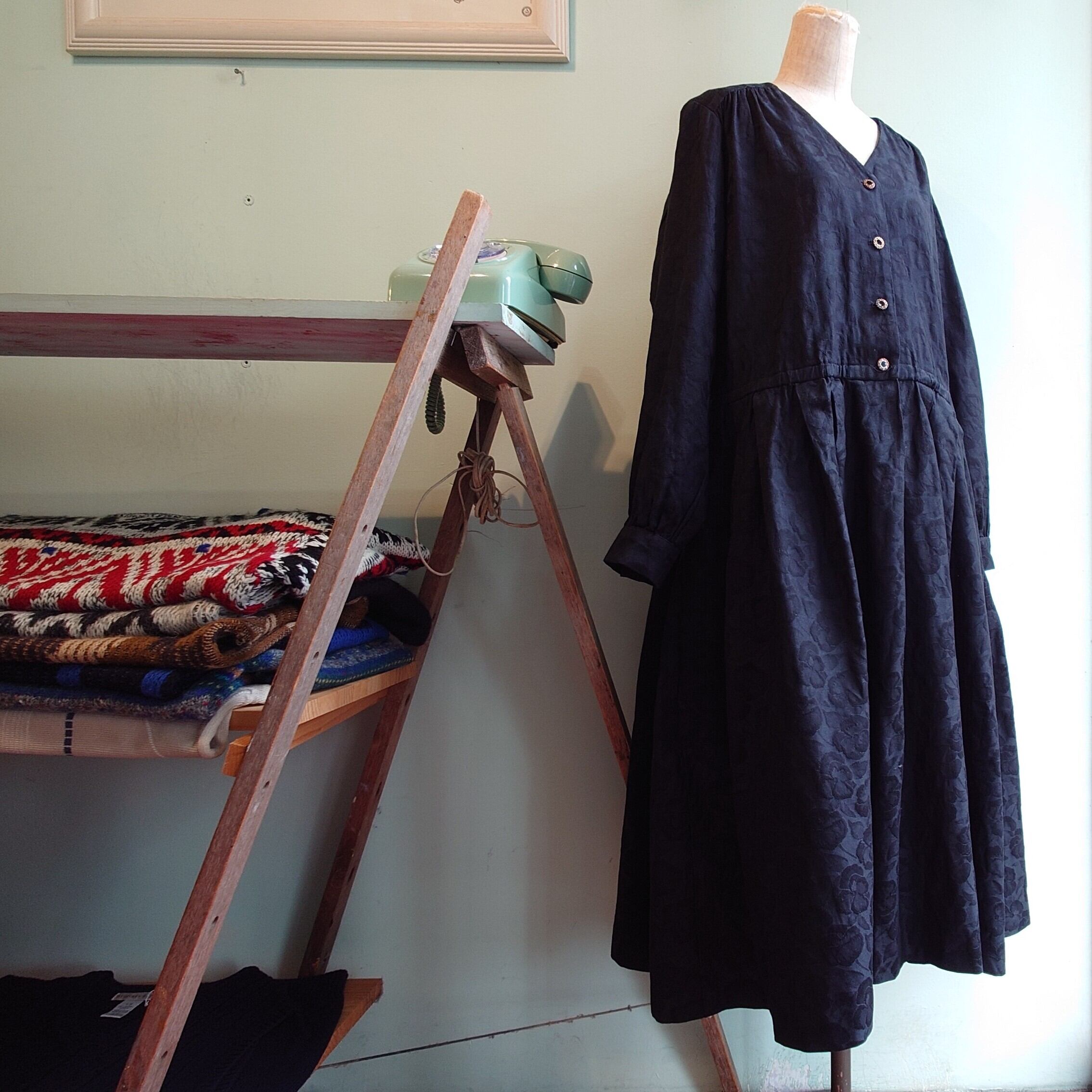 体がコロンと包まれるような、シルエットがかわいいヴィンテージドレス。カラスのようなブラックにはワントーンで花柄いり。レーヨンやポリとは違い、コットン素材も珍しく、崩れ感よりも丸さが際立つ可愛さ。特別感ある黒ワンピです。