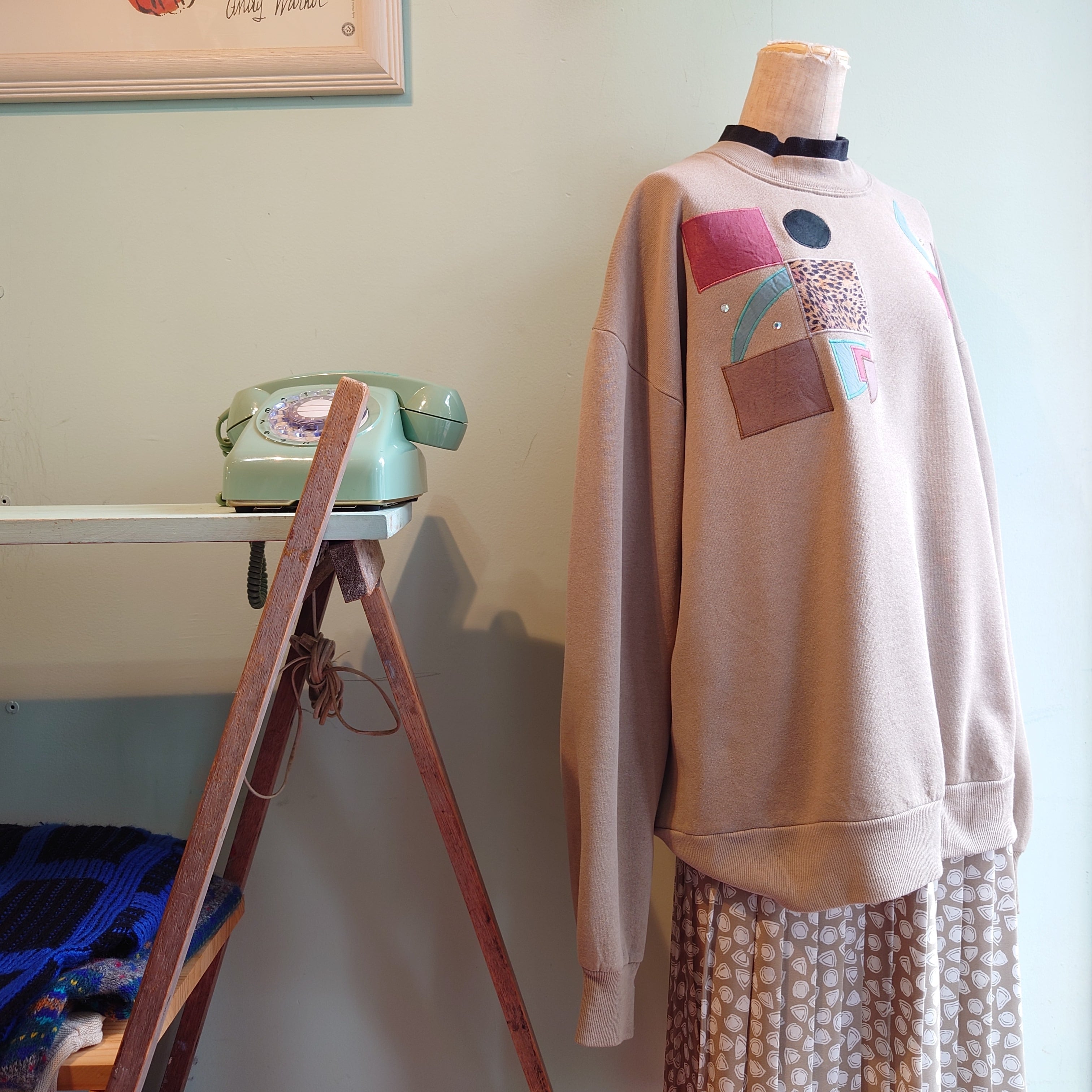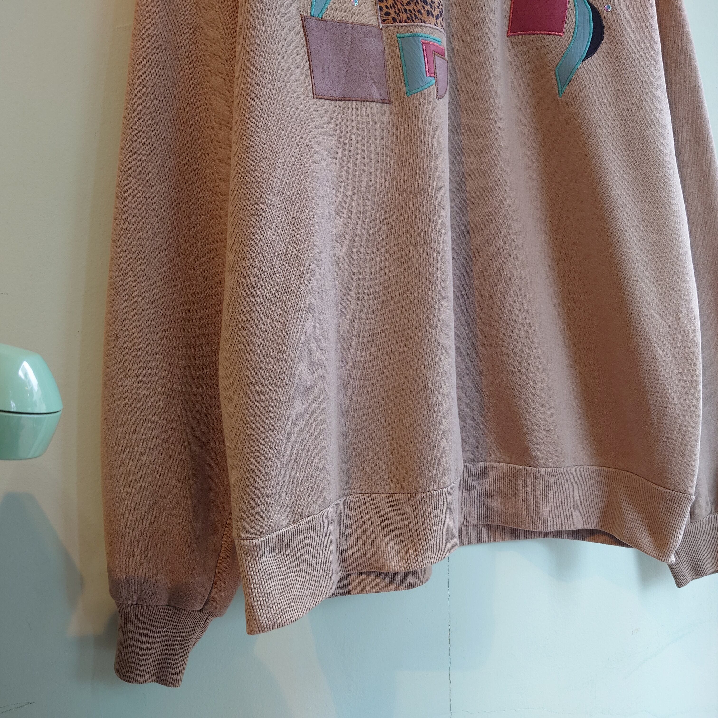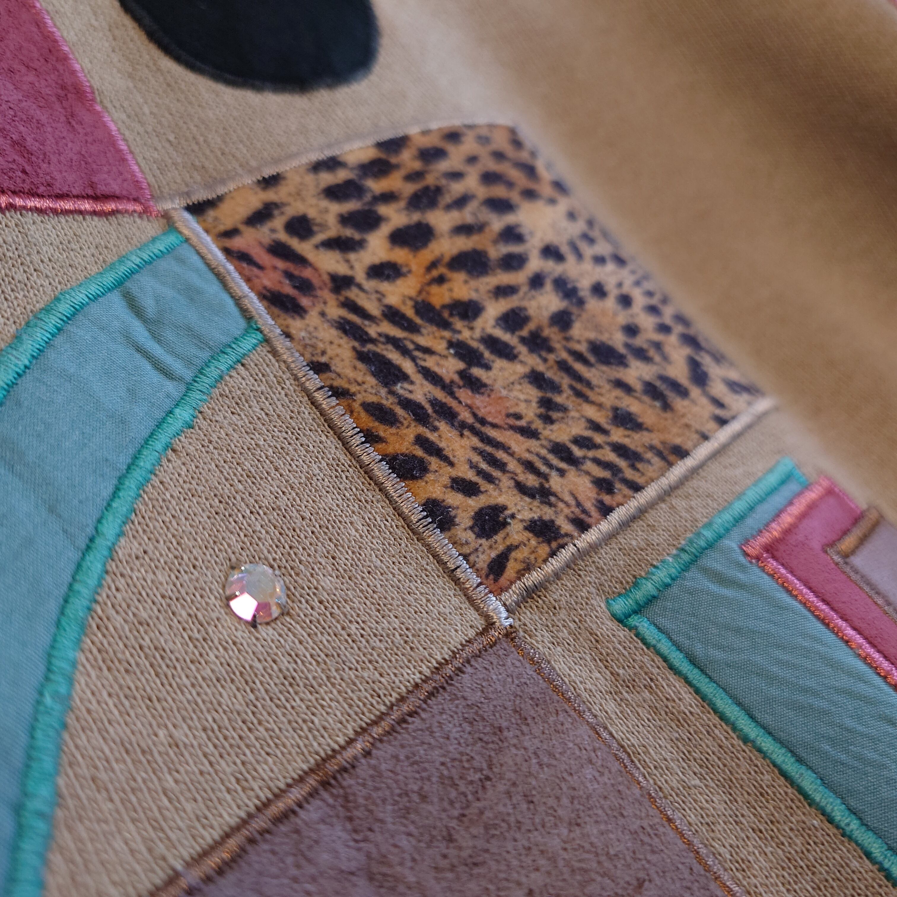 カントリー系やガーリー系とは一味違う、パッチワークデザインがかわいいデコレーションスウェット。ベージュボディーも珍しく、アーシーな色合いにレオパード柄が入ることでほんのりアフリカンテイストも。アップリケはスウェードテイストの異素材。ブラックのうち襟付きで可愛いながらピリッと引き締まった雰囲気も。