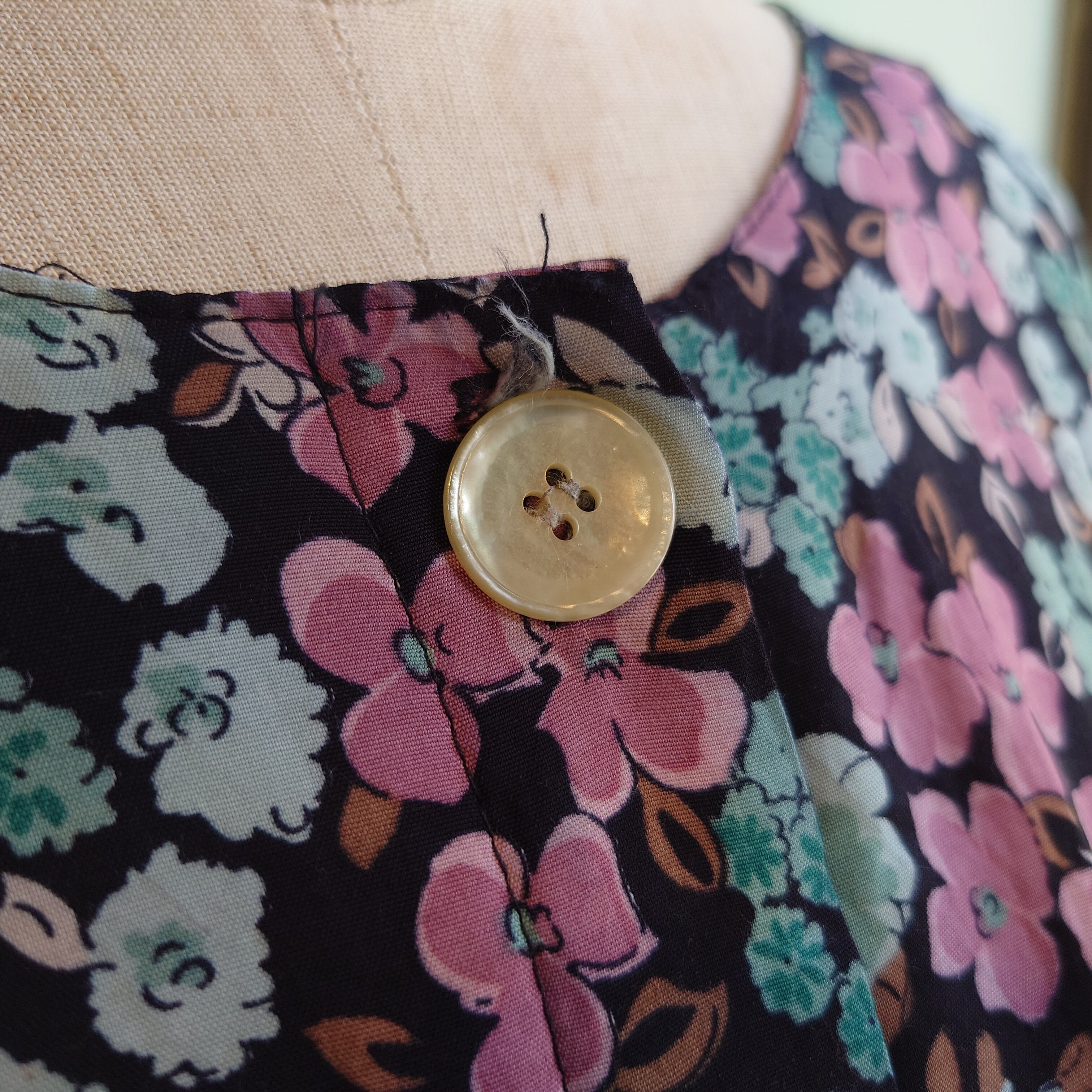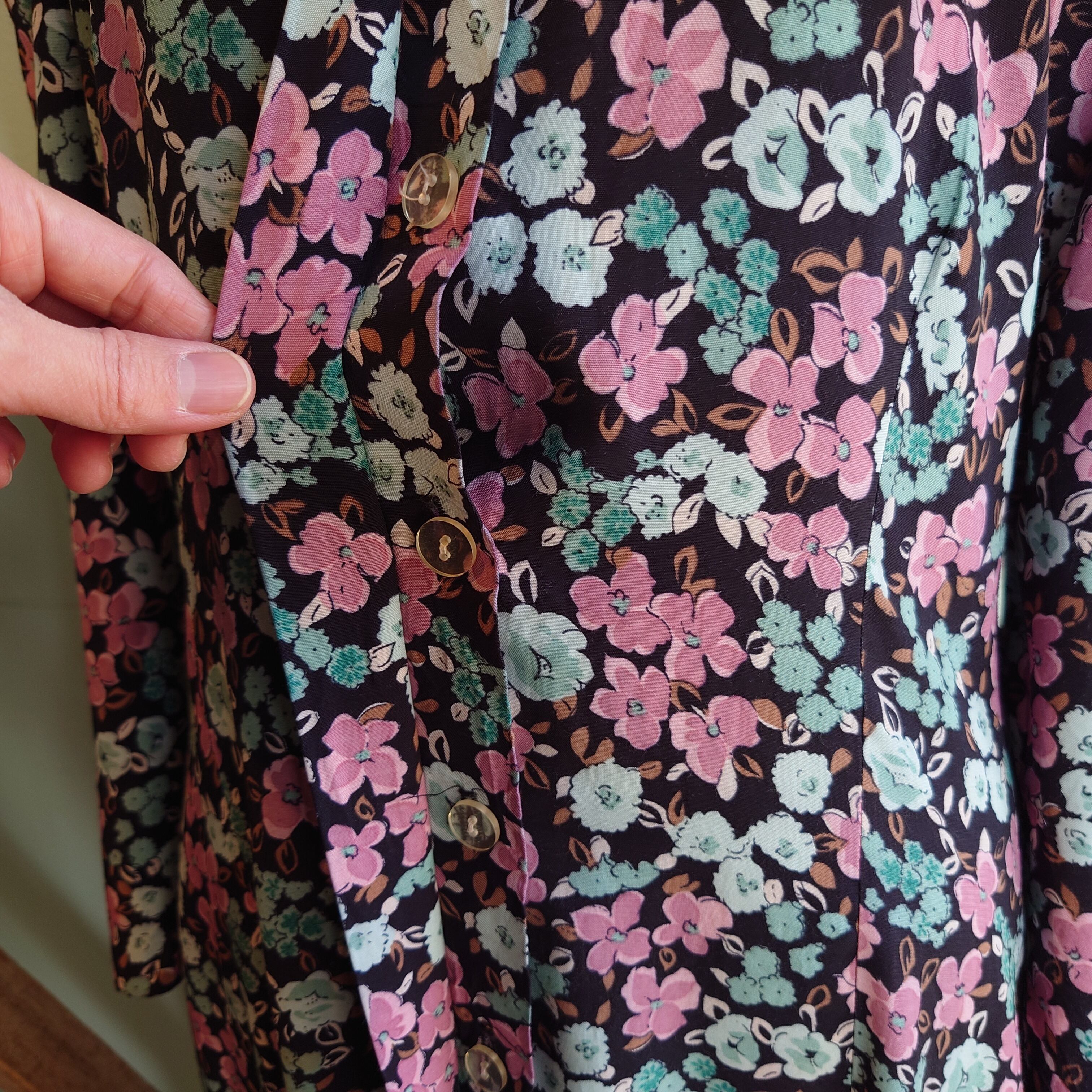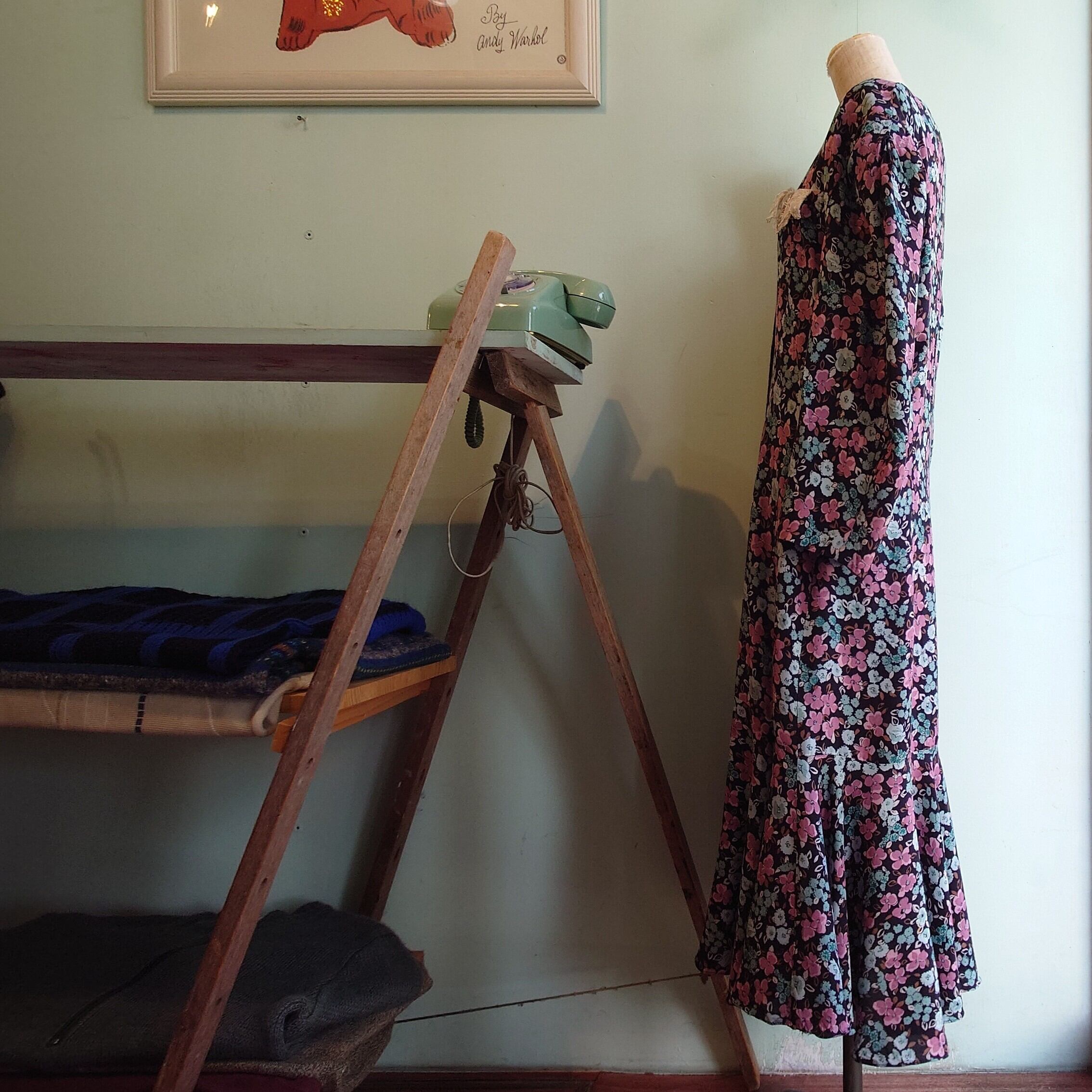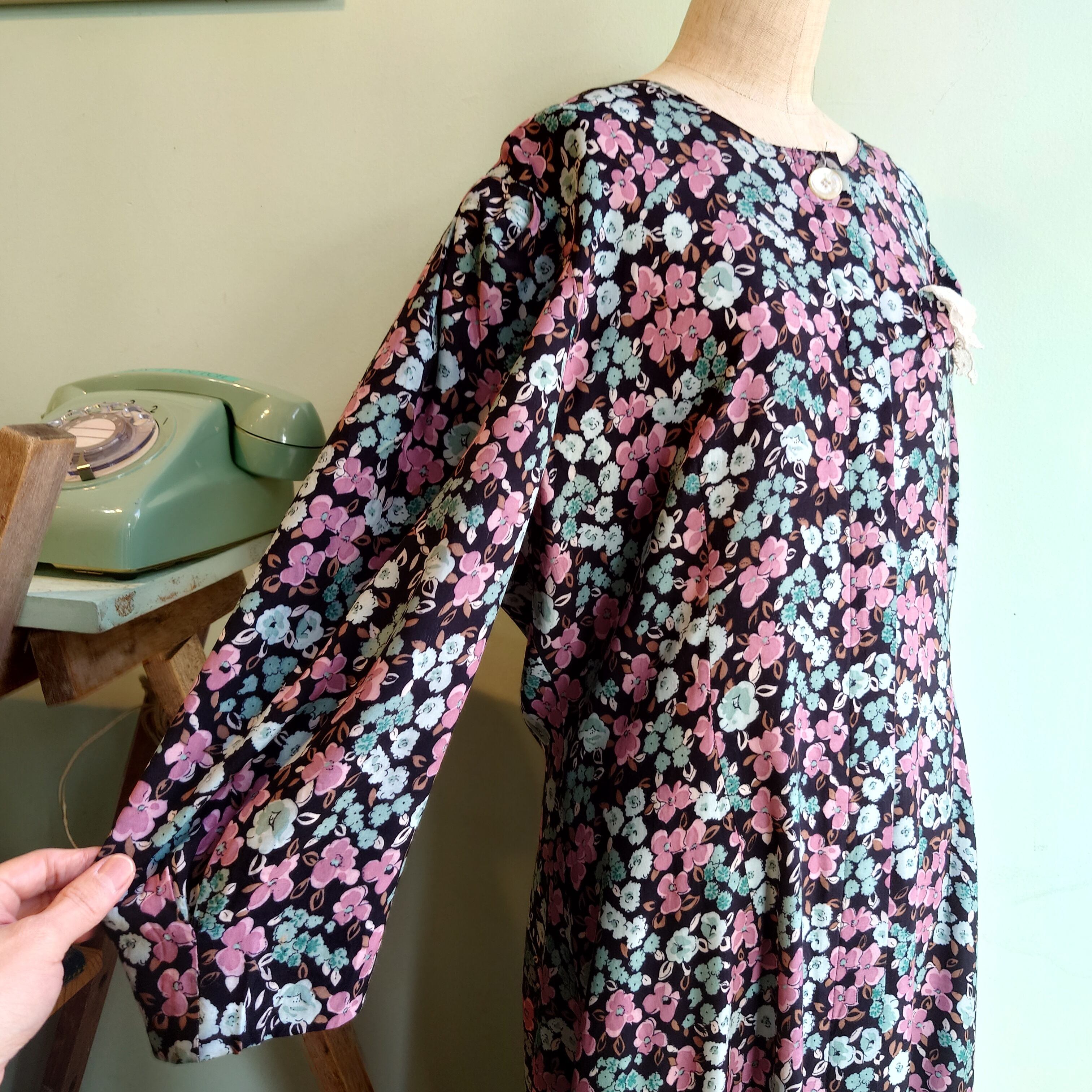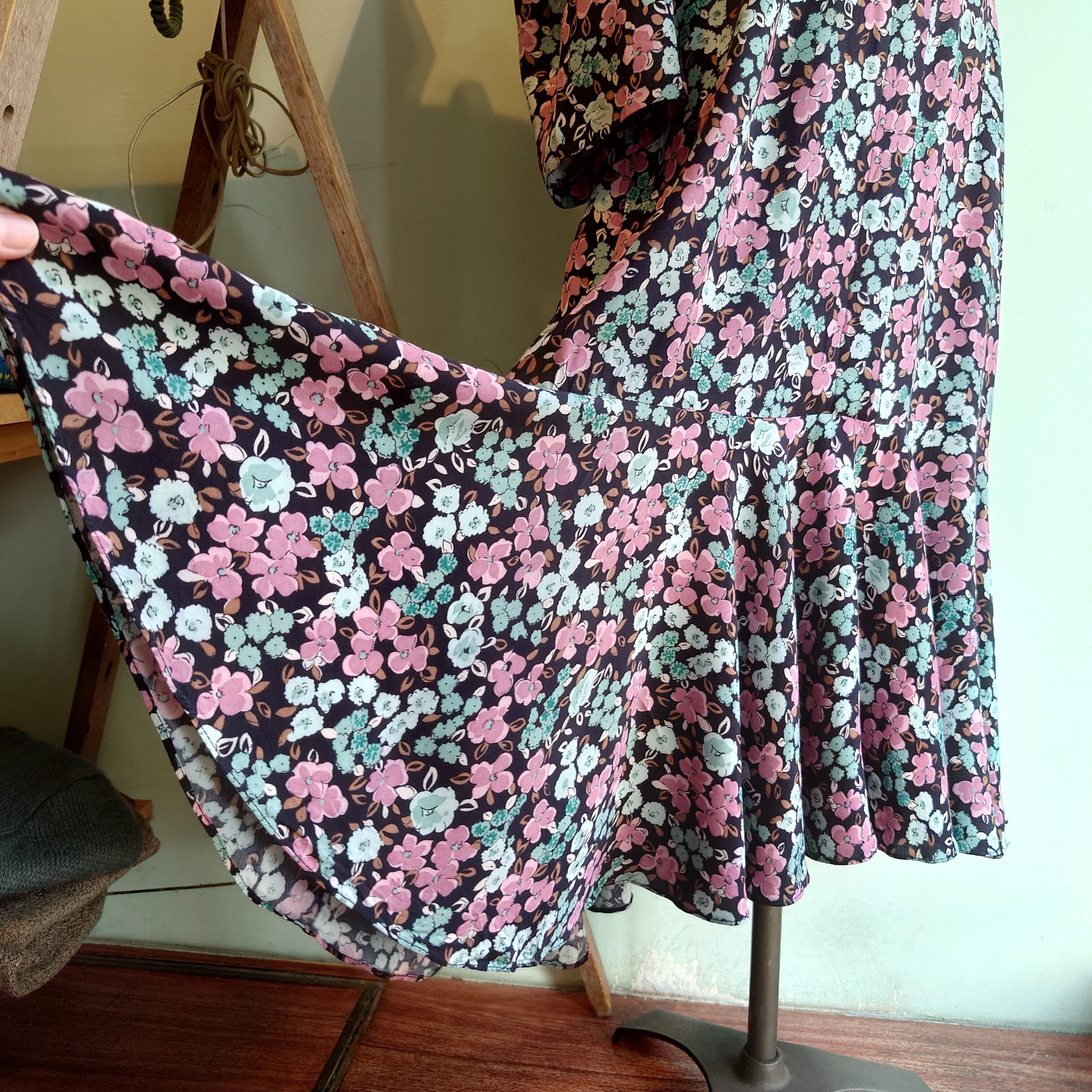 ヴィンテージ系では珍しい、マーメイドタイプのワンピース。黒にピンク、グリーン系の花柄、レーヨンのテロっとしたドレッシー系。トップボタン以外は比翼タイプのプルオーバーで、より裾のフレア感が際立つデザイン。胸にはレースのチーフ付き。