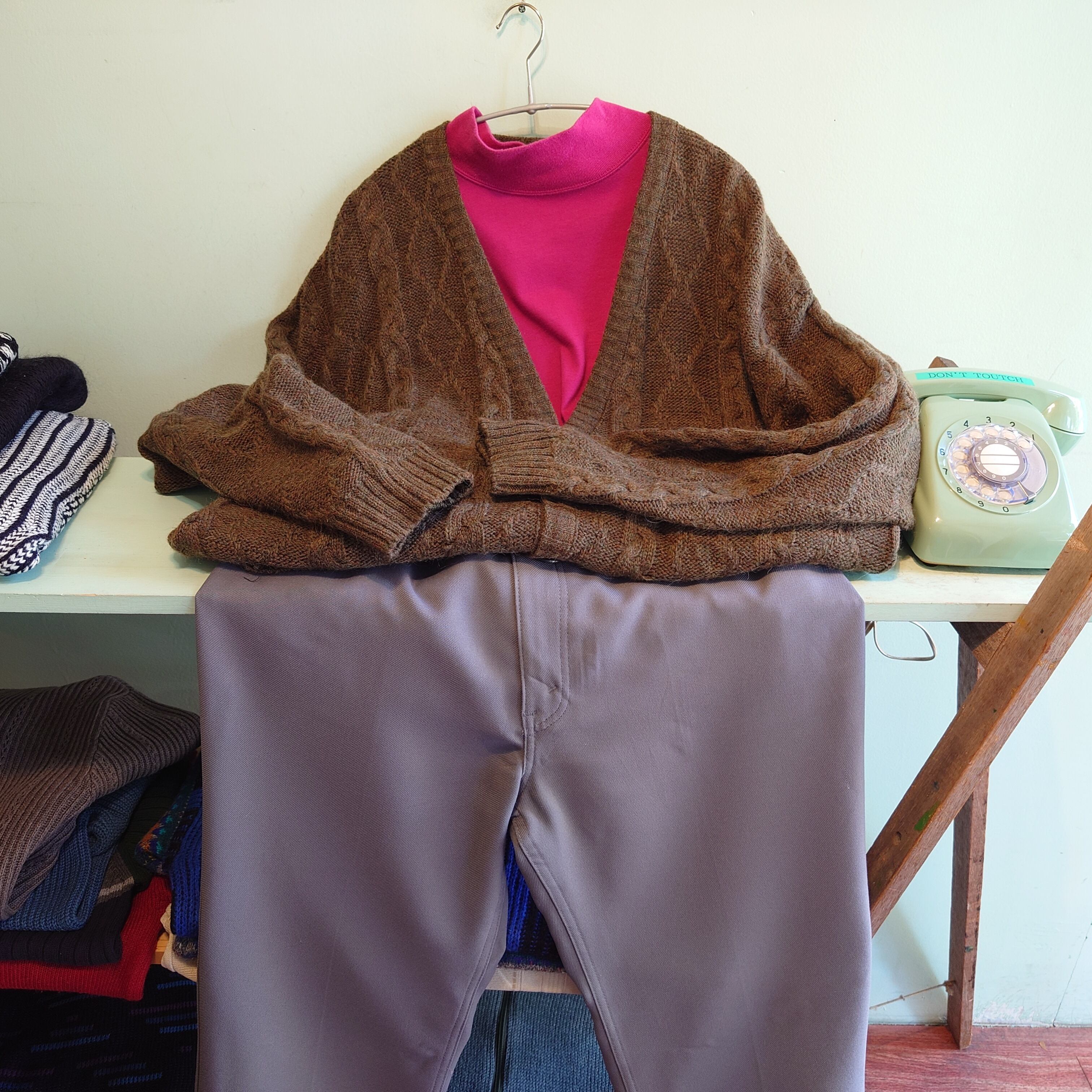 フランス製のヴィンテージカーディガン。ブラウン系に見えつつ、毛糸はオレンジやグリーンも絡み合う個性溢れる色味。フィッシャーマンを思わせるケーブル編みはざっくりしっかりしつつ、アクリル混ならではの軽さも。フロントに付いたポケットも嬉しいポイント。