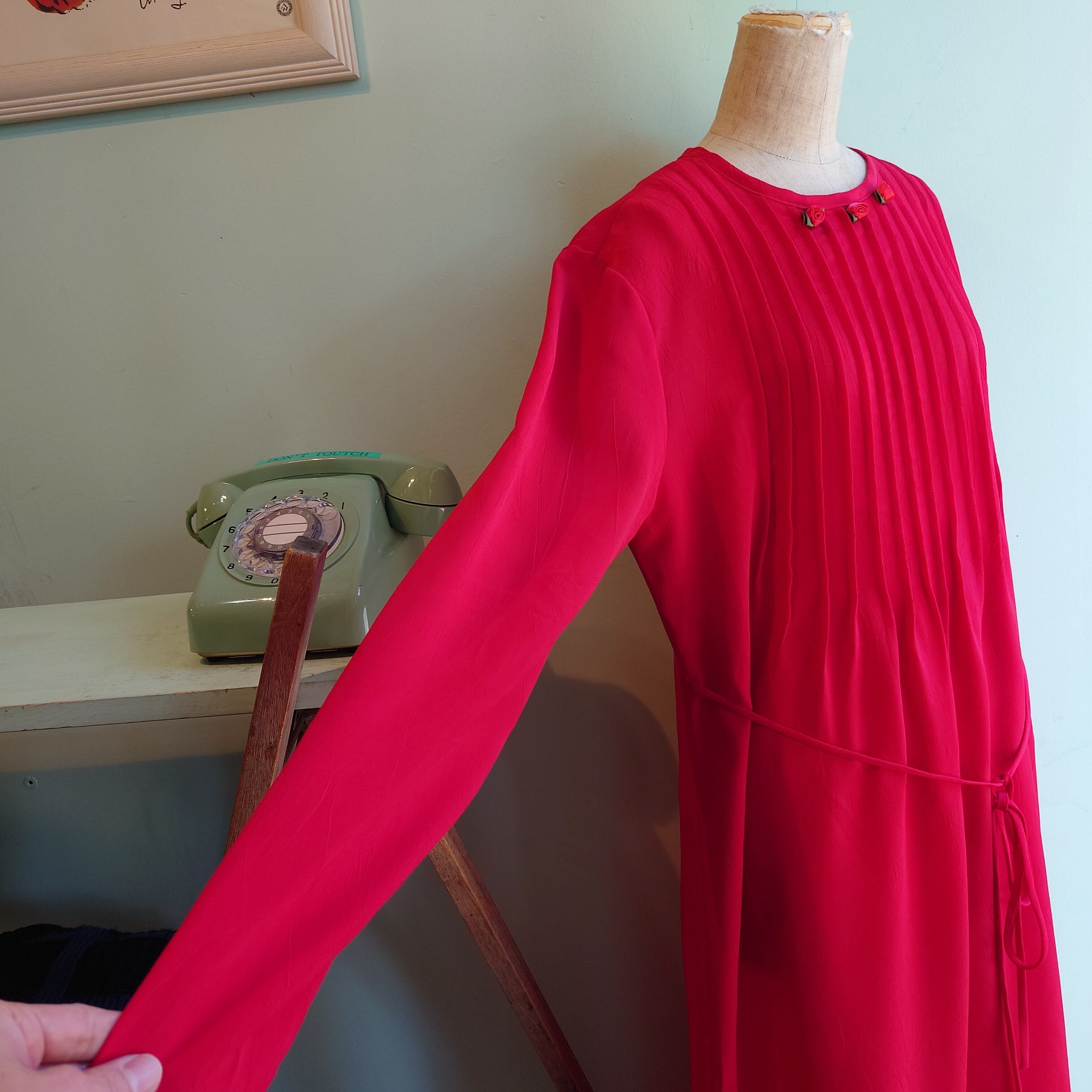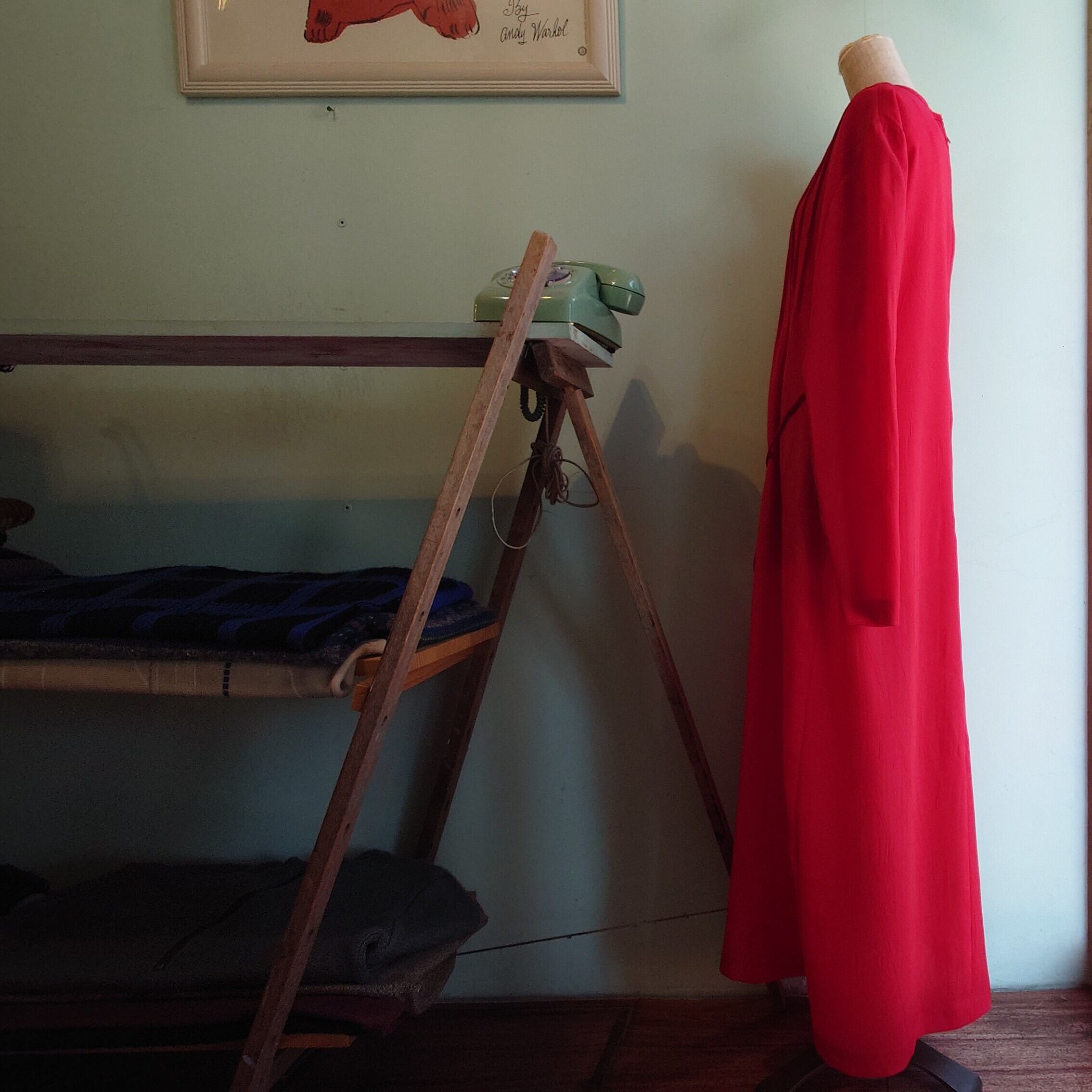 前ひだ付き、真紅のヴィンテージワンピース。ゆったりとストンとフレアする緩めなシルエットから、紐で絞ればウエストしっかりのレトロ系まで変化自在。ガーゼのようなさらっとした薄手素材は、さり気なく絞り柄いりで、カラフルだけど大人っぽさも。バラのアクセントはピンでつけられているので取り外しもOK。
