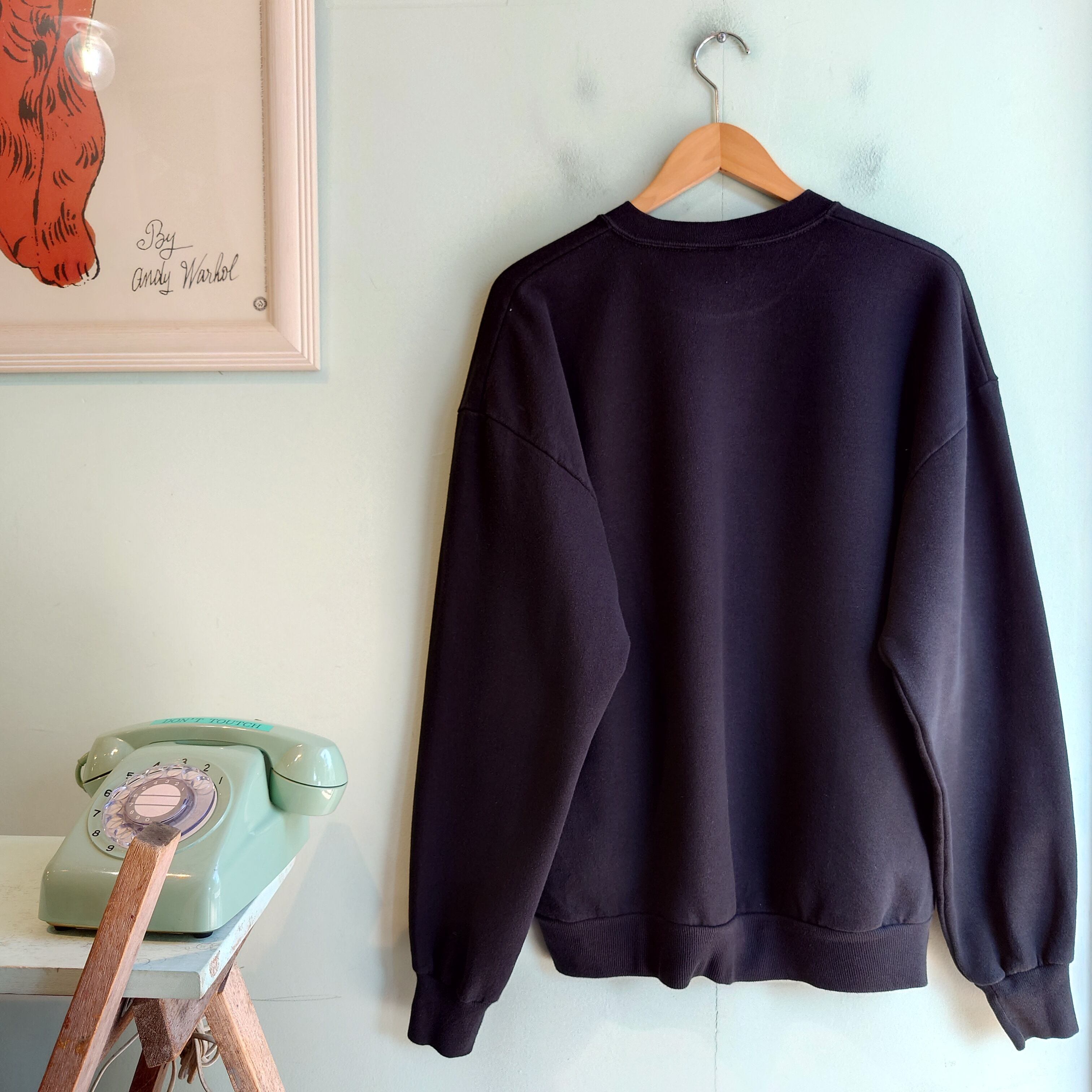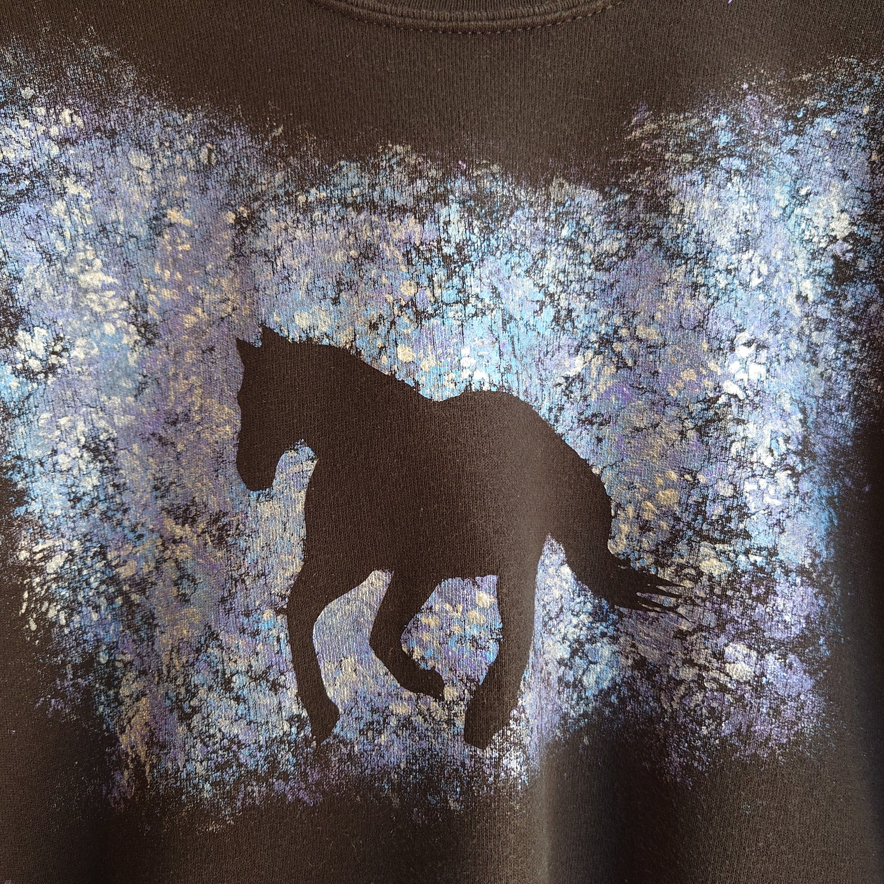 青紫色のマーブル系柄の真ん中に、馬の影絵が浮かび上がる幻想でアートが美しいヴィンテージスウェット。アニマルスウェットの可愛さや、ガーリー系のキュートさとは一味違うクールさも持ち合わせた一枚。特別感ある黒スウェットです。