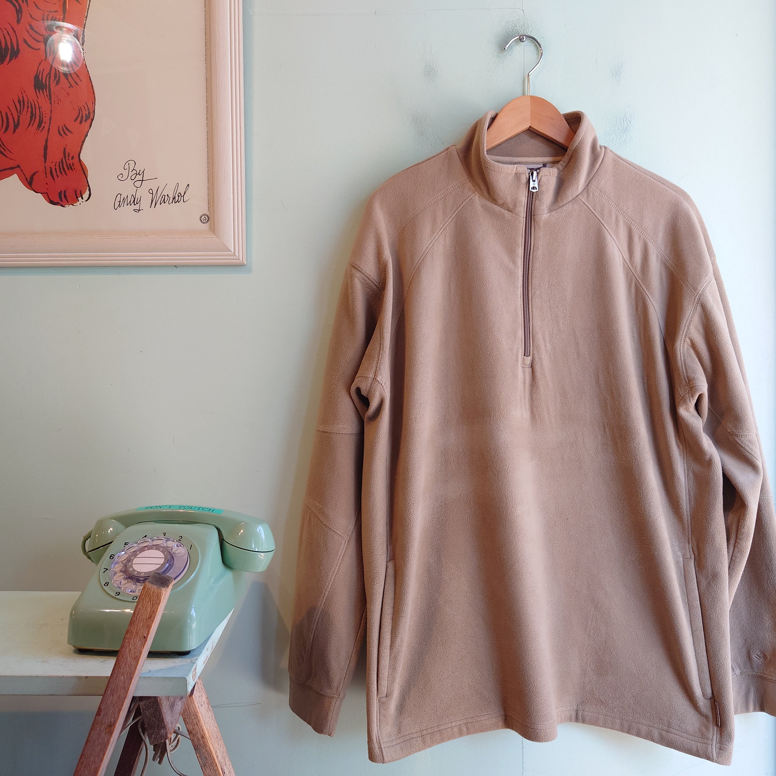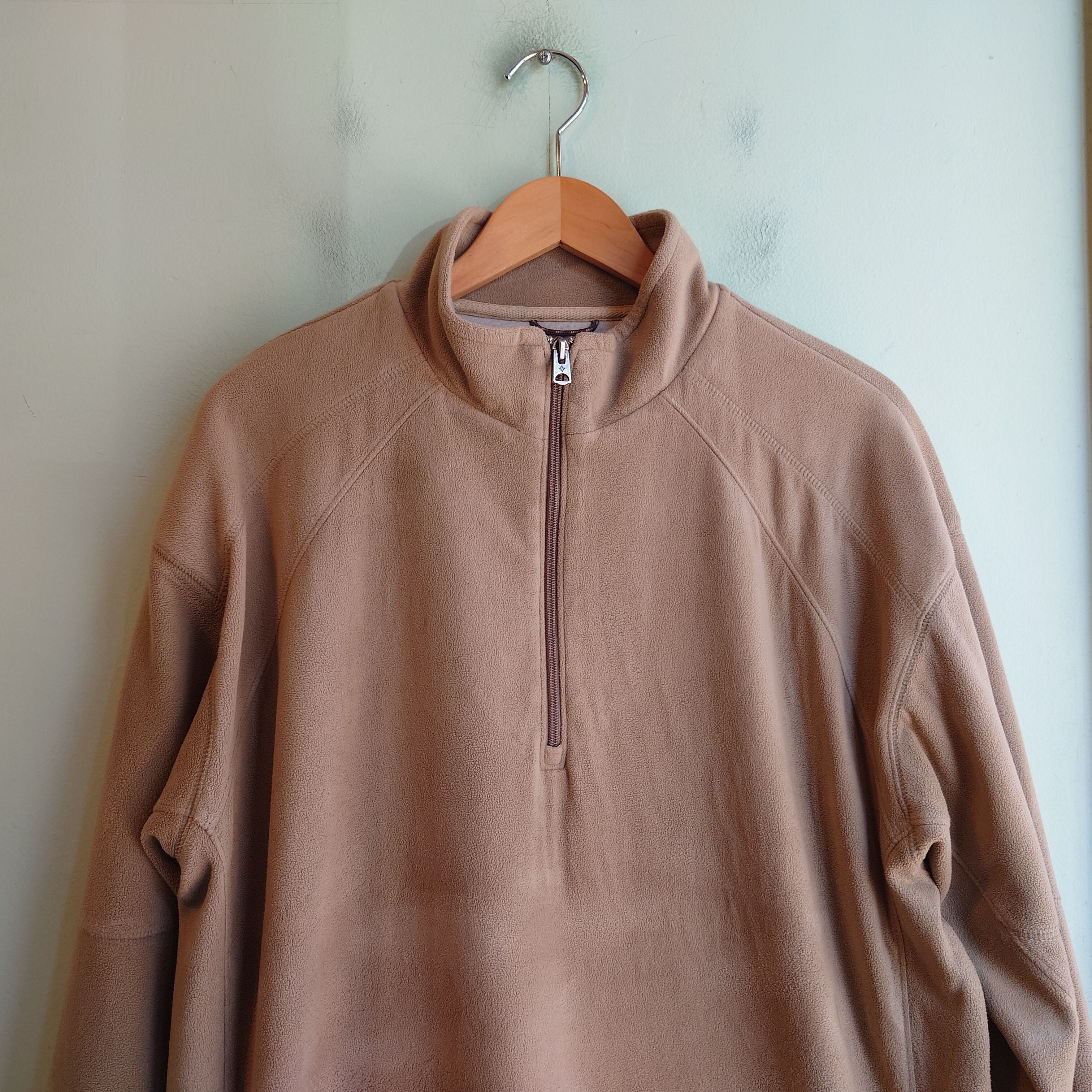 スニードジャックスタイルをフリース素材に置き換えたような、アウター系のフリースハーフジップ。巧みな切り替えらスポーティーながら、アーシーなベージュがミルキーでかわいい。なめらかなマイクロ系フリースながら、コットンのような裏地が付いたレアタイプで、見た目よりもしっかり暖かい。ブランドロゴは袖に。