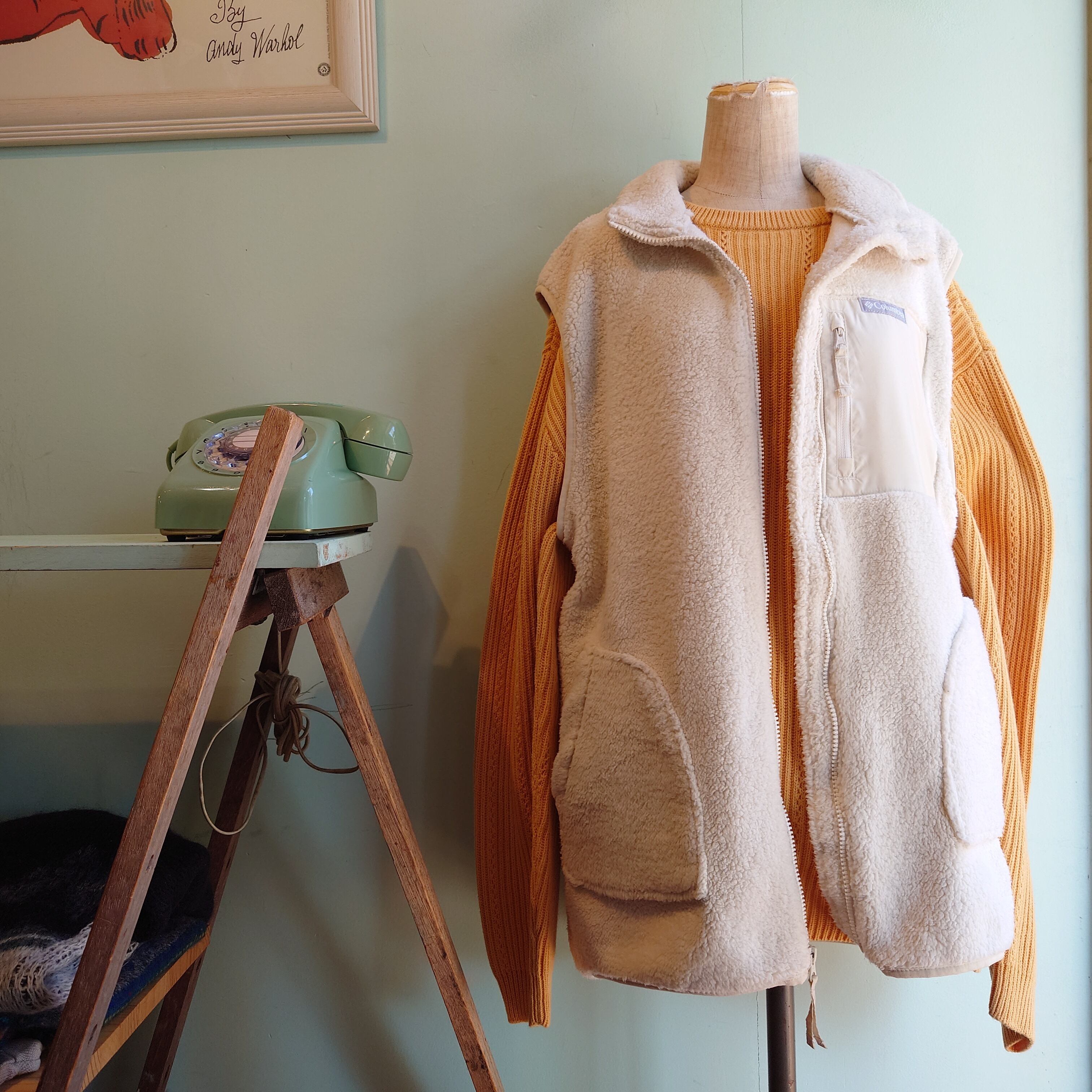 柔らかなボアフリースと、フレッシュなミルク色に惹かれるColumbiaのフリースベスト。通常の仕様よりもポケットや、後ろ側長めなダックテールなど、ユニセックスな雰囲気に寄せたレアタイプ。左胸にはスムース生地の切り替えいりで、ピリッと引き決まった印象も。