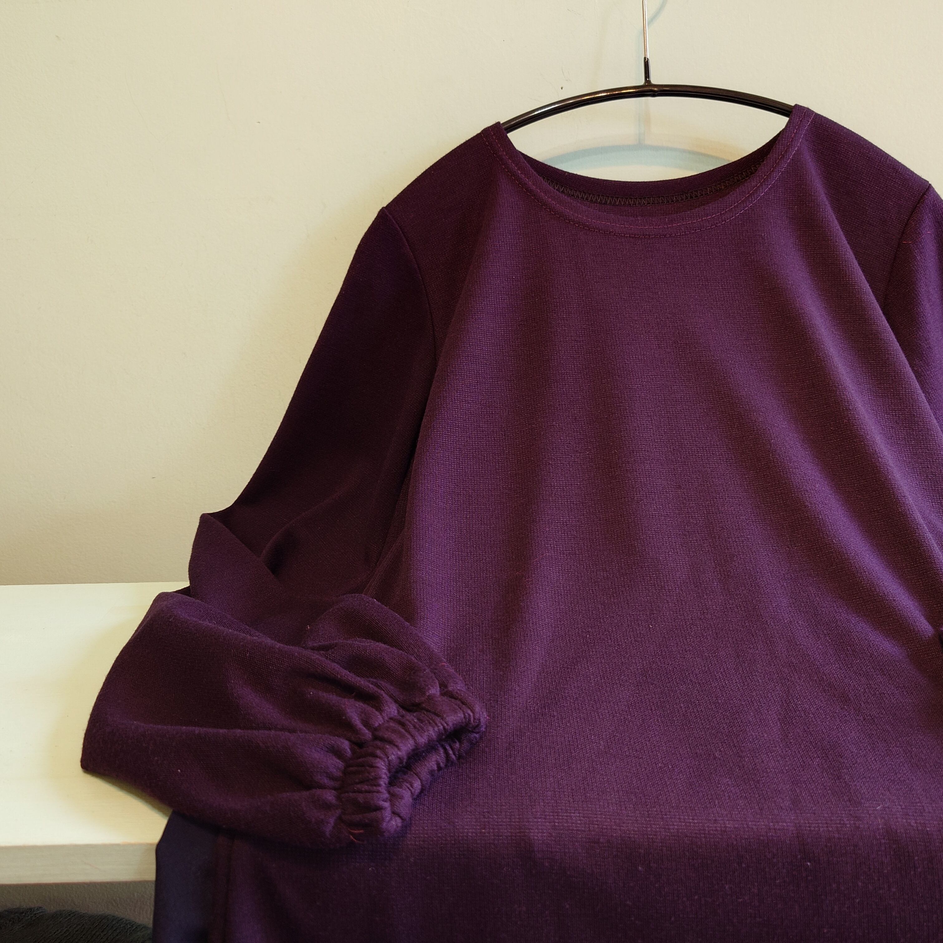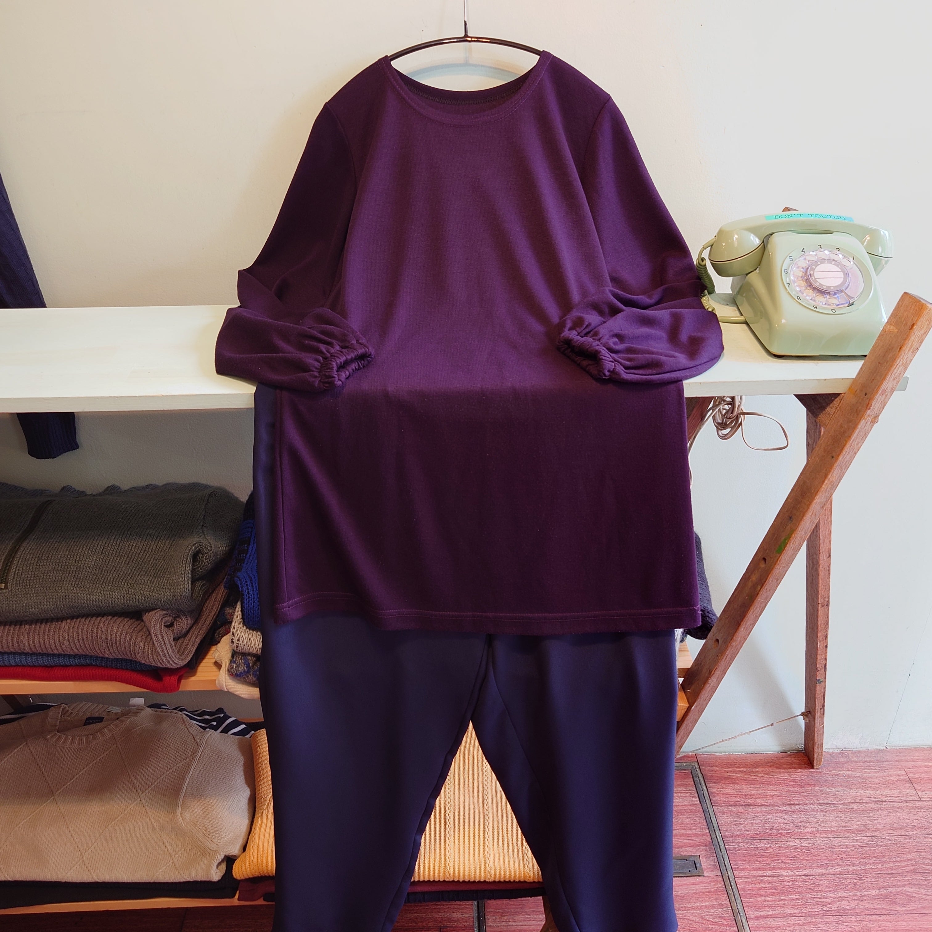 ほんのり光沢感のある、ジューシーな紫がかわいいアクリル系のロングカットソー。薄手ながら保温性の高い生地感に、腰まで隠れる丈感も◎。そではボタンや切りっぱなしではなく、ゴム入りで袖回りがブラウジングされたシルエットに。