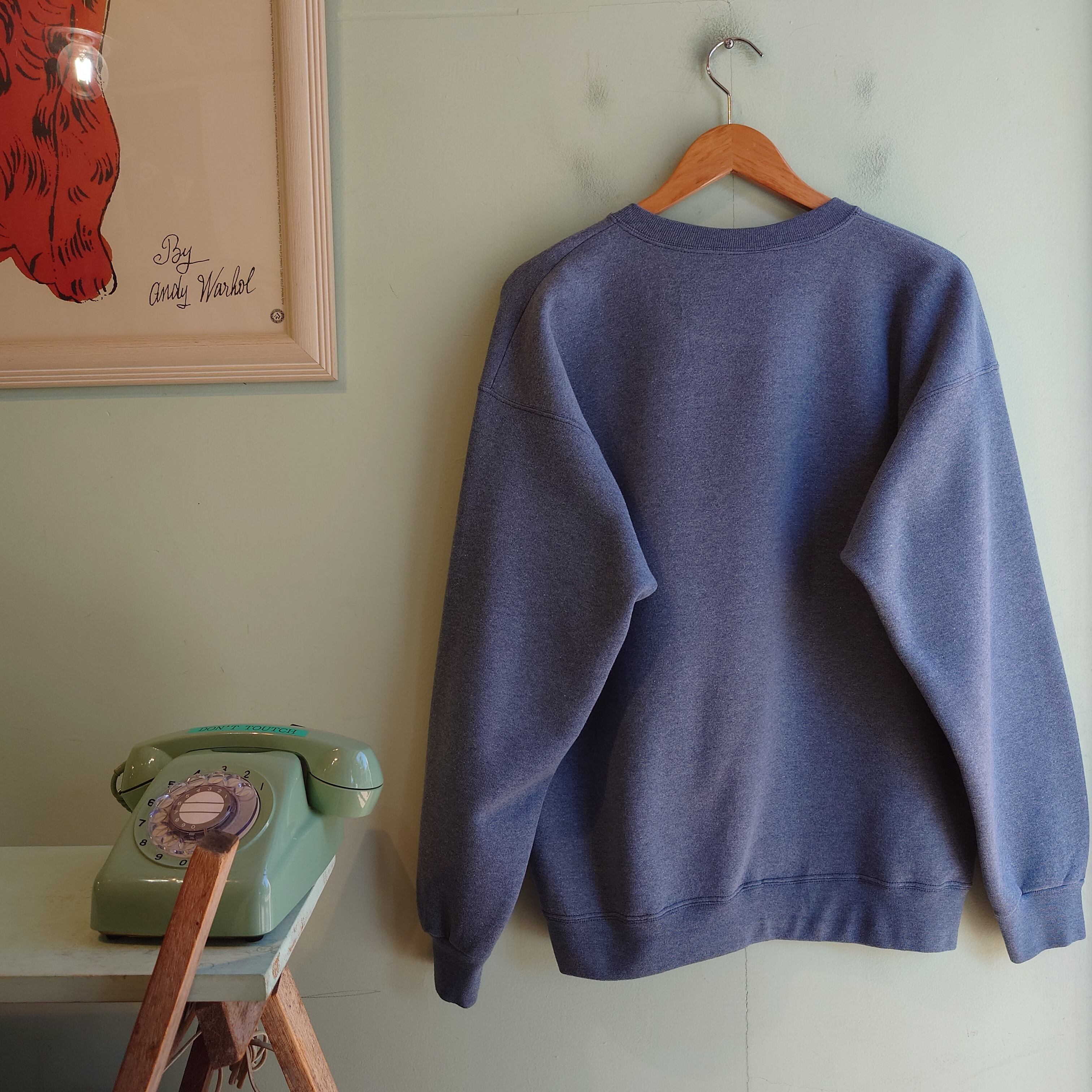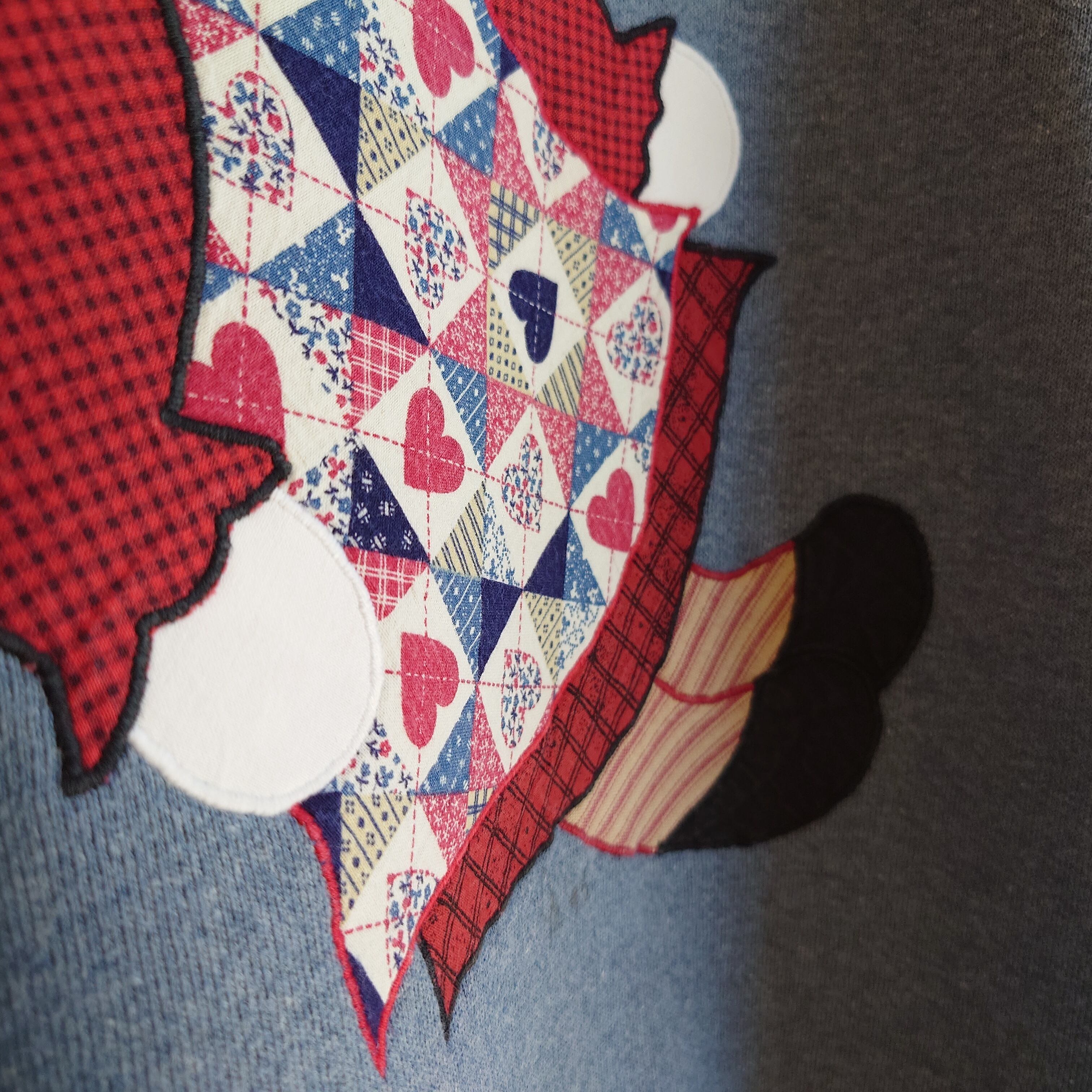 ラガディ・アン人形をモチーフにした、デコレーション系のヴィンテージスウェット。カントリーキルト風の人形には、ボタンの目、立体的な赤髪など、パッチワーク風デザインがかわいい。デコレーション系では珍しい、ブルーグレーも最高。