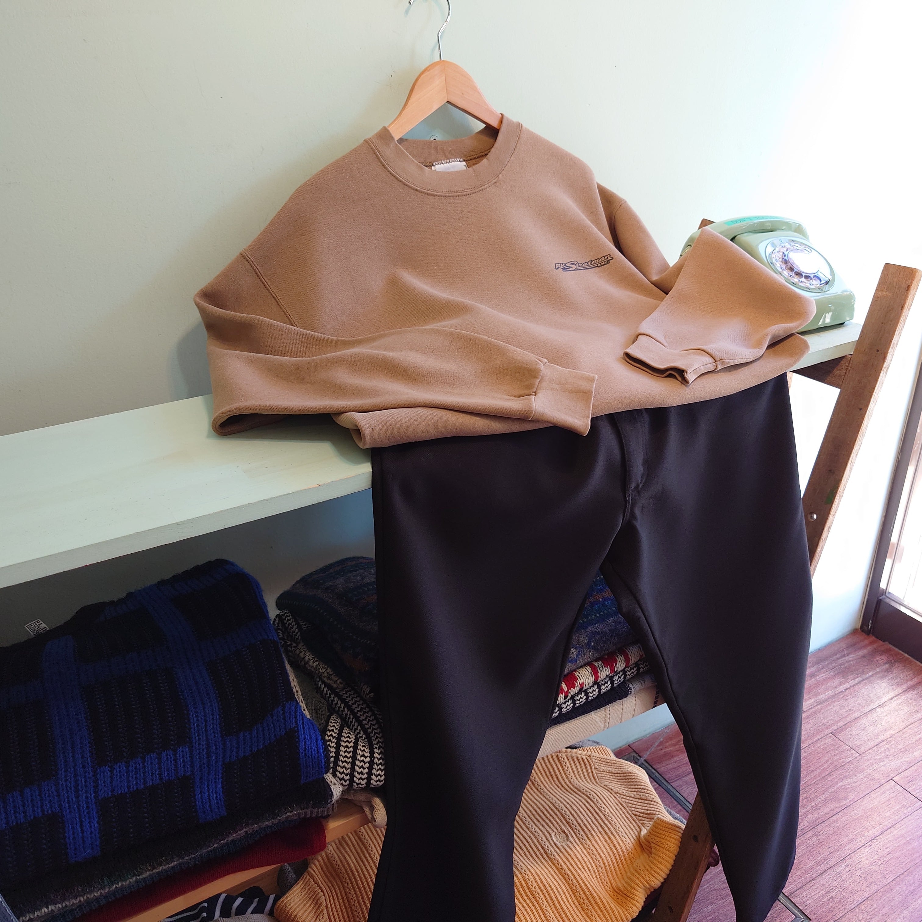 主にハーレーダビッドソンのTシャツのサプライヤーとして有名な、"RK Stratman"のロゴスウェット。意外なベージュと、モーター系を思わせるシンプルなロゴに惹かれる一枚。リーのオールドボディーもコロンと味わいあり。