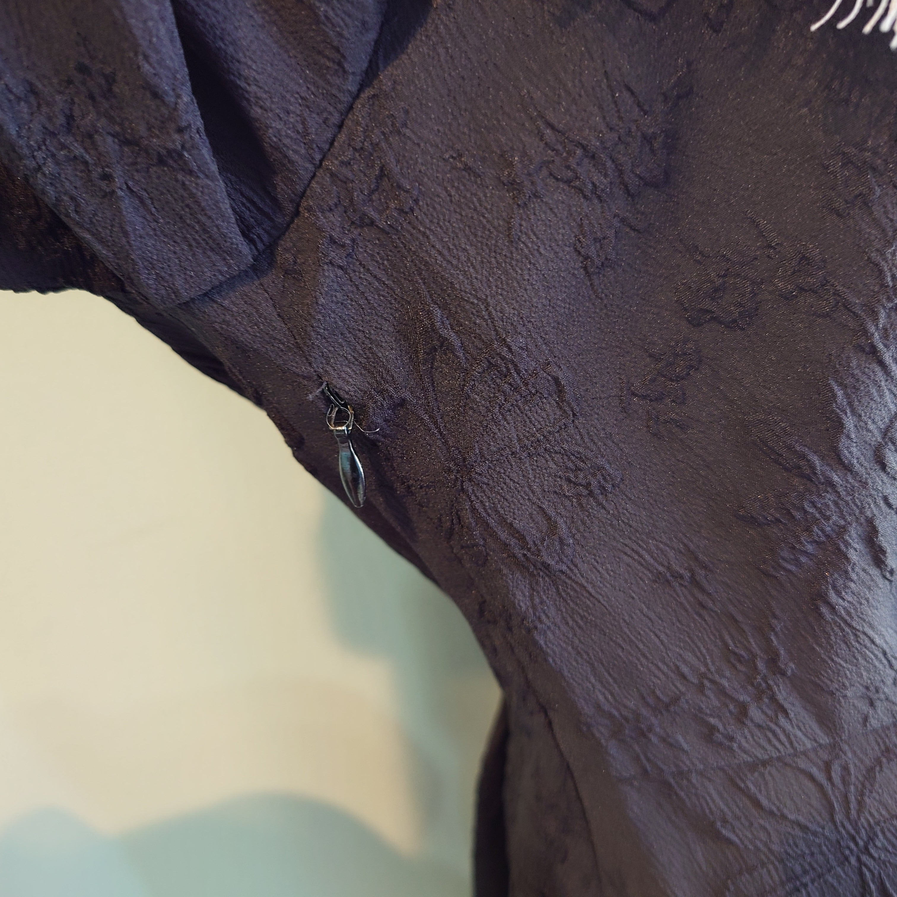 ワントーンで刺繍の花柄がドレッシーな、絞り素材のワンピース。セーラー風の襟にはチャイナ風の刺繍と、大きめなレース、袖の両面にもレースつき。シルエットはゆるっと広がり感が広めなひらひらフレア。一味違うチャイナワンピースです。