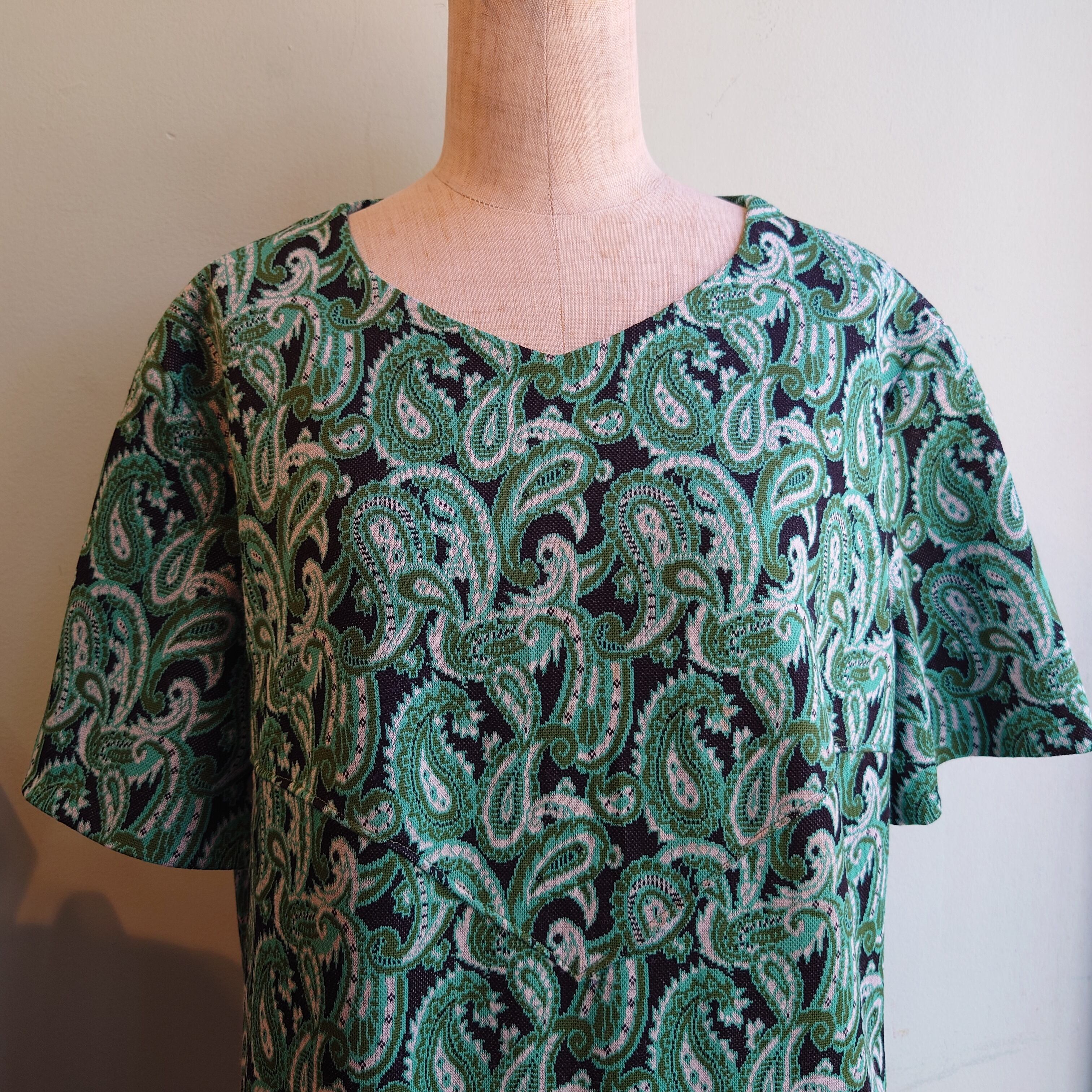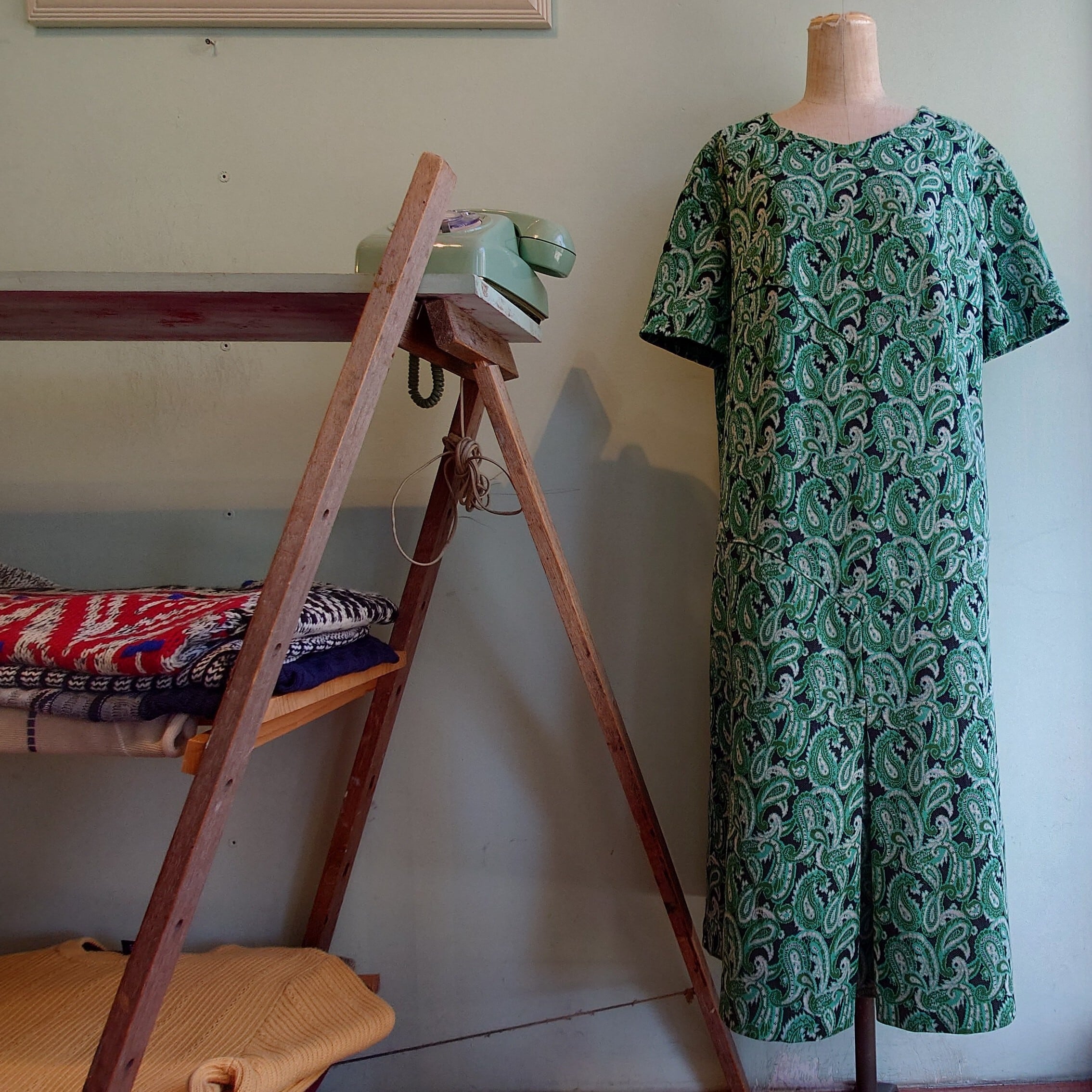 ◎〜70s vintage ペイズリー柄 スタプレ素材 ヴィンテージドレス 総柄ワンピース 緑系 プルオーバー