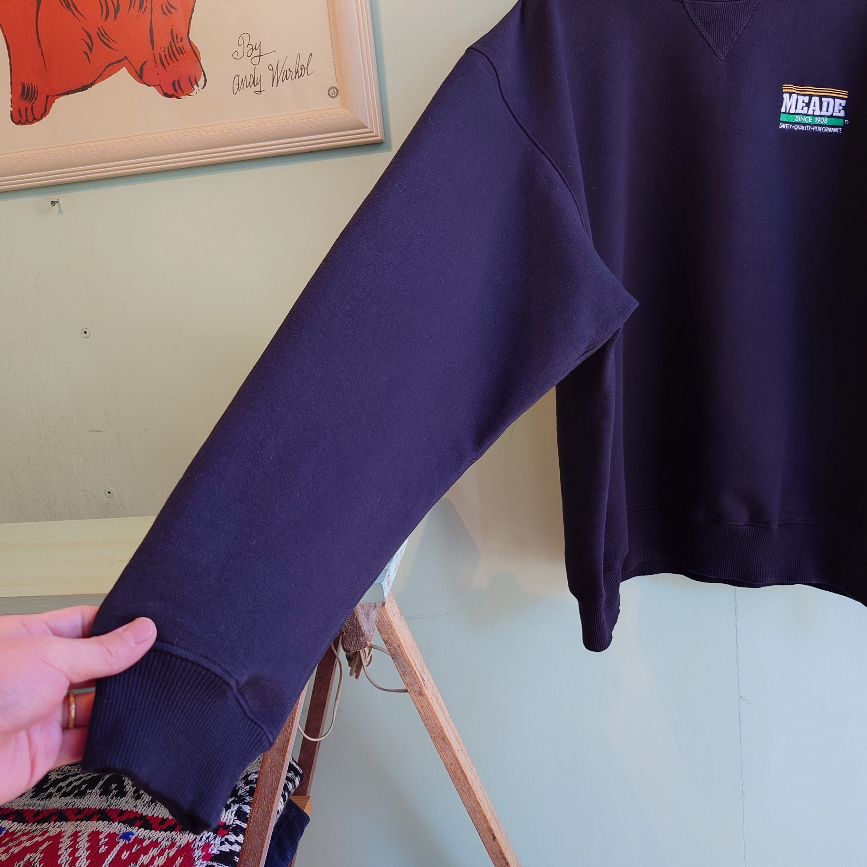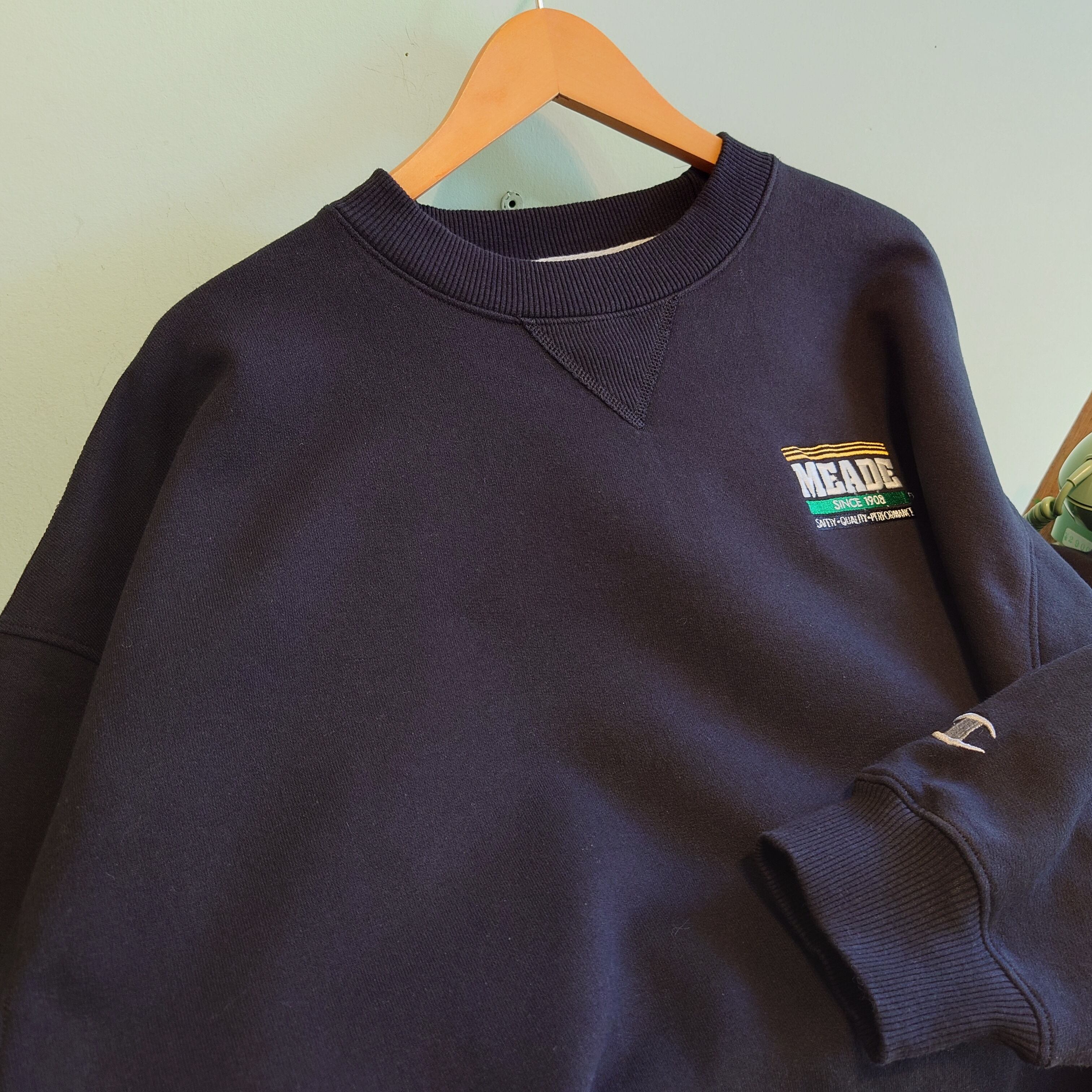 実在する産業メーカー、MEADE社のアドバタイジングスウェット。ガゼット付、袖にロゴ入りのざっくりシルエットが古着らしい。刺繍ロゴはボリューム感ある立派なタイプで、ミニマムながら存在感あり。シンプルだけどワークライクな雰囲気でかっこいいアイテム。
