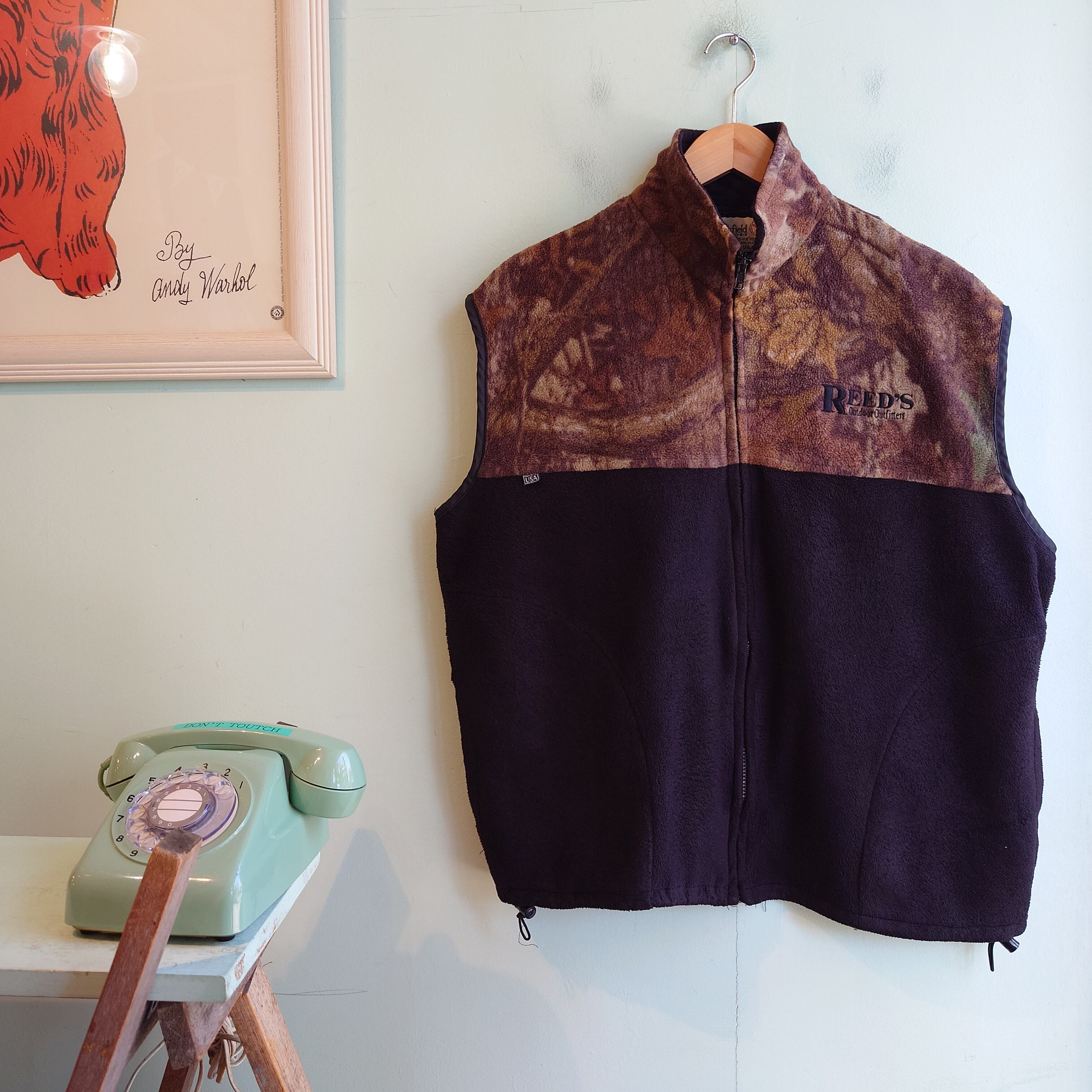 歴史あるアウトドアブランド、Clarkfield Outdoorsのフリースベスト。ロゴは取り扱いショップのもの。ツリーカモ×ブラックのバイカラーで、襟、ポケットの裏表の切り替えもセンスあり。フリースベストの気軽さに、ハンティングウエアらしいかっこよさが加わったナイスなフリースです。