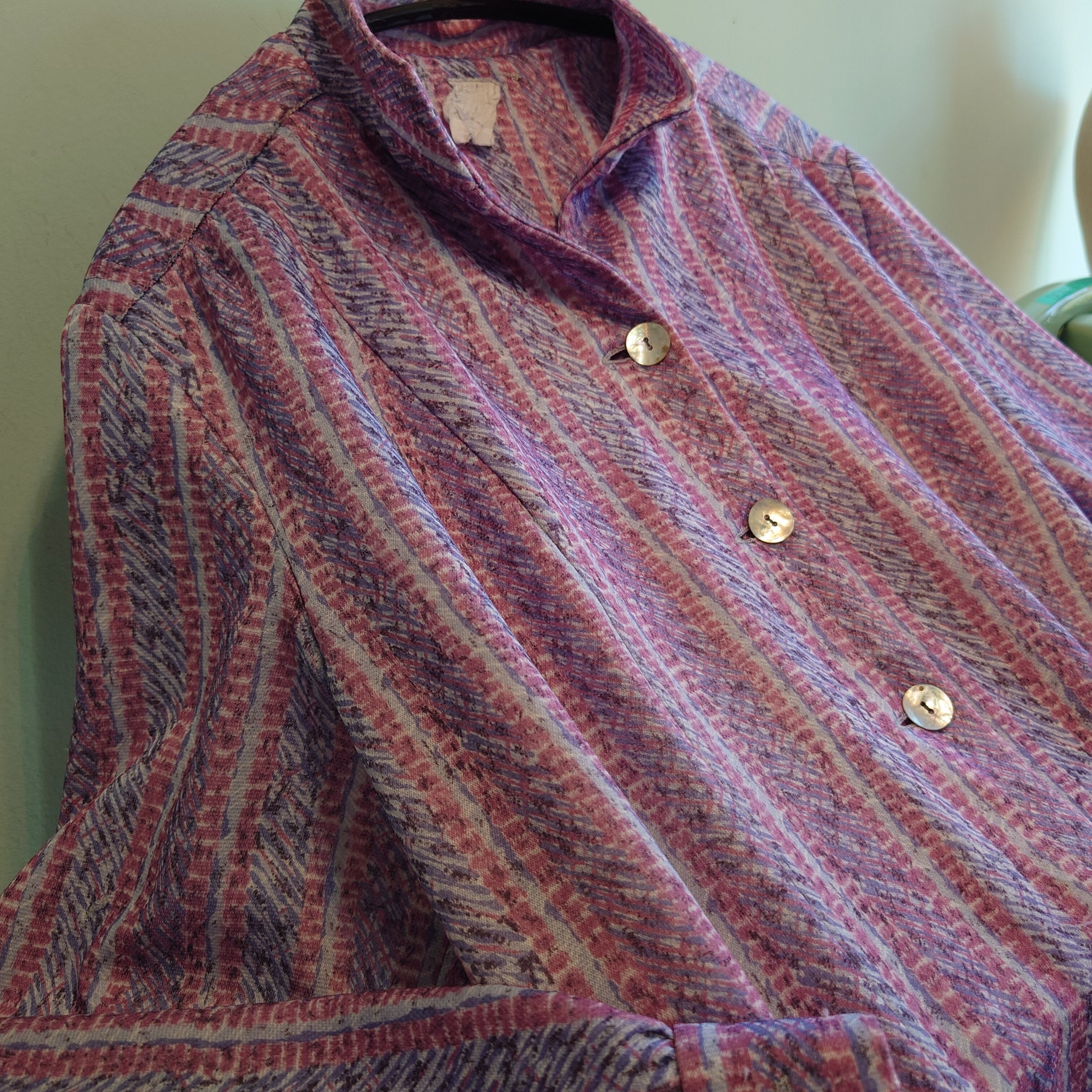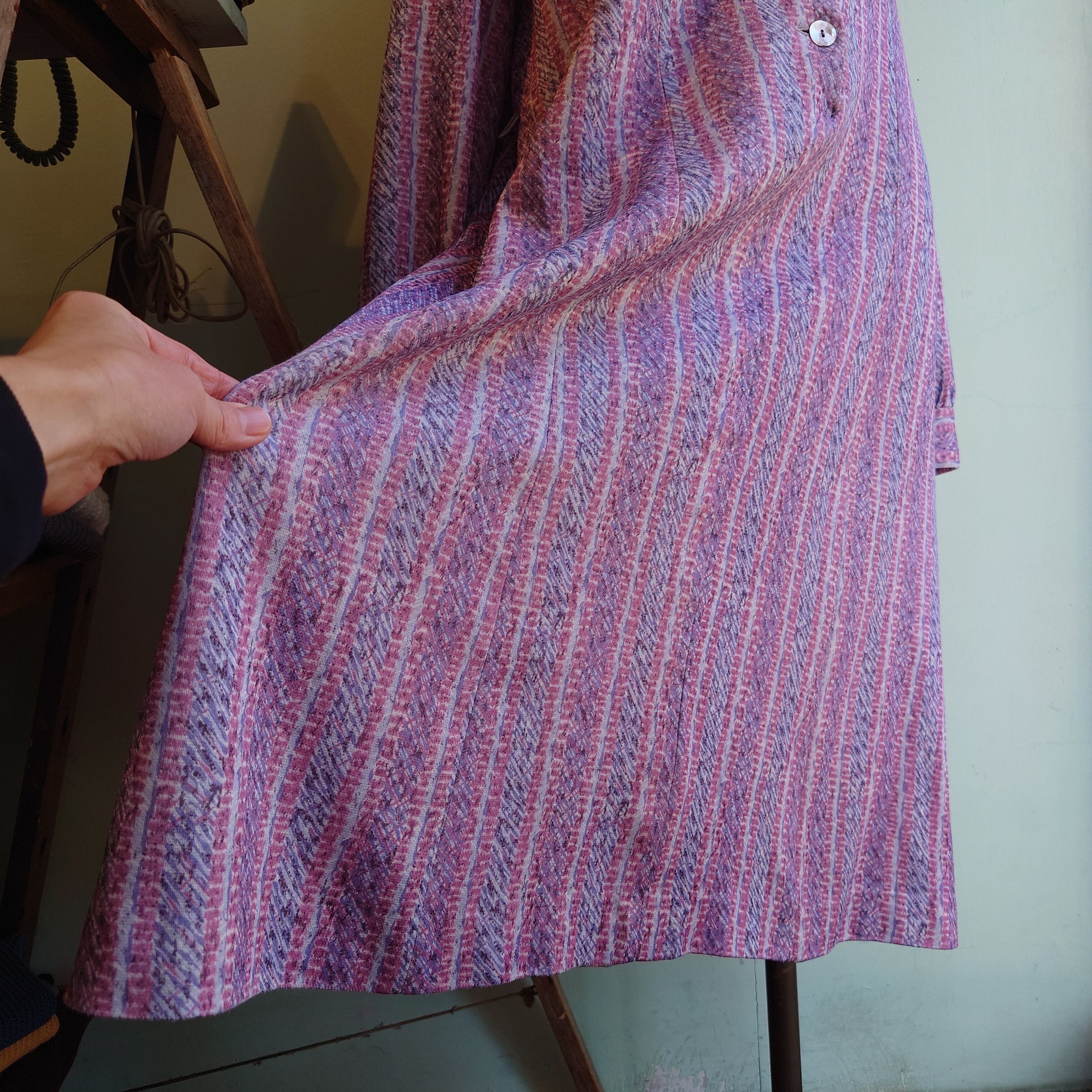 赤から紫にグラデーションする、独特なタッチのストライプが美しいヴィンテージドレス。ほんのりふんわり感があるスタプレ素材と、ストンと落ちて裾にかけてフレアするレトロフューチャーなシルエット。取り外し可能なベルトで絞れば、また違ったヴィンテージスタイルにも。